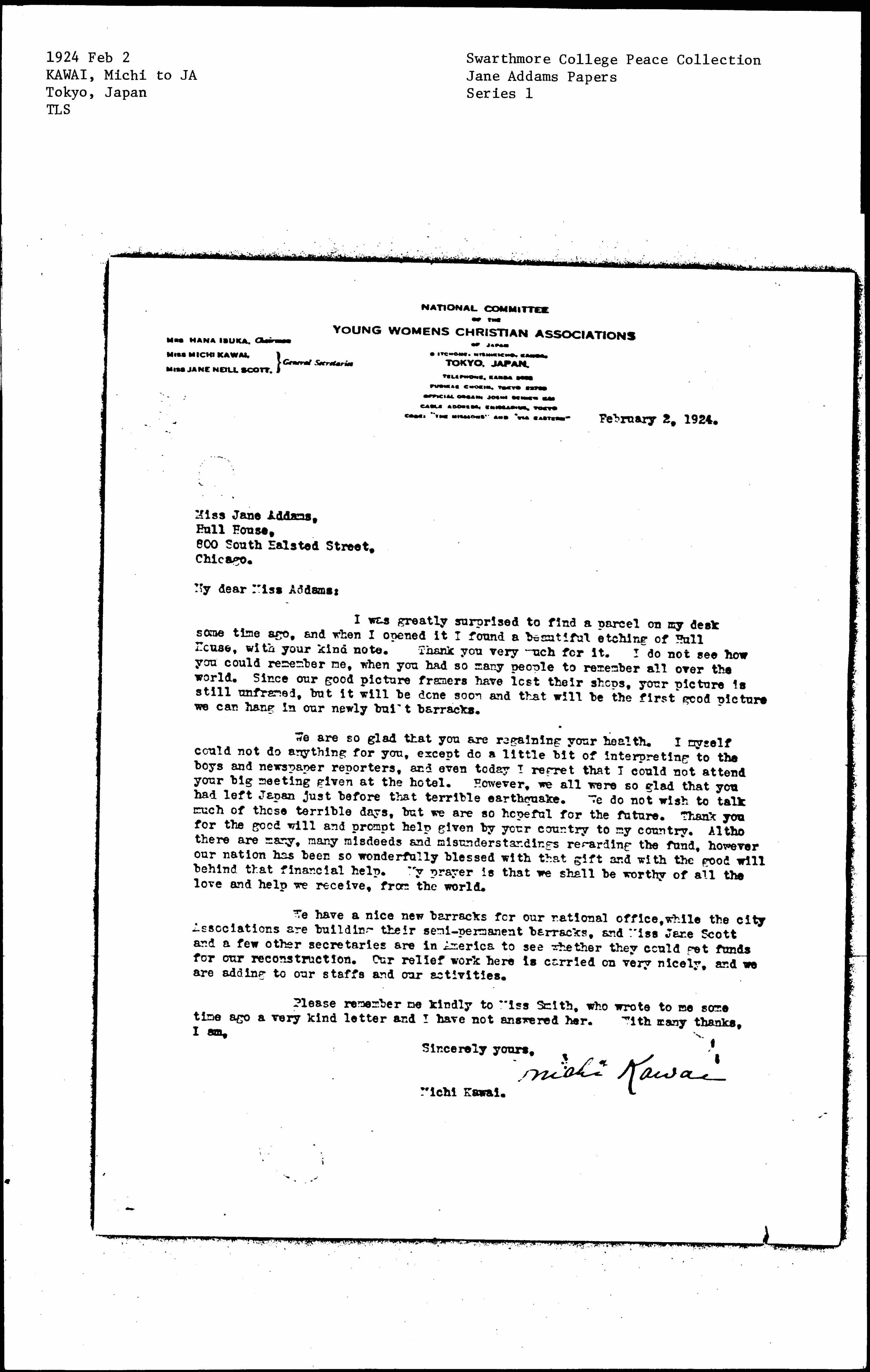 We are so glad that you are regaining your health. I myself could not do anything for you, except do a little bit of interpreting to the boys and newspaper reporters, and even today I regret that I could not attend your big meeting given at the hotel. However, we all were so glad that you had left Japan just before that terrible earthquake. We do not wish to talk much of those terrible days, but we are so hopeful for the future. Thank you for the good will and prompt help given by your country to my country. [Although] there are many, many misdeeds and misunderstandings regarding the fund, however our nation has been so wonderfully blessed with that gift and with the good will behind that financial help. My prayer is that we shall be worthy of all the love and help we receive, from the world.