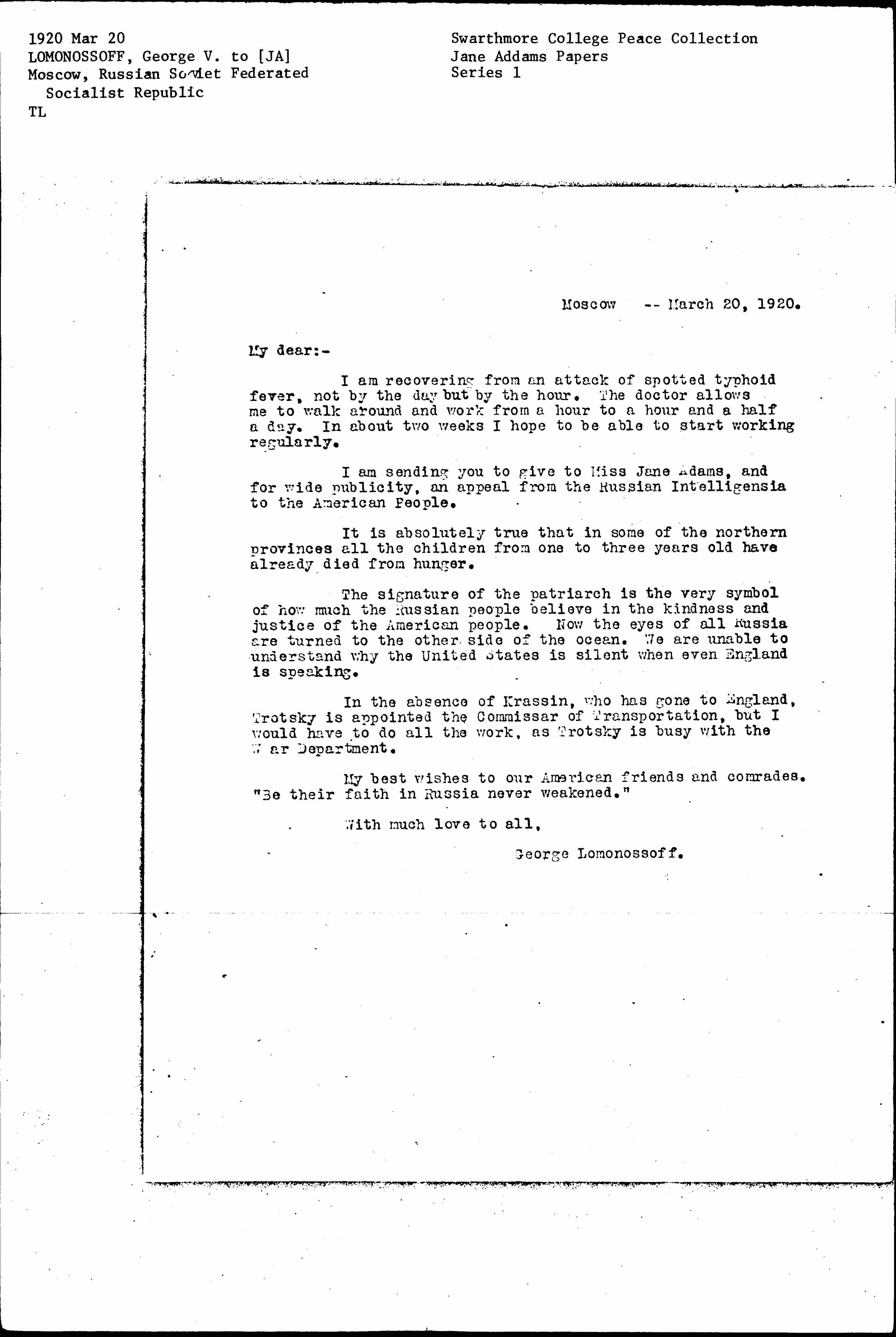 I am sending you to give to Miss Jane [Addams], and for wide publicity, an appeal from the Russian Intelligensia to the American People.