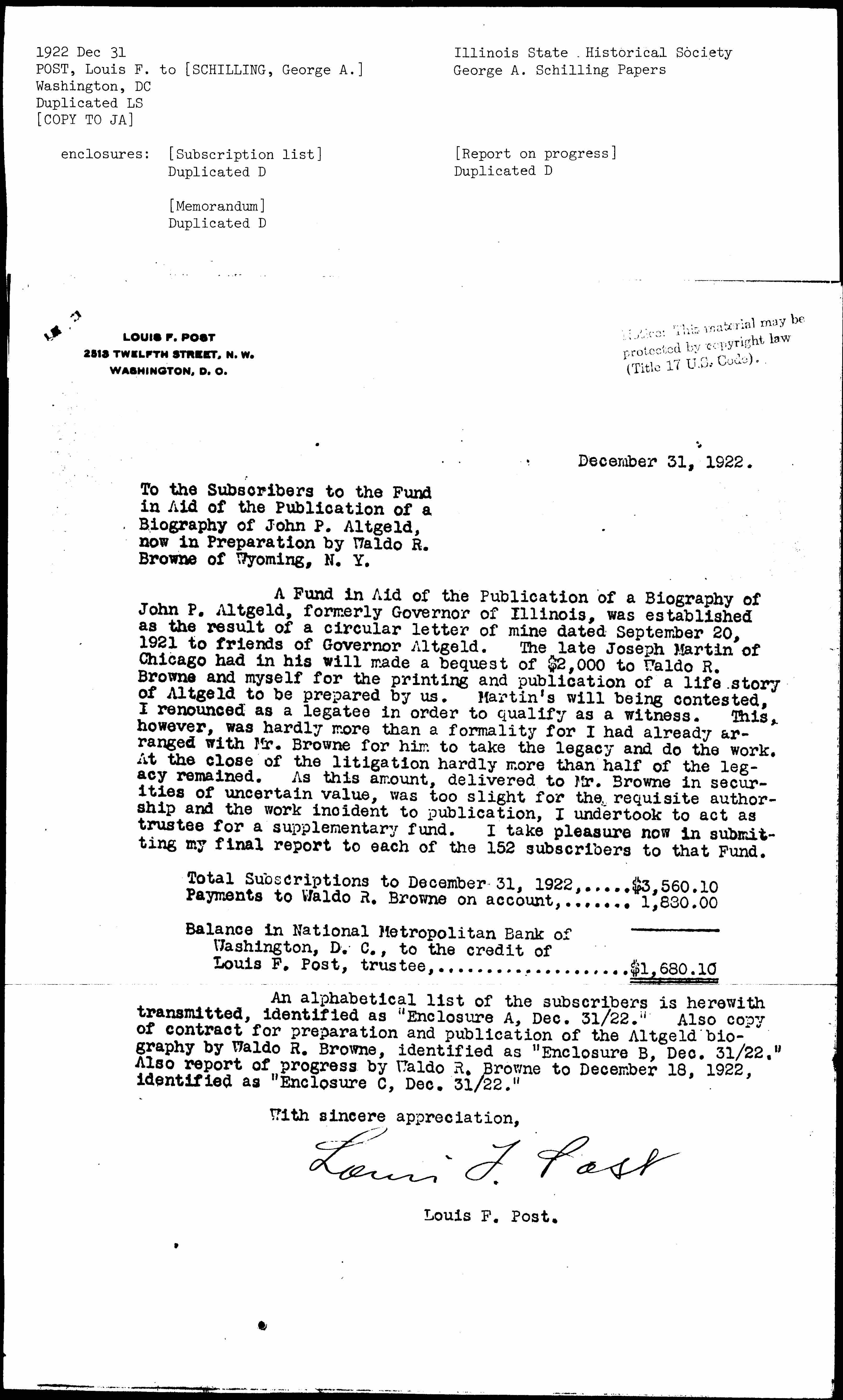 An alphabetical list of the subscribers is herewith transmitted, identified as "Enclosure A, Dec. 31/22." Also copy of contract for preparation and publication of the Altgeld biography by Waldo R. Browne, identified as "Enclosure B, Dec. 31/22." Also report of progress by Waldo R. Browne to December 18, 1922, identified as "Enclosure C, Dec. 31/22."