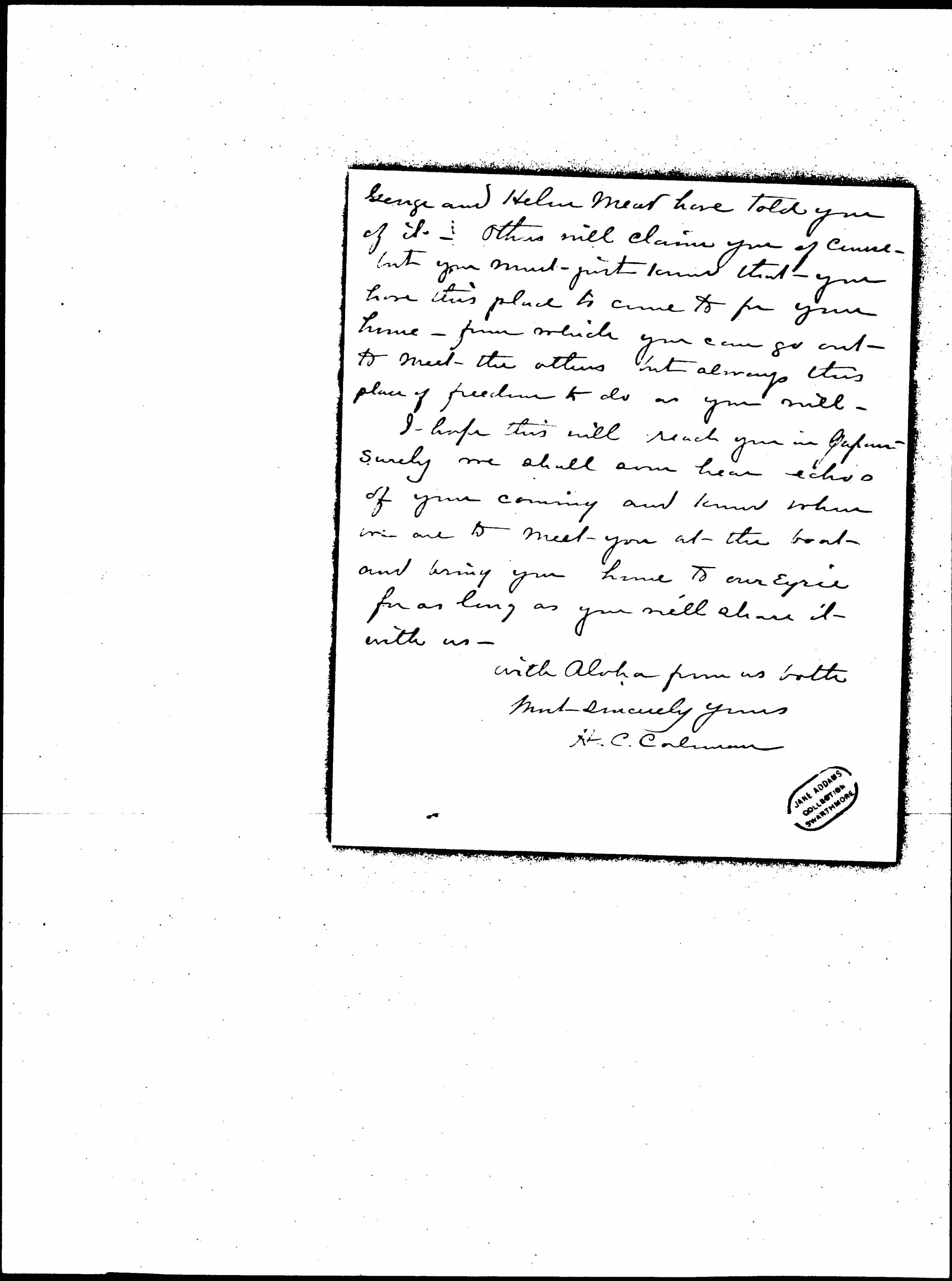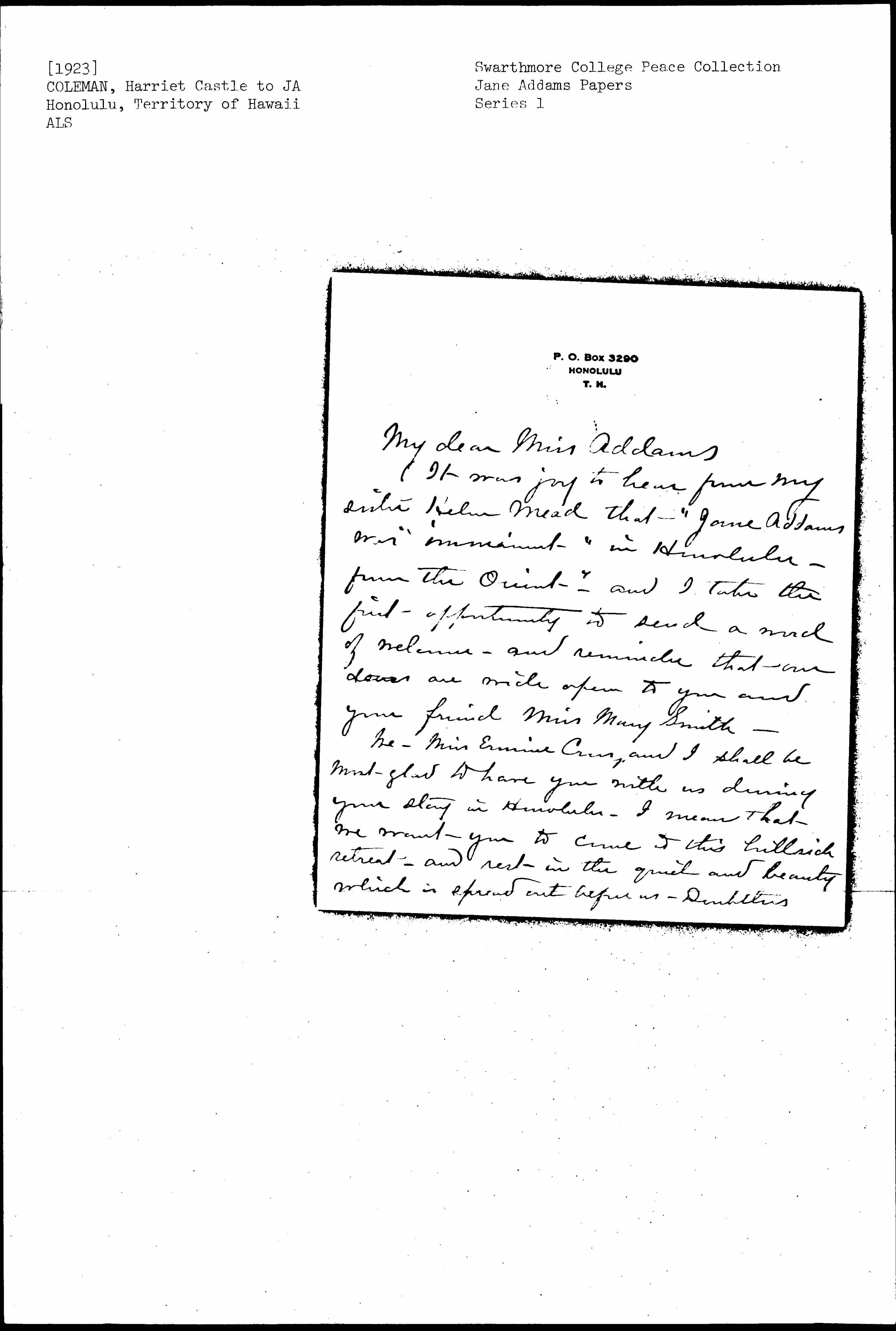 It was joy to hear from my sister Helen Mead that -- "Jane Addams was imminent in Honolulu -- from the Orient" -- and I take the first opportunity to send a word of welcome -- and reminder that our doors are wide open to you and your friend Miss Mary Smith.