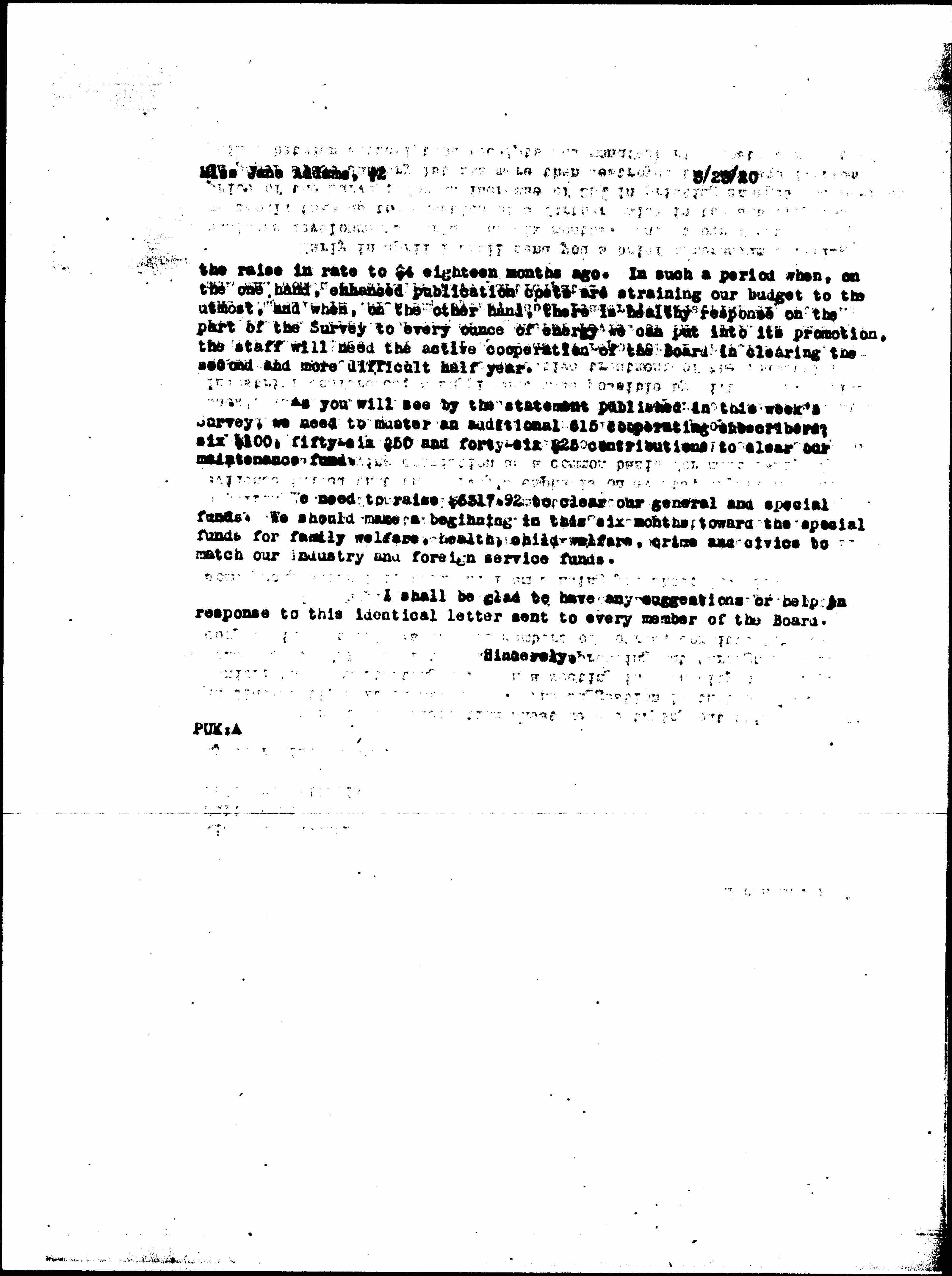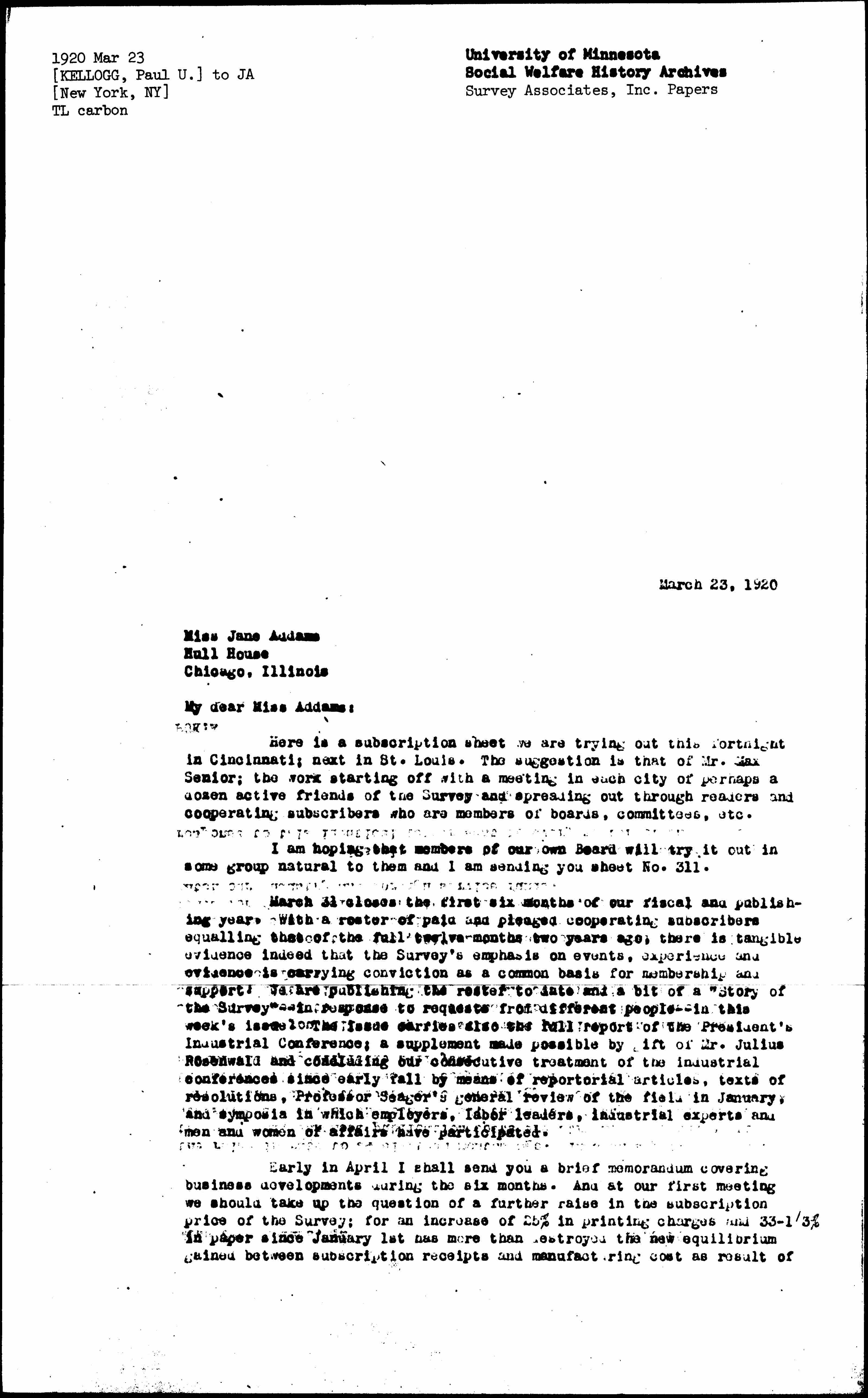 Early in April I shall send you a brief memorandum covering business developments during the six months. And at our first meeting we should take up the question of a further raise in the subscription price of the Survey; for an increase of 25% in printing charges and 33-1/3% in paper since January 1st has more than destroyed the new equilibrium gained between subscription receipts and manufacturing cost as result of [page 2] the raise in rate to $4 eighteen months ago. In such a period when, on the one hand, enhanced publication costs are straining our budget to the utmost, and when, on the other hand, there is healthy response on the part of The Survey to every ounce of energy we can put into its promotion, the staff will need the active cooperation of the Board in clearing the second and more difficult half year.