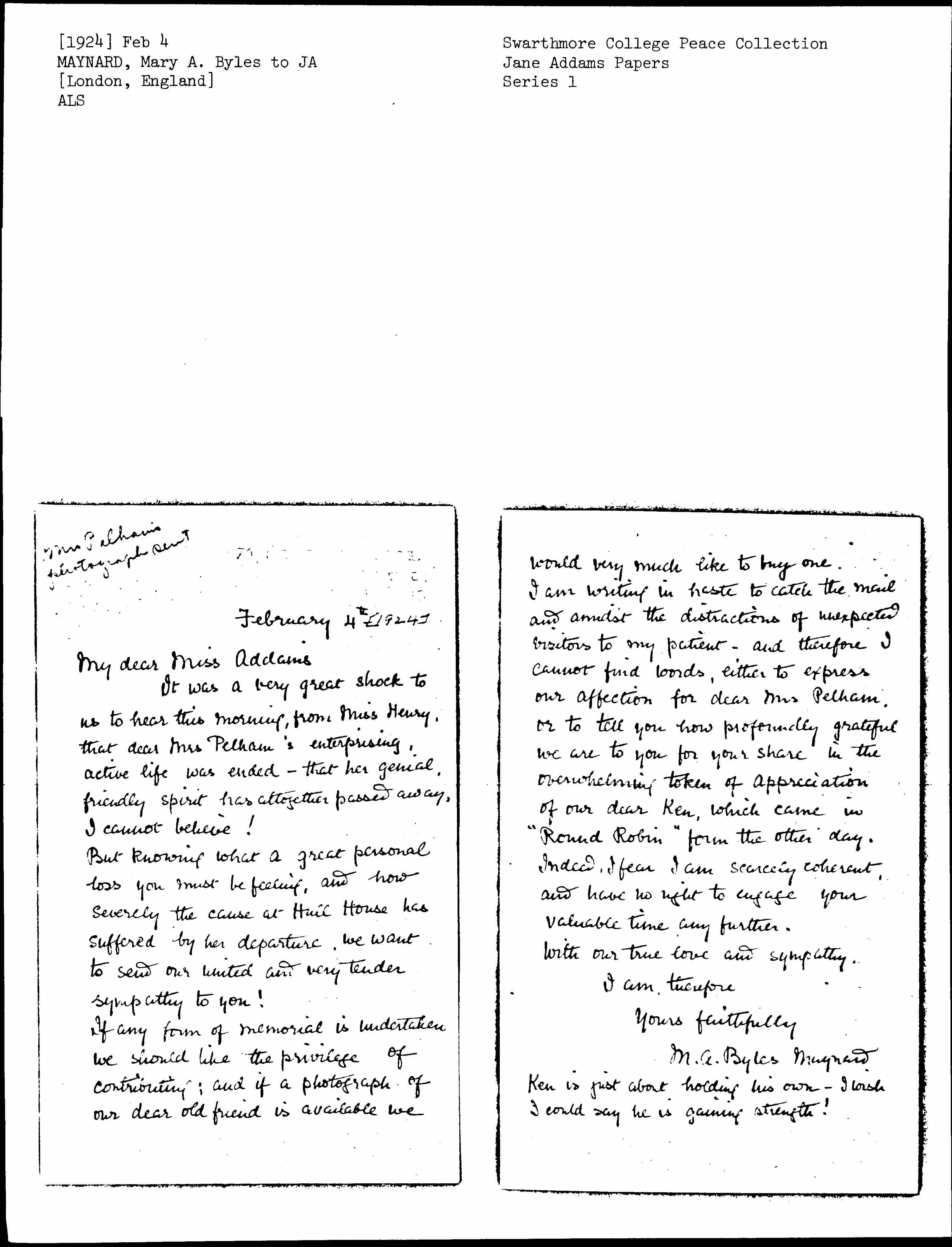 I am writing in haste to catch the mail and amidst the distractions of unexpected visitors to my patient -- and therefore I cannot find words, either to express our affection for dear Mrs Pelham, or to tell you how profoundly grateful we are to you for your share in the overwhelming token of appreciation of our dear Ken, which came in "Round Robin" form the other day. Indeed, I fear I am scarcely coherent, and have no right to engage your valuable time any further.
