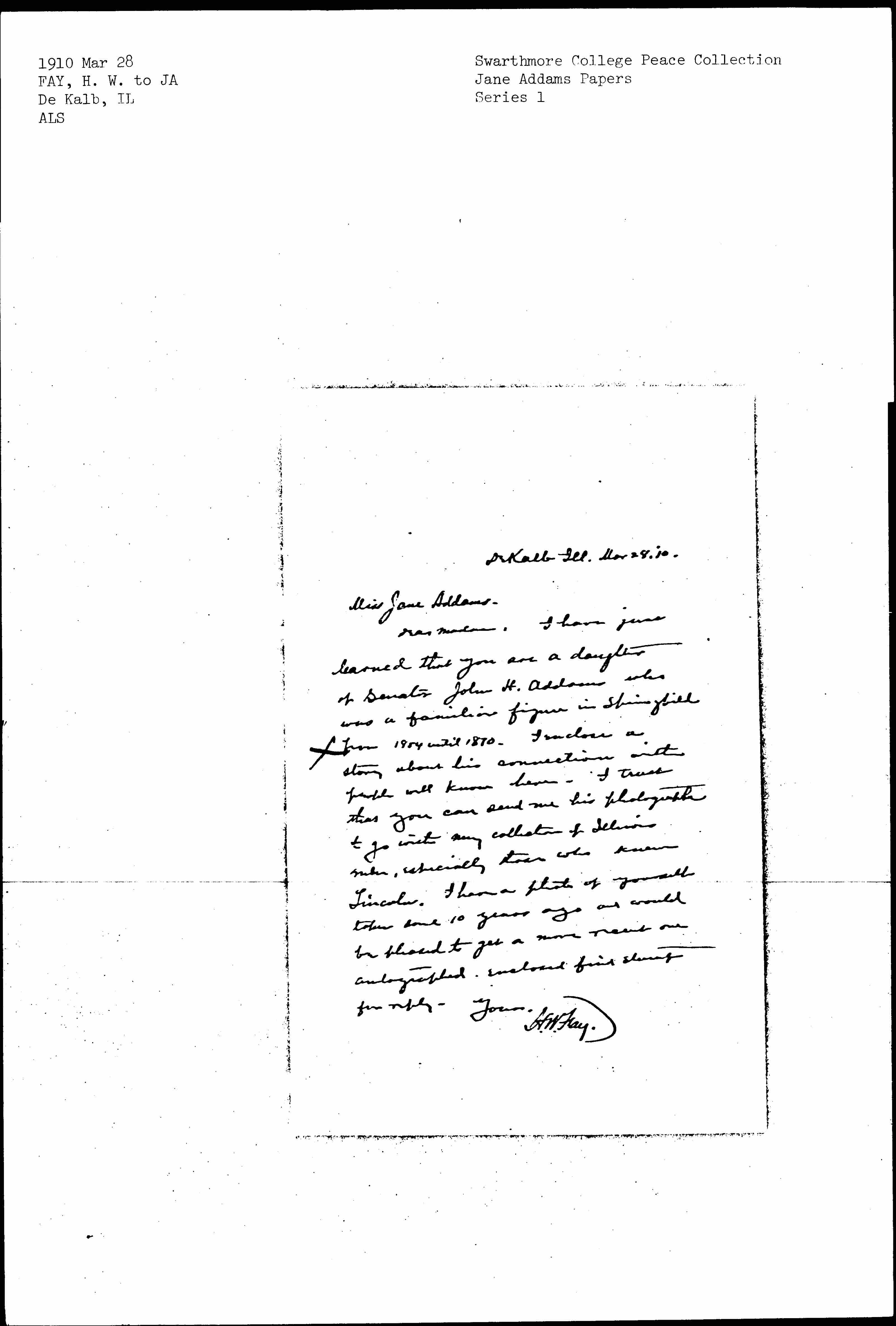 Dear Madam. I have just learned that you are a daughter of Senator John H. Addams who was a familiar figure in Springfield from 1854 until 1870. I enclose a story about his connection with people well known here. I trust that you can send me his photograph to go with my collection of Illinois men, especially those who knew Lincoln. I have a photo of yourself taken some 10 years ago and would be pleased to get a more recent one autographed. Enclosed find stamp for reply.
