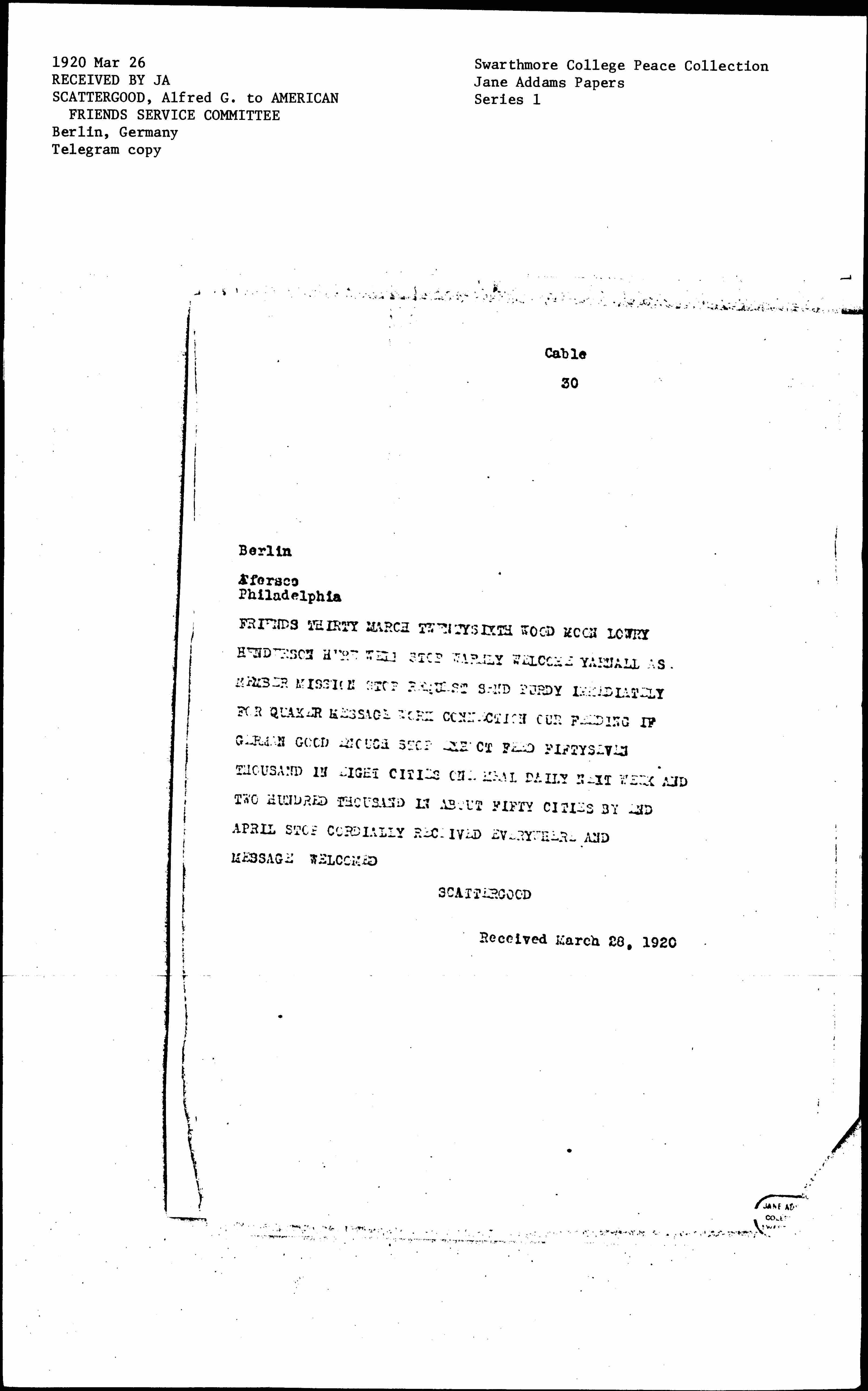 FRIENDS THIRTY MARCH TWENTYSIXTH WOOD MOON LOWRY HENDERSON HERE WELL. WARMLY WELCOME YARNALL AS MEMBER MISSION. REQUEST SEND PURDY IMMEDIATELY FOR QUAKER MESSAGE WORK CONNECTION OUR FUNDING IF GERMAN GOOD ENOUGH. [EXPECT] FEED FIFTYSEVEN THOUSAND IN EIGHT CITIES ONE MEAL DAILY NEXT WEEK AND TWO HUNDRED THOUSAND IN ABOUT FIFTY CITIES BY END APRIL. CORDIALLY RECEIVED EVERYWHERE AND MESSAGE WELCOMED