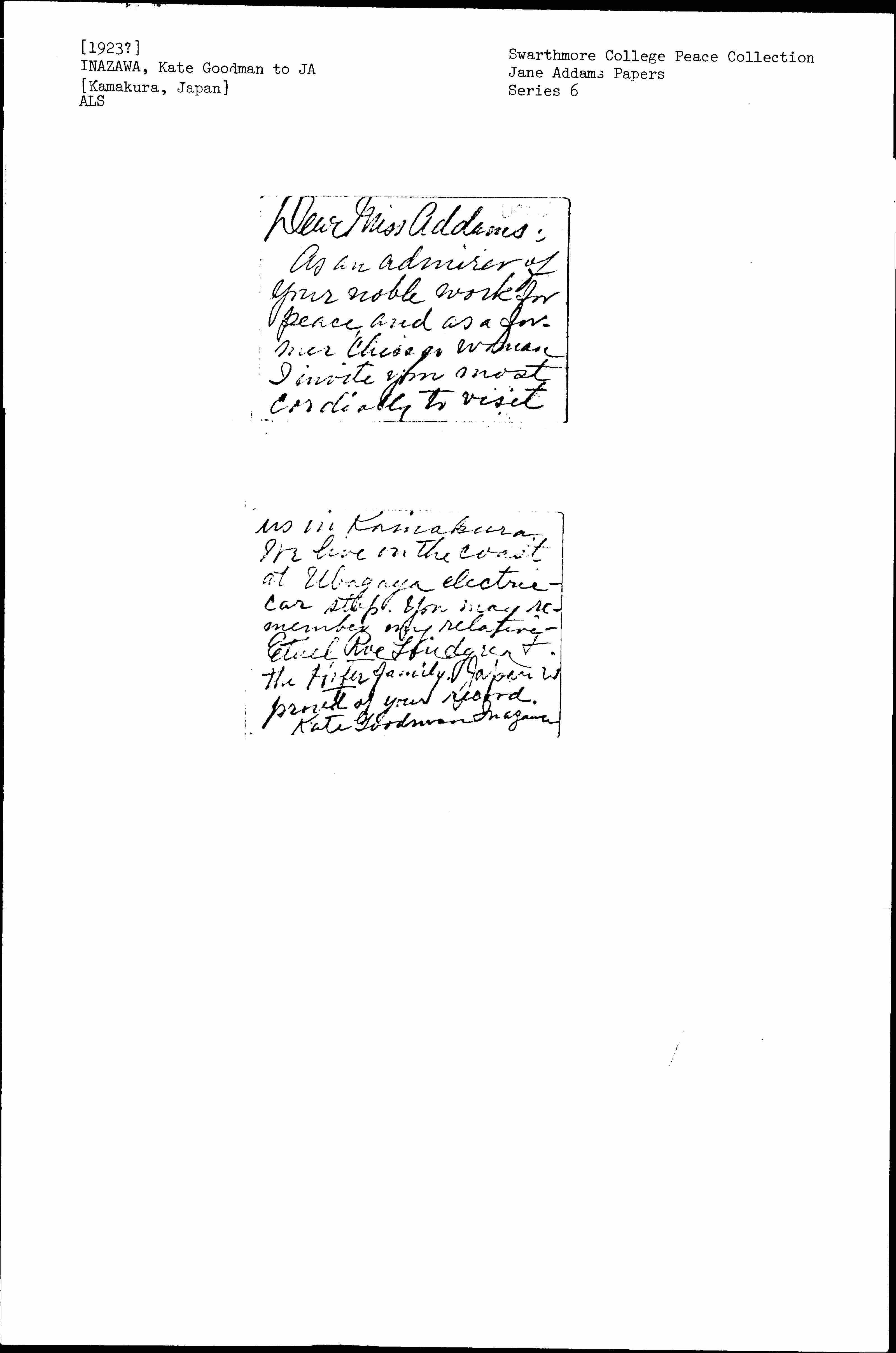 As an admirer of your noble work for peace, and as a former Chicago woman I invite you most cordially to visit [page 2] us in Kamakura. We live on the coast at Ubagaya electric-car stop. You may remember my relative Ethel Roe Lundgren & the [Hofer] family. Japan is proud of your record.