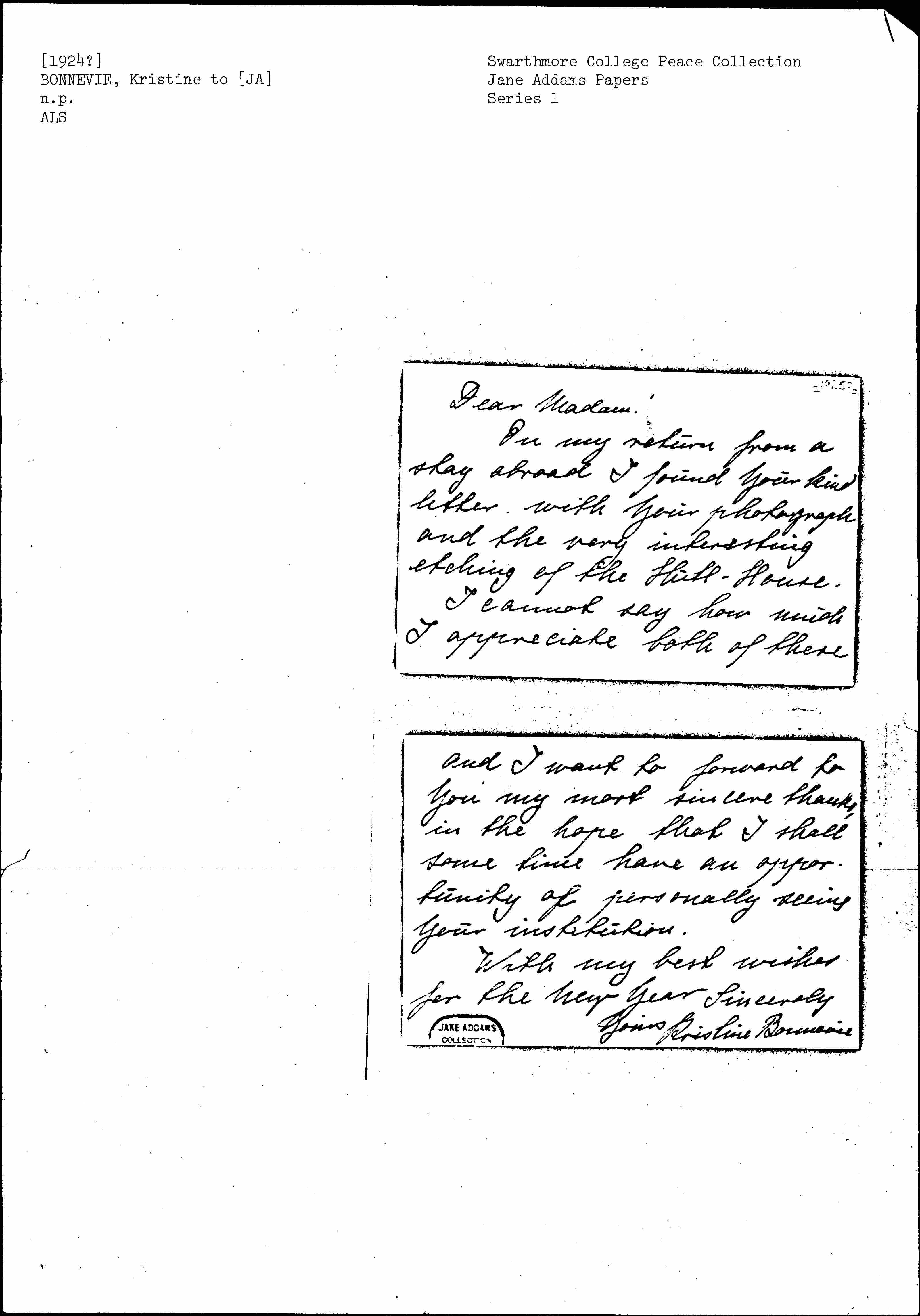 On my return from a stay abroad I found your kind letter with your photograph and the very interesting etching of the Hull-House.