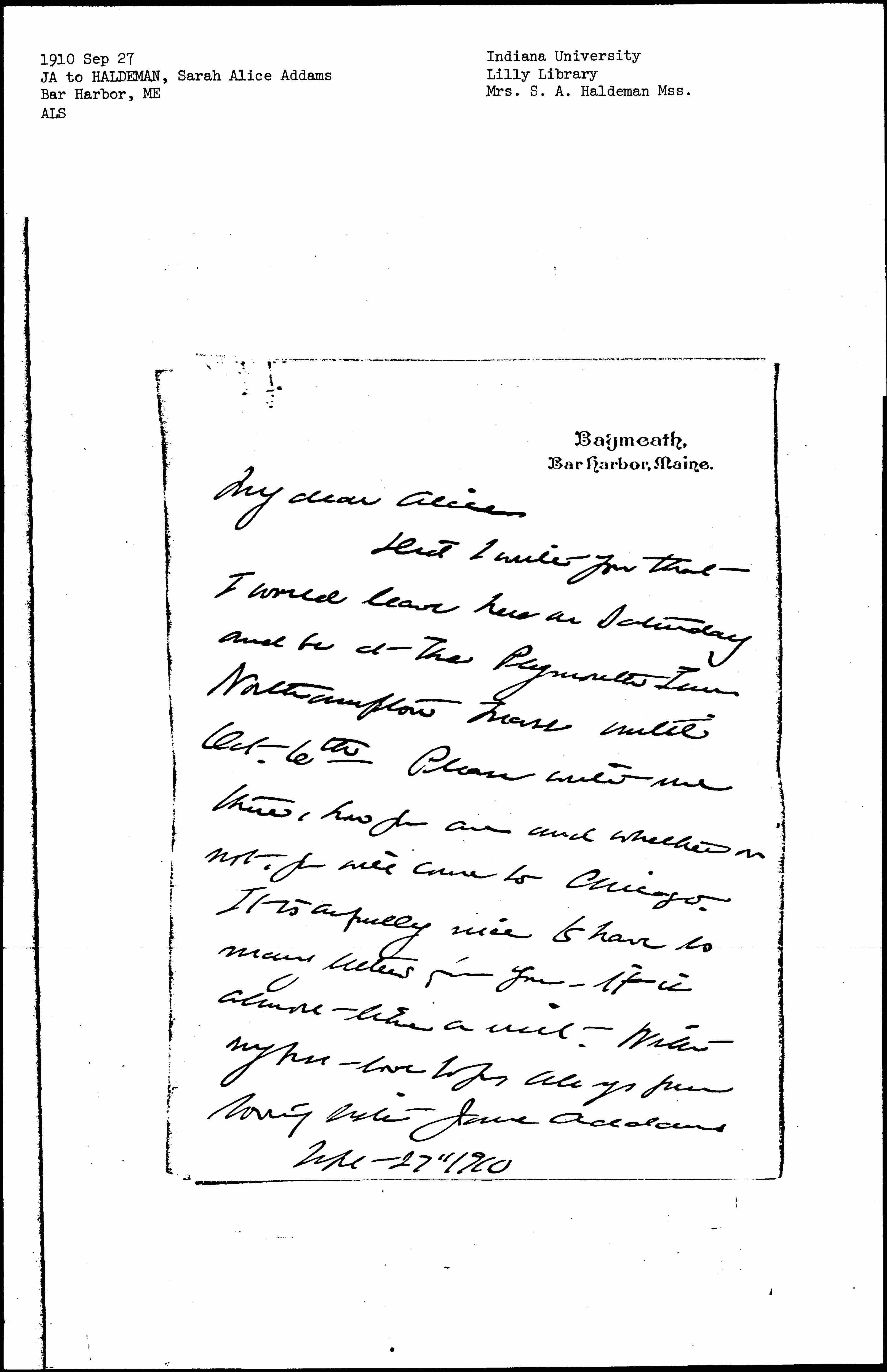 Did I write you that I would leave here on Saturday and be at The Plymouth Inn Northampton Mass until Oct. 6th. Please write me there, how you are and whether or not you will come to Chicago. It is awfully nice to have so many letters from you -- it is almost like a visit. With my best love to you always your loving sister Jane Addams