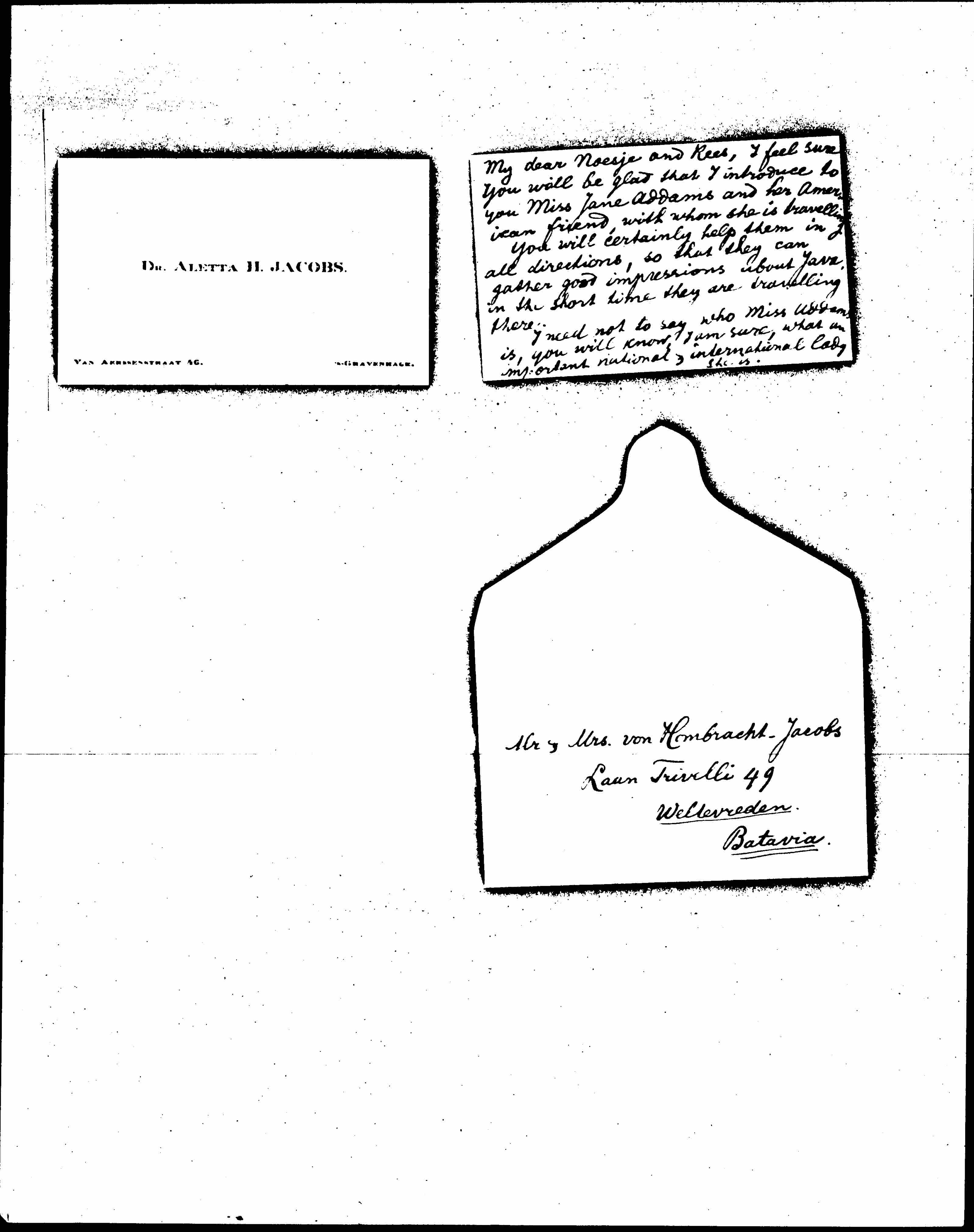 My dear Noesje and Rees, I feel sure you will be glad that I introduce to you Miss Jane Addams and her American friend, with whom she is [traveling].