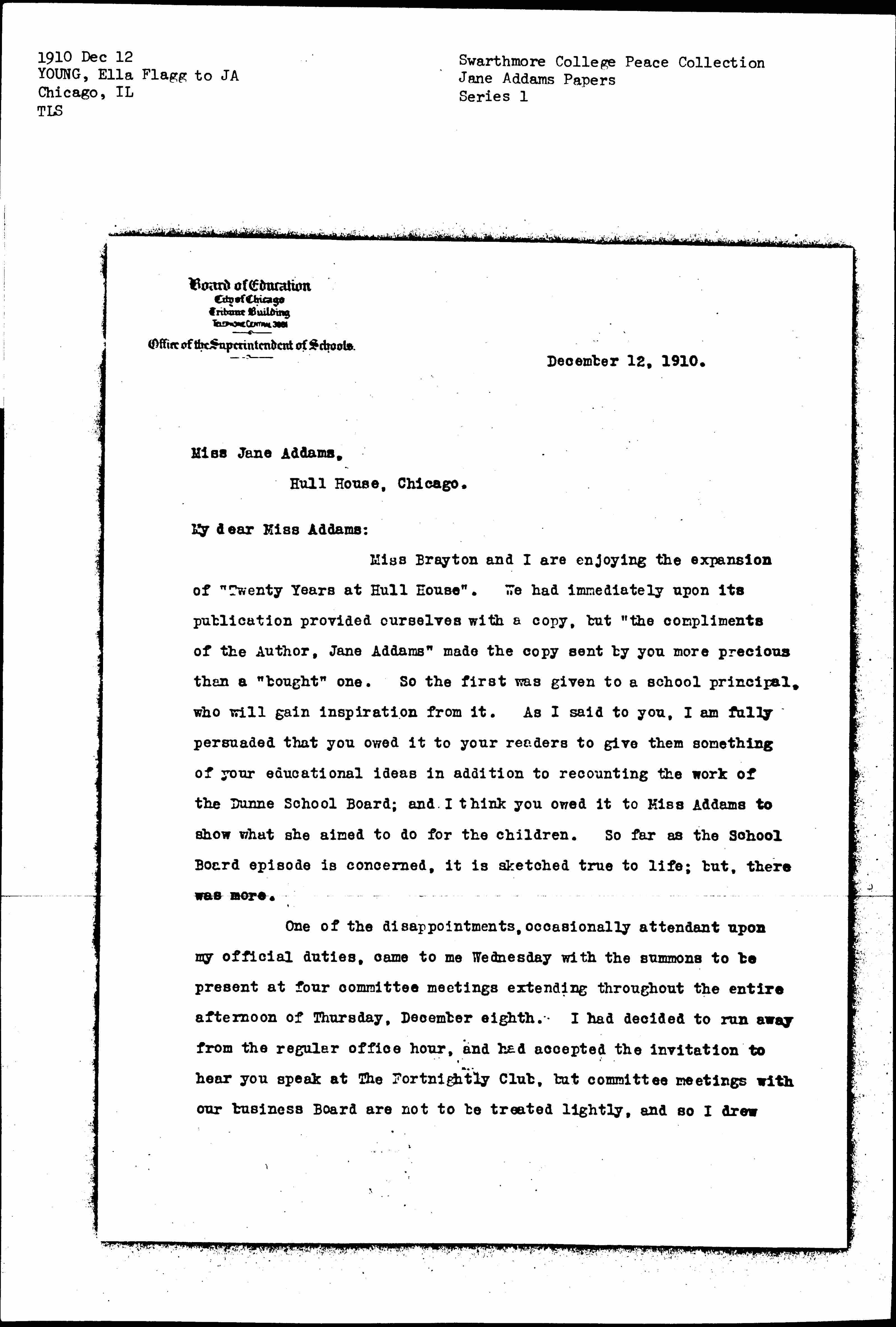 Miss Brayton and I are enjoying the expansion of "Twenty Years at Hull House". We had immediately upon its publication provided ourselves with a copy, but "the compliments of the Author, Jane Addams" made the copy sent by you more precious than a "bought" one. So the first was given to a school principal, who will gain inspiration from it. As I said to you, I am fully persuaded that you owed it to your readers to give them something of your educational ideas in addition to recounting the work of the Dunne School Board; and I think you owed it to Miss Addams to show what she aimed to do for children. So far as the School Board episode is concerned, it is sketched true to life; but, there was more.
