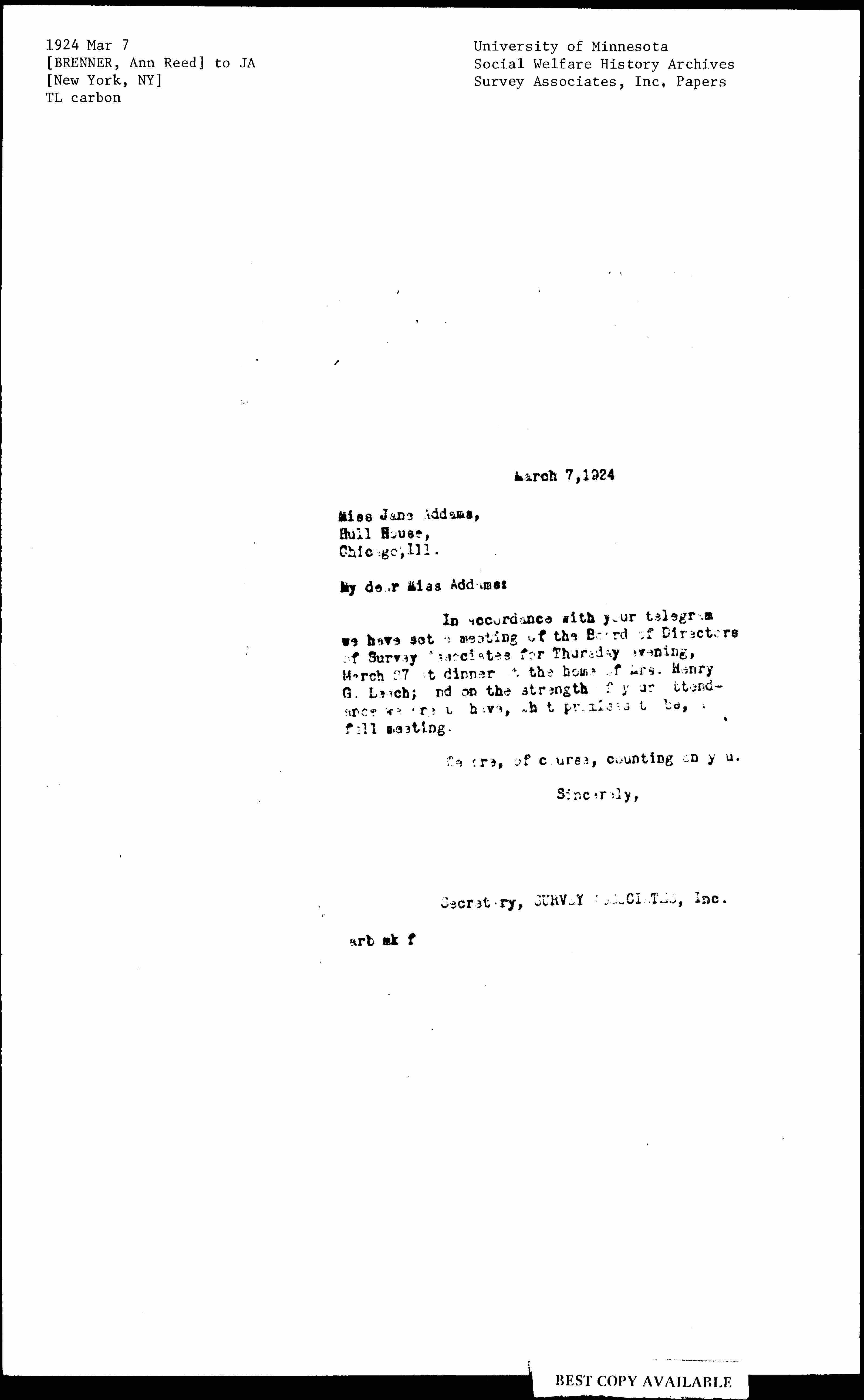 In accordance with your telegram we have set a meeting of the Board of Directors of Survey Associates for Thursday evening, March 27 at dinner [at] the home of Mrs. Henry G. Leach; [and] on the strength [of your] attendance we are [to] have, [what promises to] be, [a] full meeting.