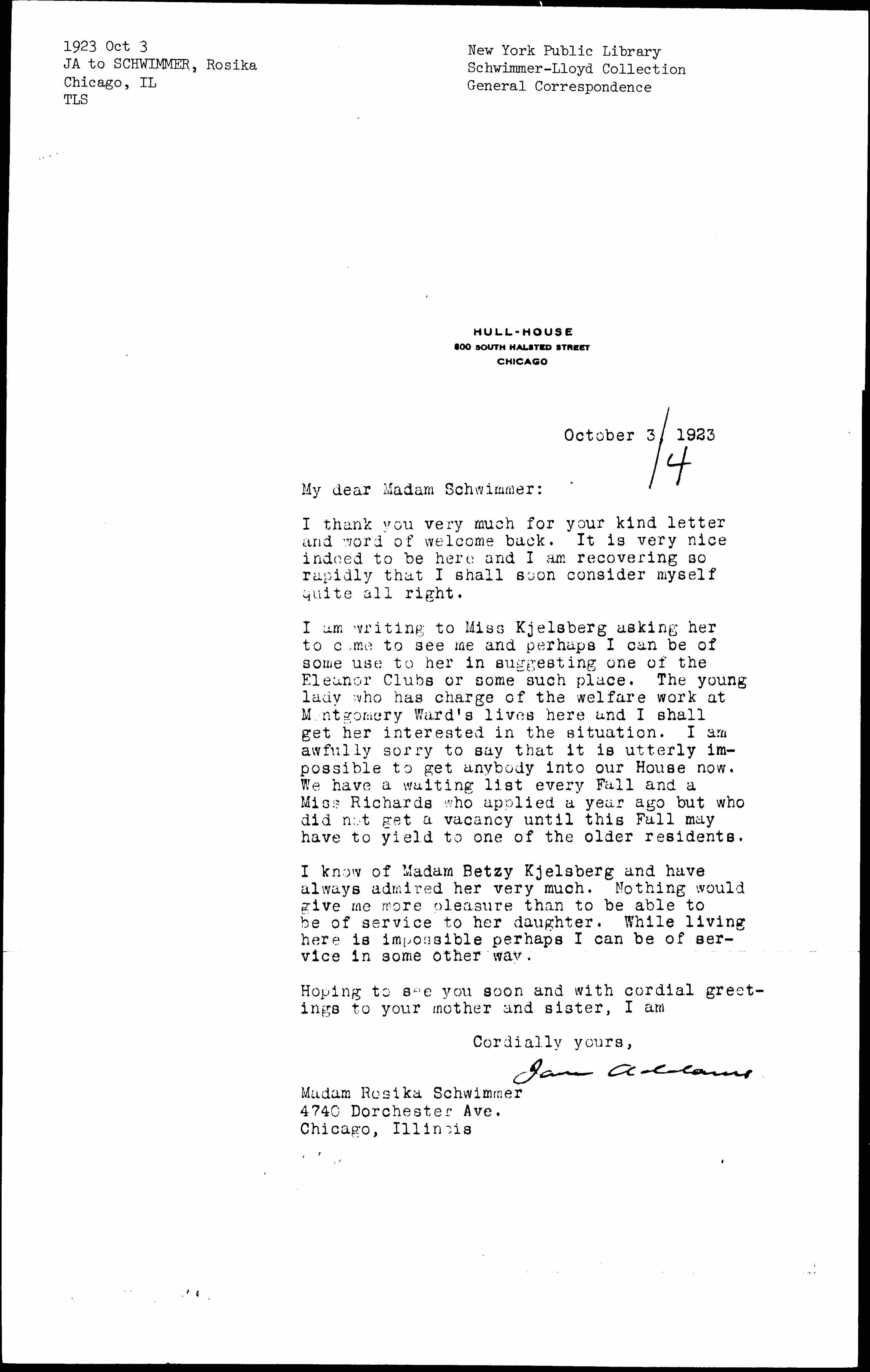 I am writing to Miss Kjelsberg asking her to come to see me and perhaps I can be of some use to her in suggesting one of the Eleanor Clubs or some such place. The young lady who has charge of the welfare work at Montgomery Ward's lives here and I shall get her interested in the situation. I am awfully sorry to say that it is utterly impossible to get anybody into our House now. We have a waiting list every Fall and a Miss Richards who applied a year ago but who did not get a vacancy until this Fall may have to yield to one of the older residents.