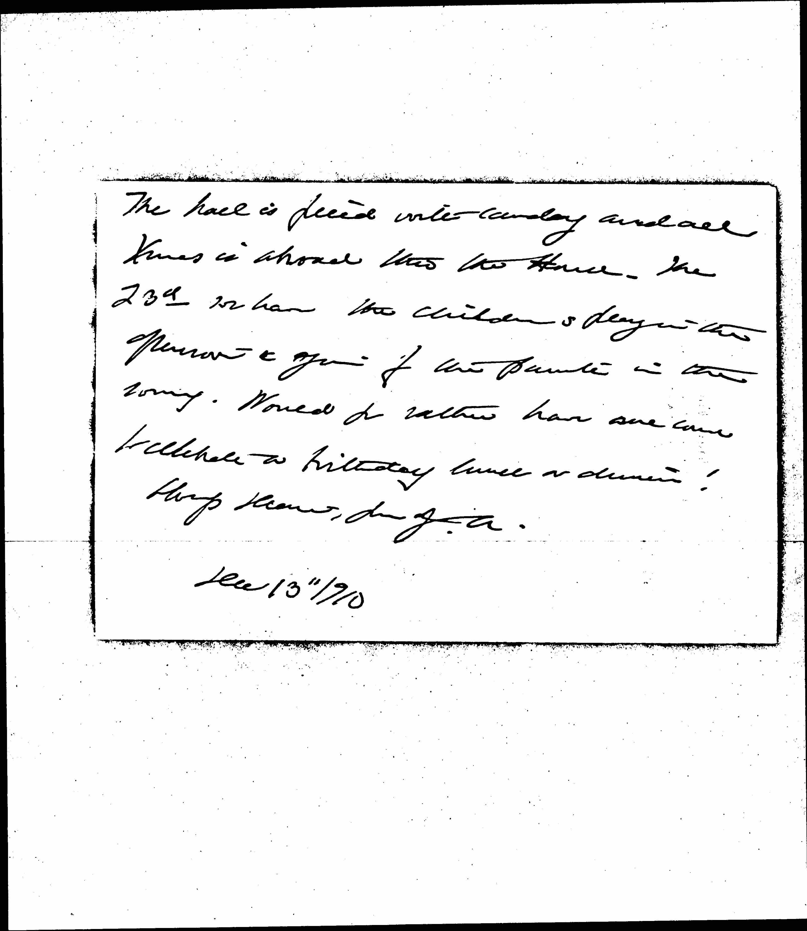 The hall is filled with candy and all Xmas is abroad [through] the House. The 23d we have the childrens play in the afternoon & again for the parents in the evening. Would you rather have one come to celebrate a birthday lunch or dinner?