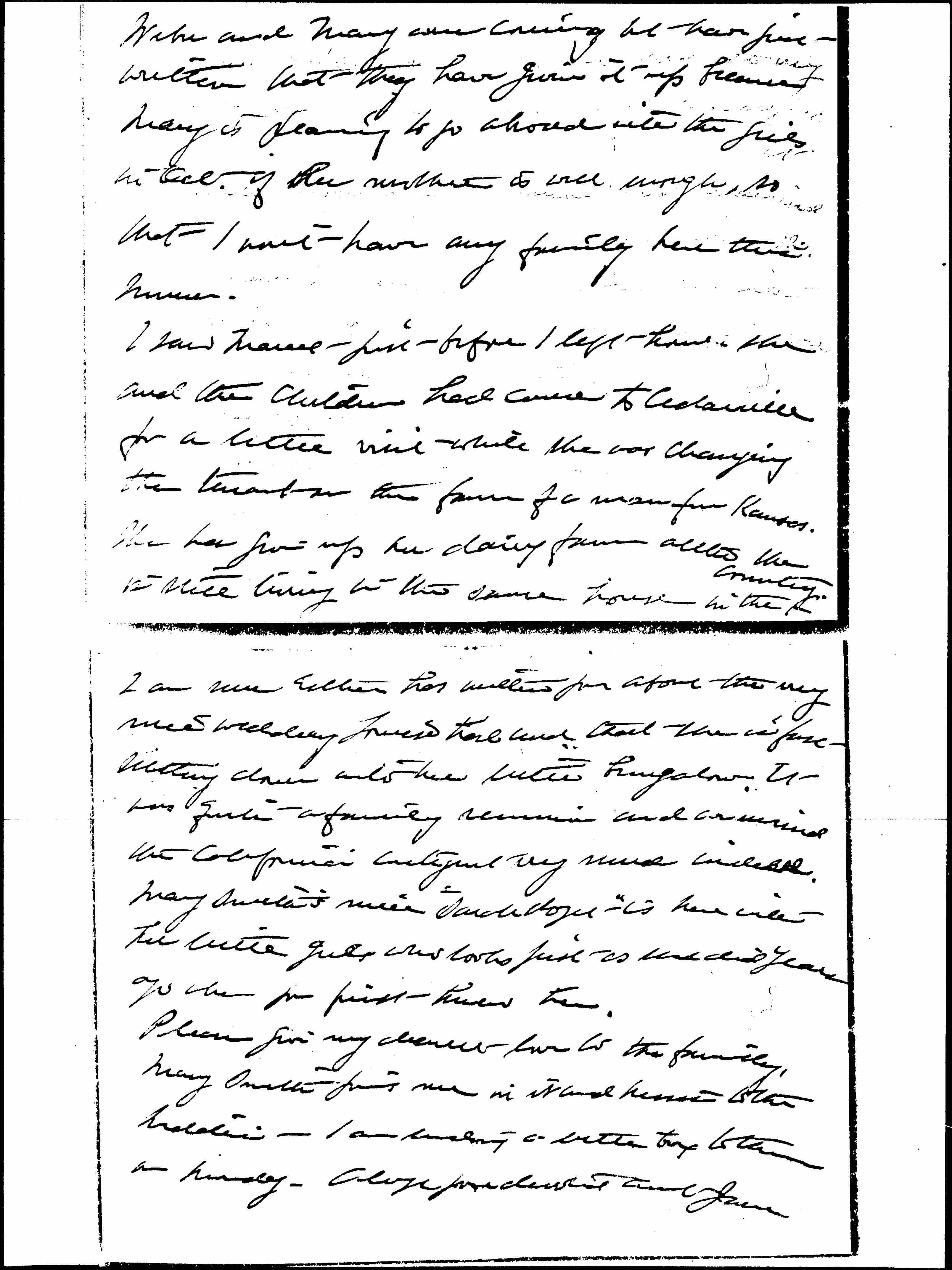 I saw Marcet just before I left home -- she and the children had come to Cedarville for a little visit while she was changing the tenant on the farm for a man from Kansas. She has given up her dairy farm [although] she is still living in the same house in the ↑country.↓ [page 4]