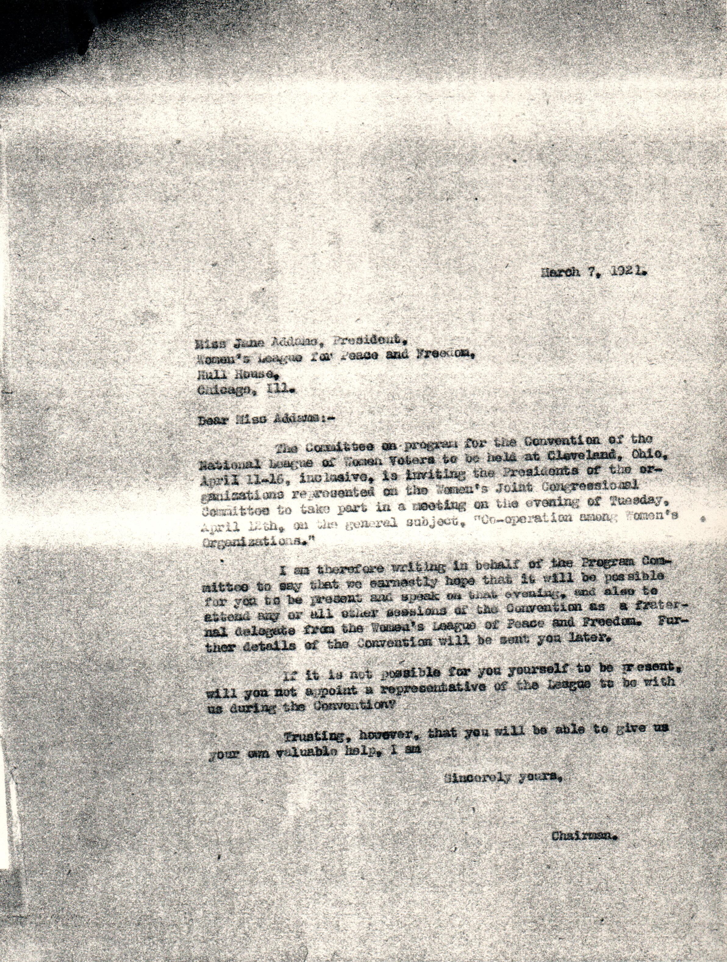 I am therefore writing in behalf of the Program Committee to say that we earnestly hope that it will be possible for you to be present and speak on that evening, and also to attend any or all other sessions of the Convention as a fraternal delegate from the Women's League of Peace and Freedom. Further details of the Convention will be sent you later.