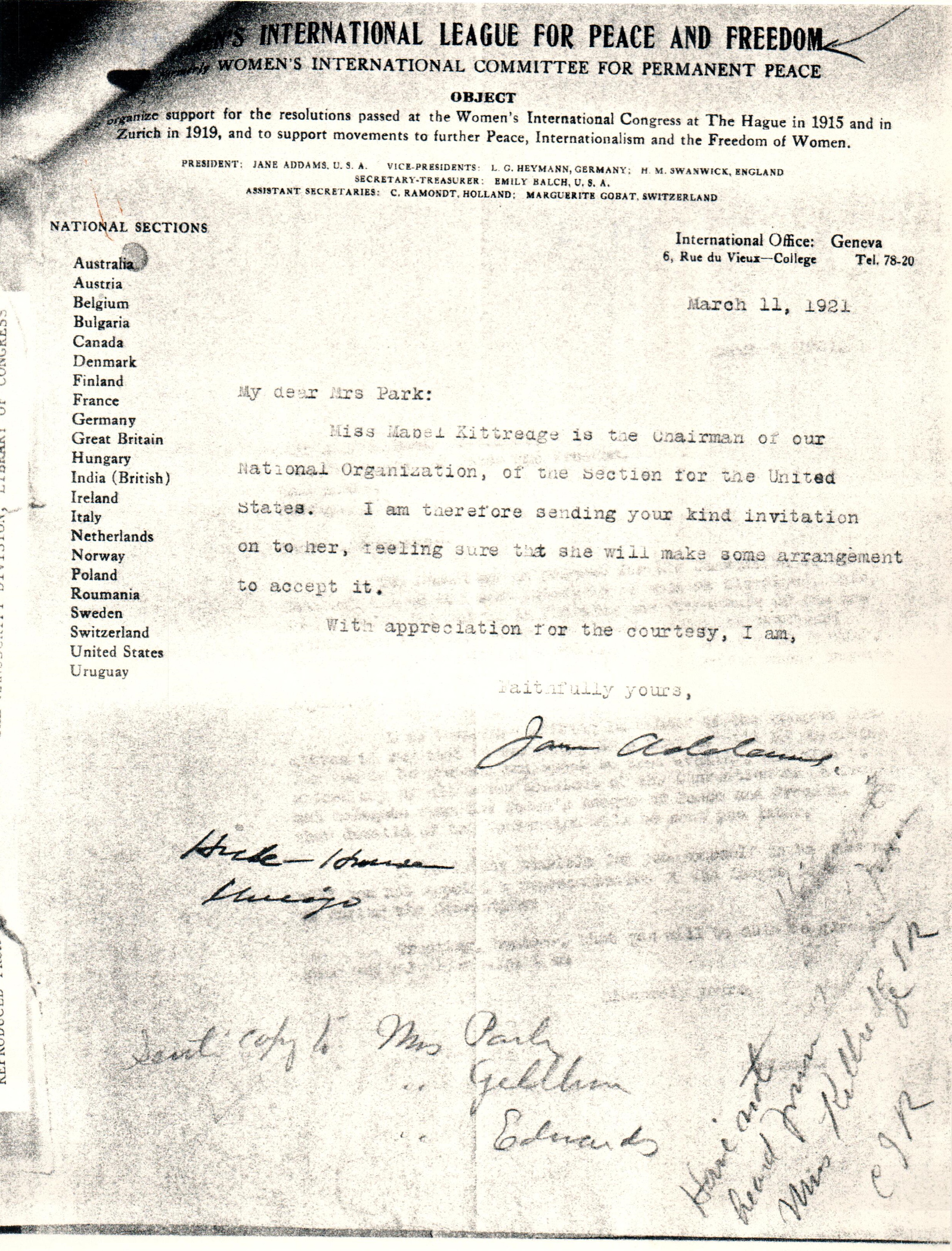 Miss Mabel Kittredge is the Chairman of our National Orgaization, of the Section for the United States. I am therefore sending your kind invitation on to her, feeling sure that she will make some arrangement to accept it.