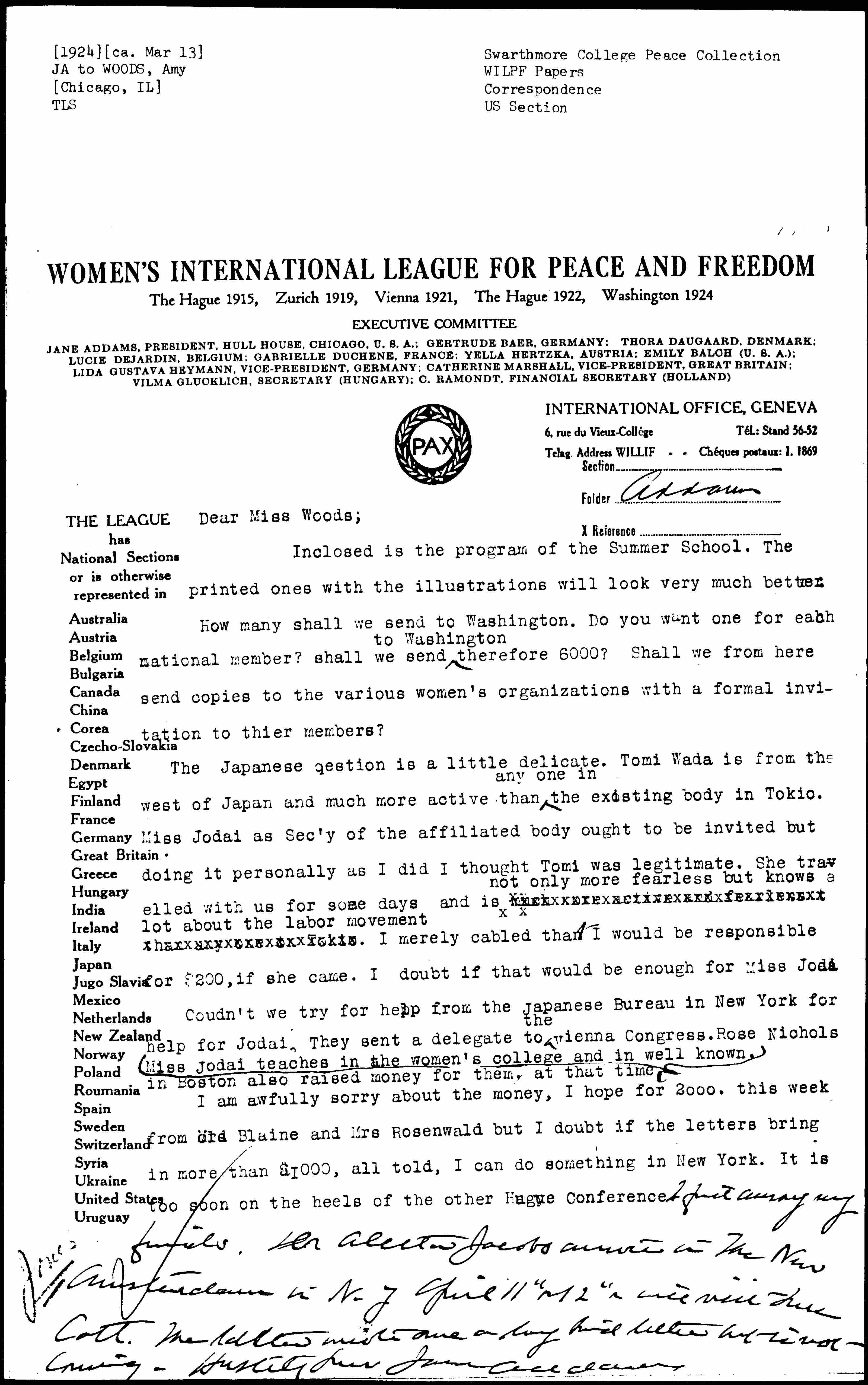 The Japanese [question] is a little delicate. Tomi Wada is from the west of Japan and much more active than ↑any one in↓ the existing body in [Tokyo]. Miss Jōdai as Sec'y of the affiliated body ought to be invited but doing it personally as I did I thought Tomi was legitimate. She [traveled] with us for some days and is ↑not only more fearless but knows a lot about the labor movement↓ [illegible]. I merely cabled that I would be responsible for $200, if she came. I doubt if that would be enough for Miss [Jōdai]. Couldn't we try for help from the Japanese Bureau in New York for help for Jōdai? They sent a delegate to ↑the↓ Vienna Congress. Rose Nichols in Boston also raised money for them at that time. ↑Miss Jōdai teaches in the women's college and [is] well known.↓
