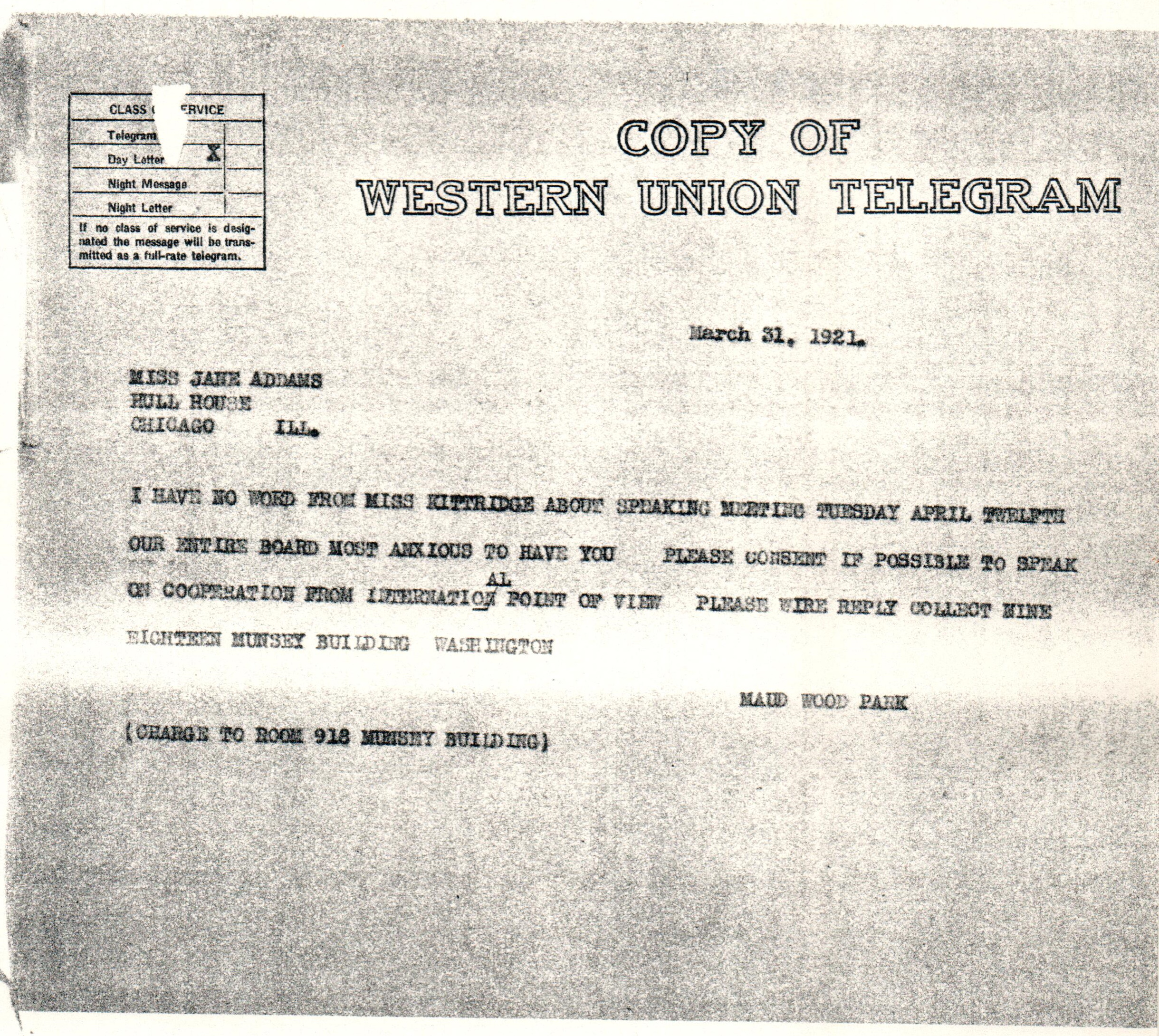I HAVE NO WORD FROM MISS KITTREDGE ABOUT SPEAKING MEETING TUESDAY APRIL TWELFTH OUR ENTIRE BOARD MOST ANXIOUS TO HAVE YOU. PLEASE CONSENT IF POSSIBLE TO SPEAK ON COOPERATION FROM INTERNATIONAL POINT OF VIEW. PLEASE WIRE REPLY COLLECT NINE EIGHTEEN MUNSEY BUILDING WASHINGTON
