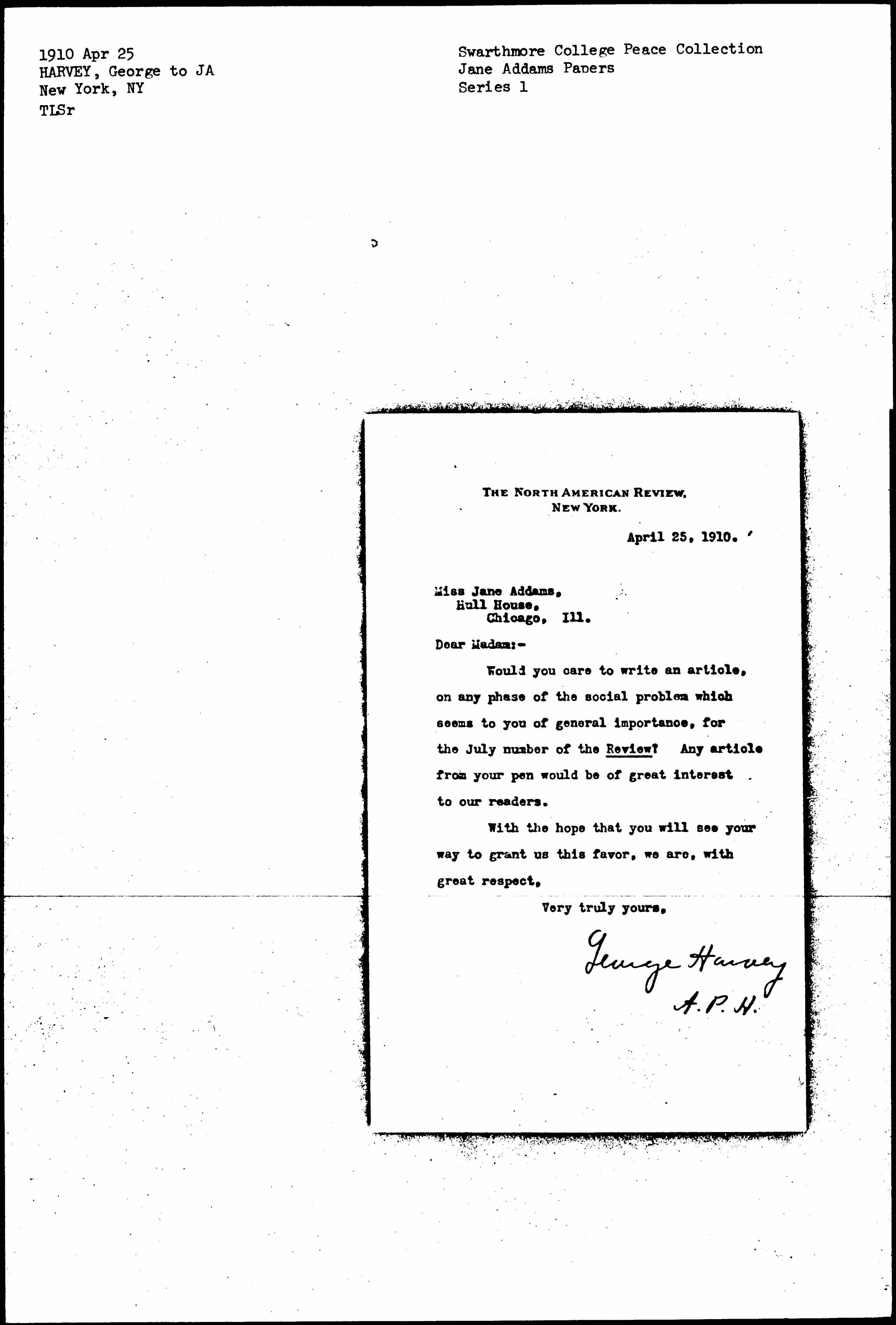 Would you care to write an article, on any phase of the social problem which seems to you of general importance, for the July number of the Review? Any article from your pen would be of great interest to our readers.