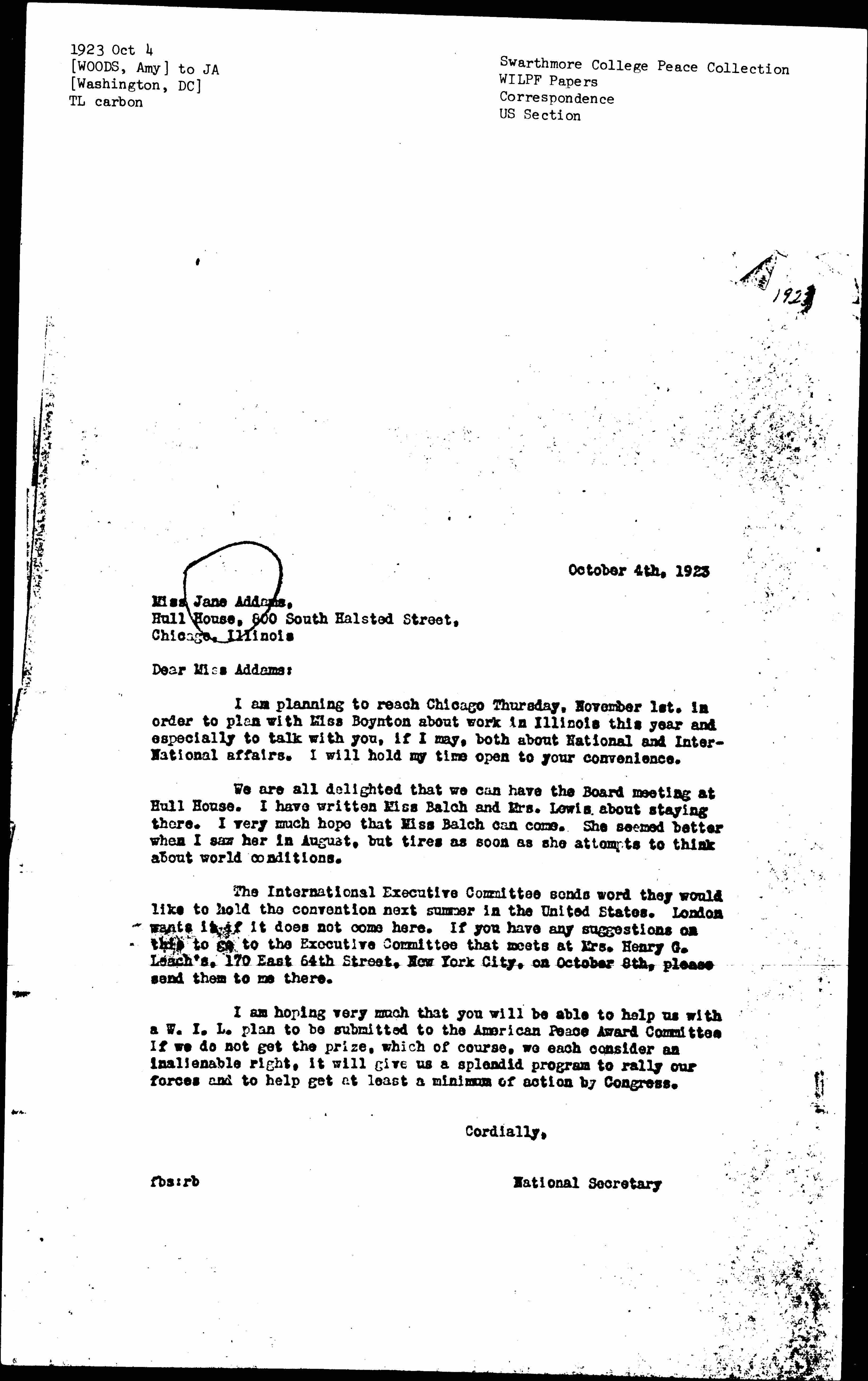 We are all delighted that we can have the Board meeting at Hull House. I have written Miss Balch and Mrs. Lewis about staying there. I very much hope that Miss Balch can come. She seemed better when I saw her in August, but tires as soon as she attempts to think about world conditions.