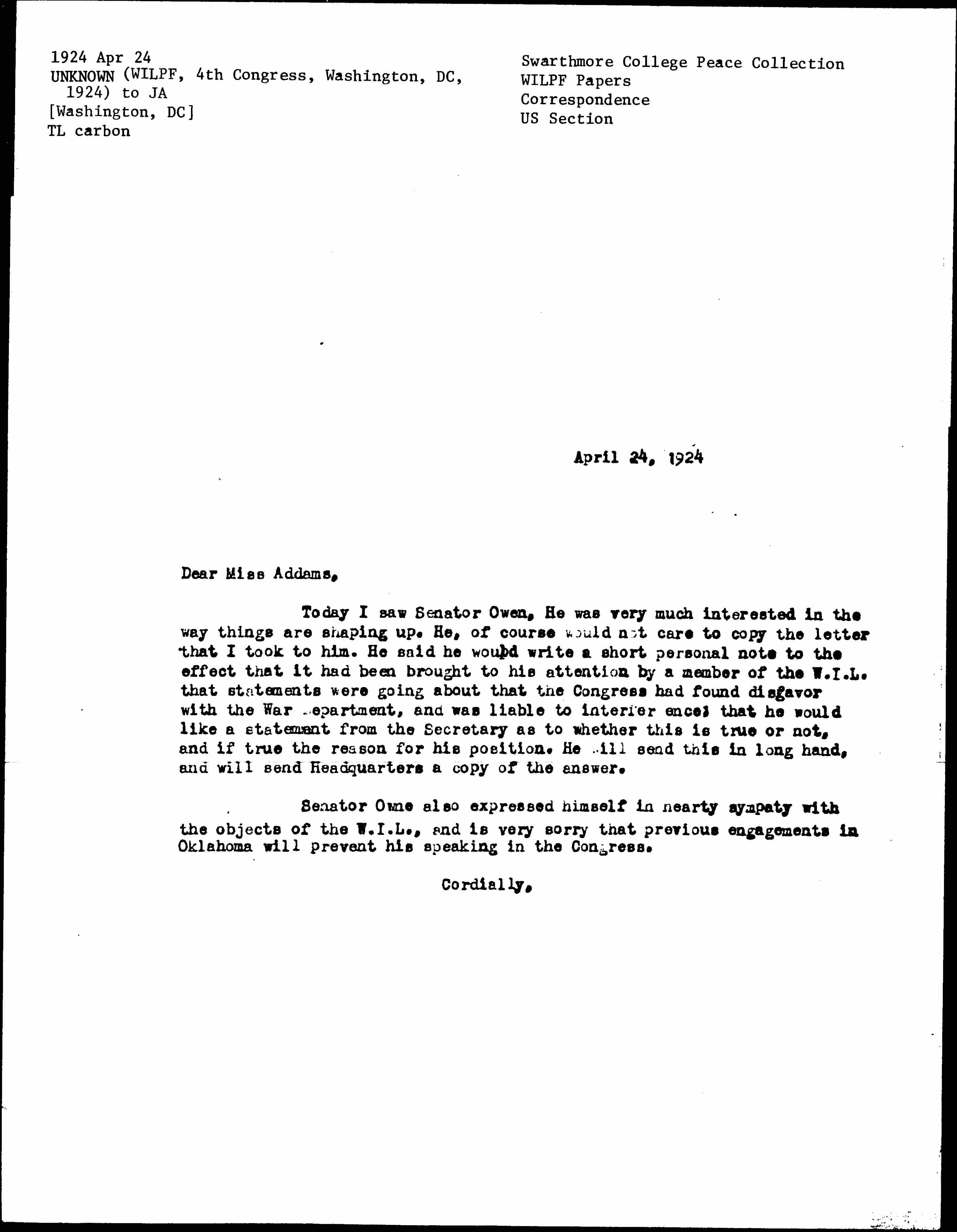 Today I saw Senator Owen. He was very much interested in the way things are shaping up. He, of course would not care to copy the letter that I took to him. He said he would write a short personal note to the effect that it had been brought to his attention by a member of the W.I.L. that statements were going about that the Congress had found disfavor with the War Department, and was liable to interferences that he would like a statement from the Secretary as to whether this is true or not, and if true the reason for his position. He will send this in long hand, and will send Headquarters a copy of the answer.