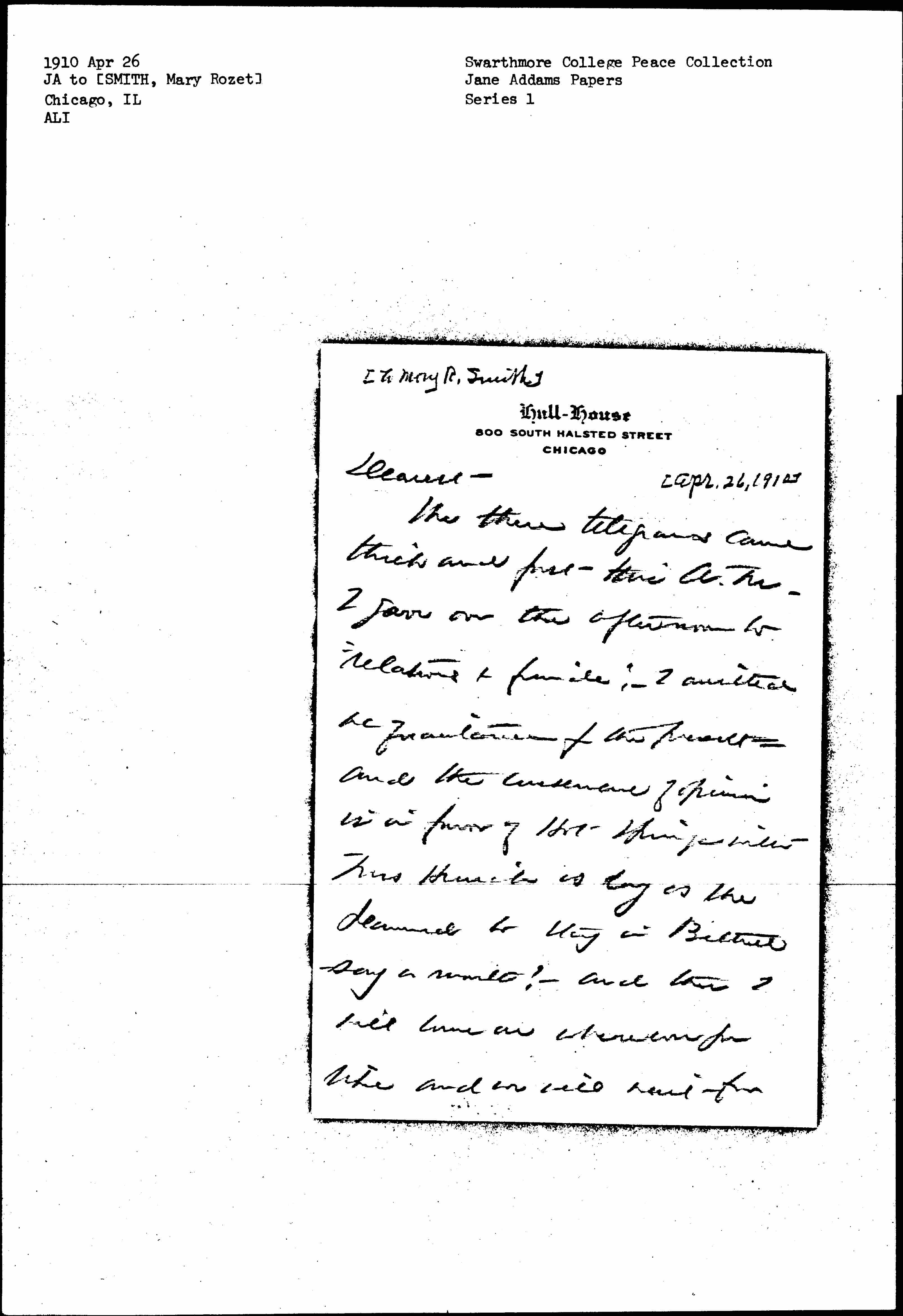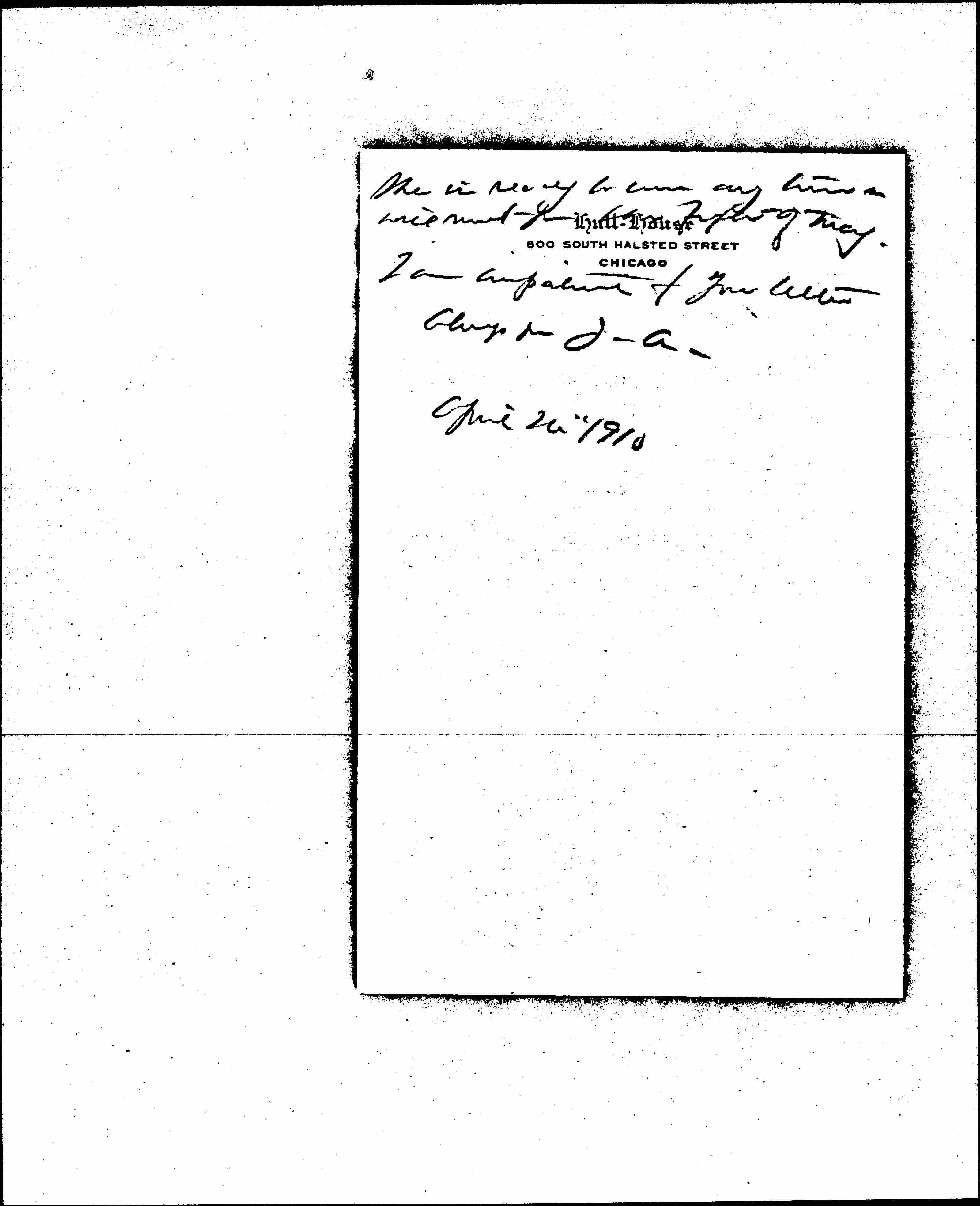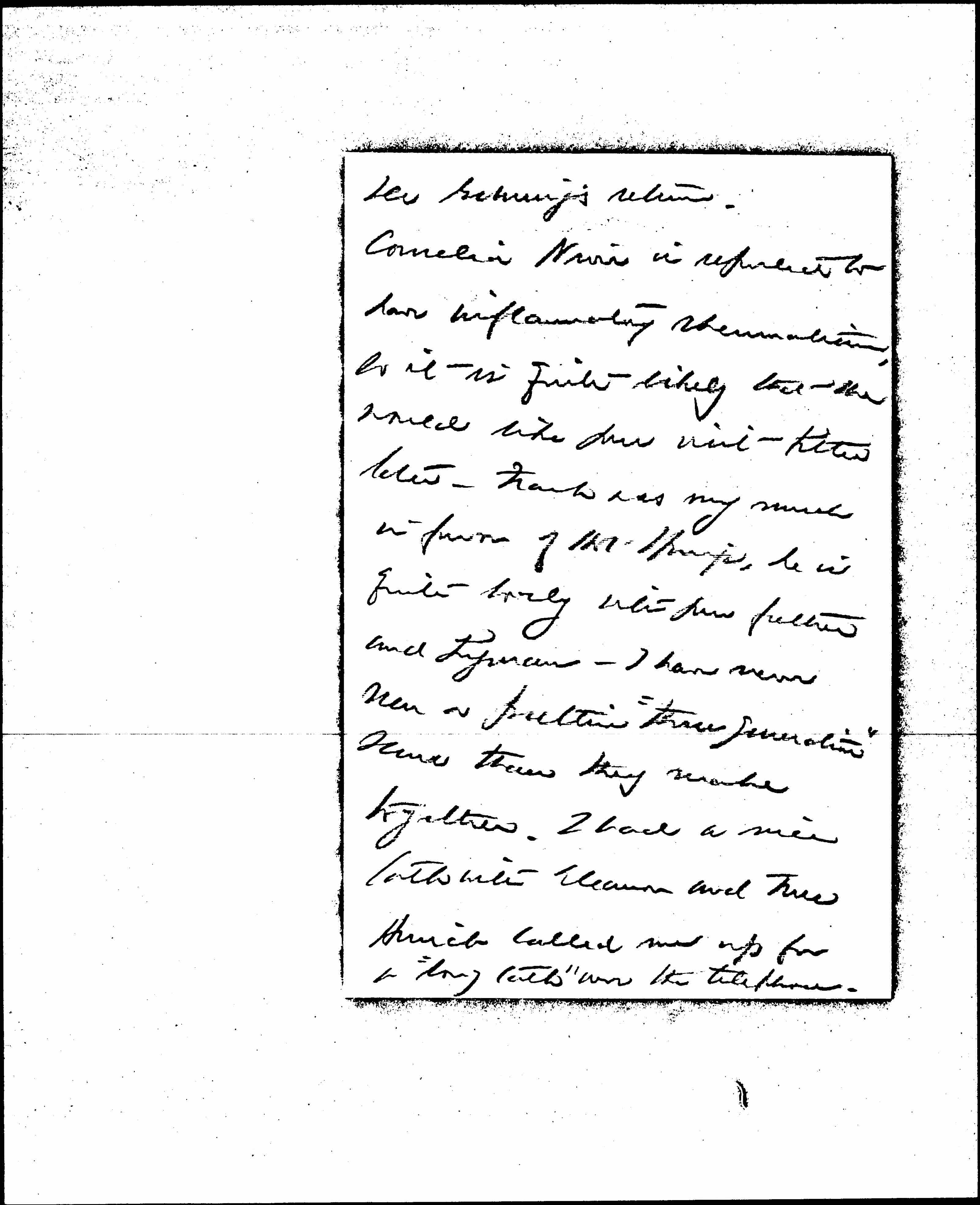 Cornelia Niver is reported to have inflammatory rheumatism, so it is quite likely that she would like your visit better later. Frank was very much in favor of Hot Springs, he is quite lonely with your father and Lyman-- I have never seen a prettier "three generation" scene than they make together. I had a nice talk with Eleanor and Mrs Herrick called me up for a "long talk" over the telephone. [page 3] She is ready to come any time & will meet you the fifth of May.