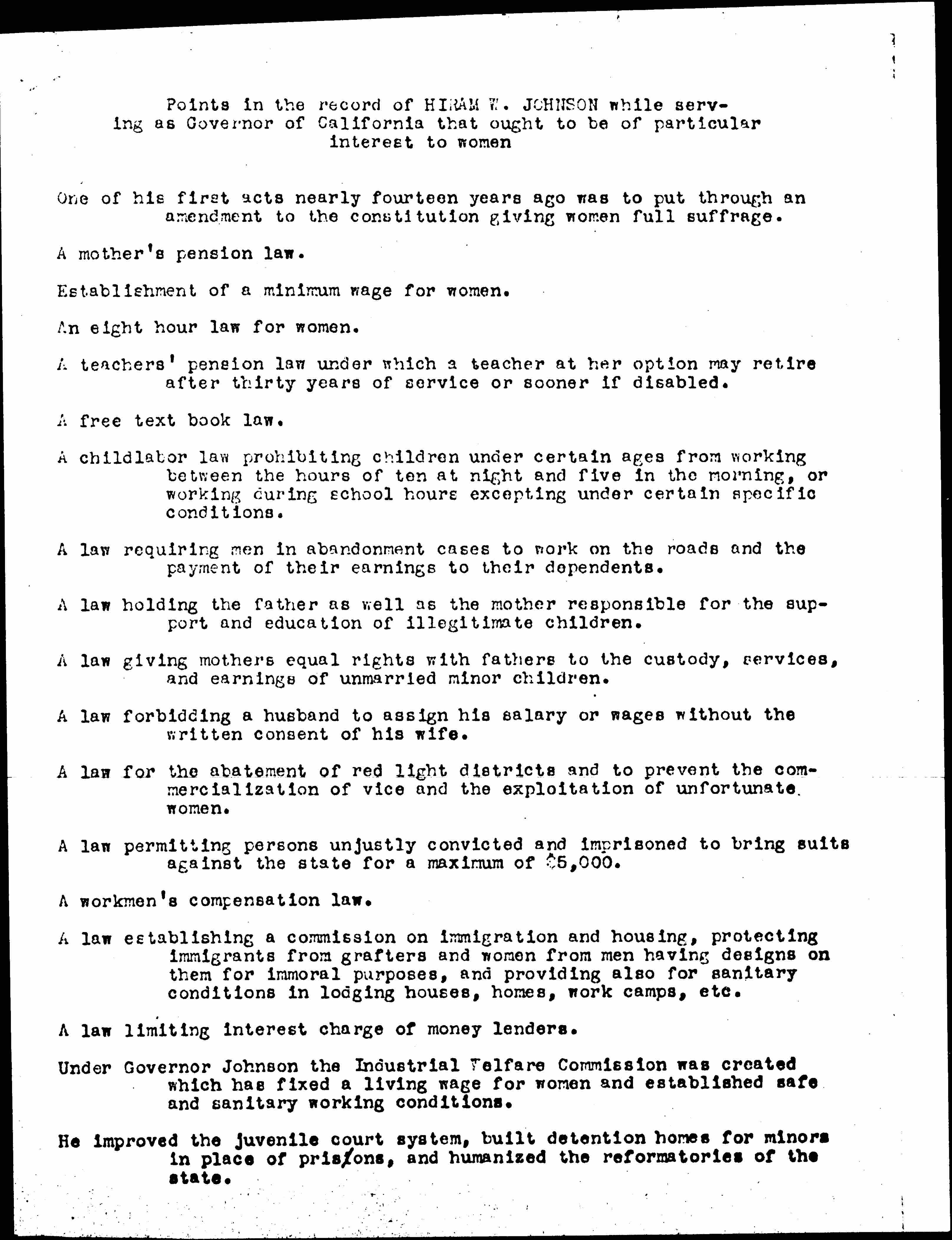 Points in the record of HIRAM W. JOHNSON while serving as Governor of California that ought to be of particular interest to women