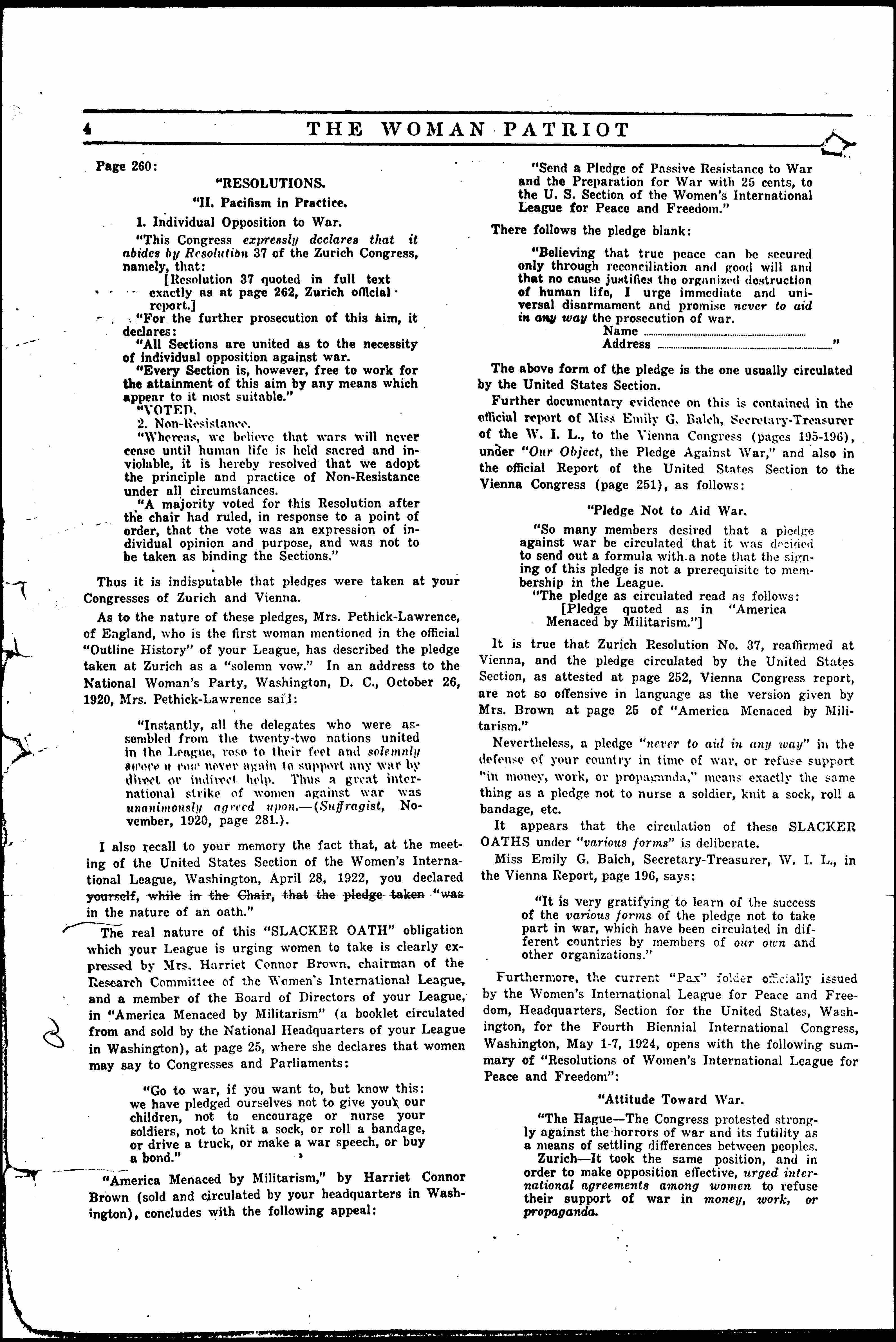 It is true that Zurich Resolution No. 37, reaffirmed at Vienna, and the pledge circulated by the United States Section, as attested at page 252, Vienna Congress report, are not so offensive in language as the version given by Mrs. Brown at page 25 of "America Menaced by Militarism."