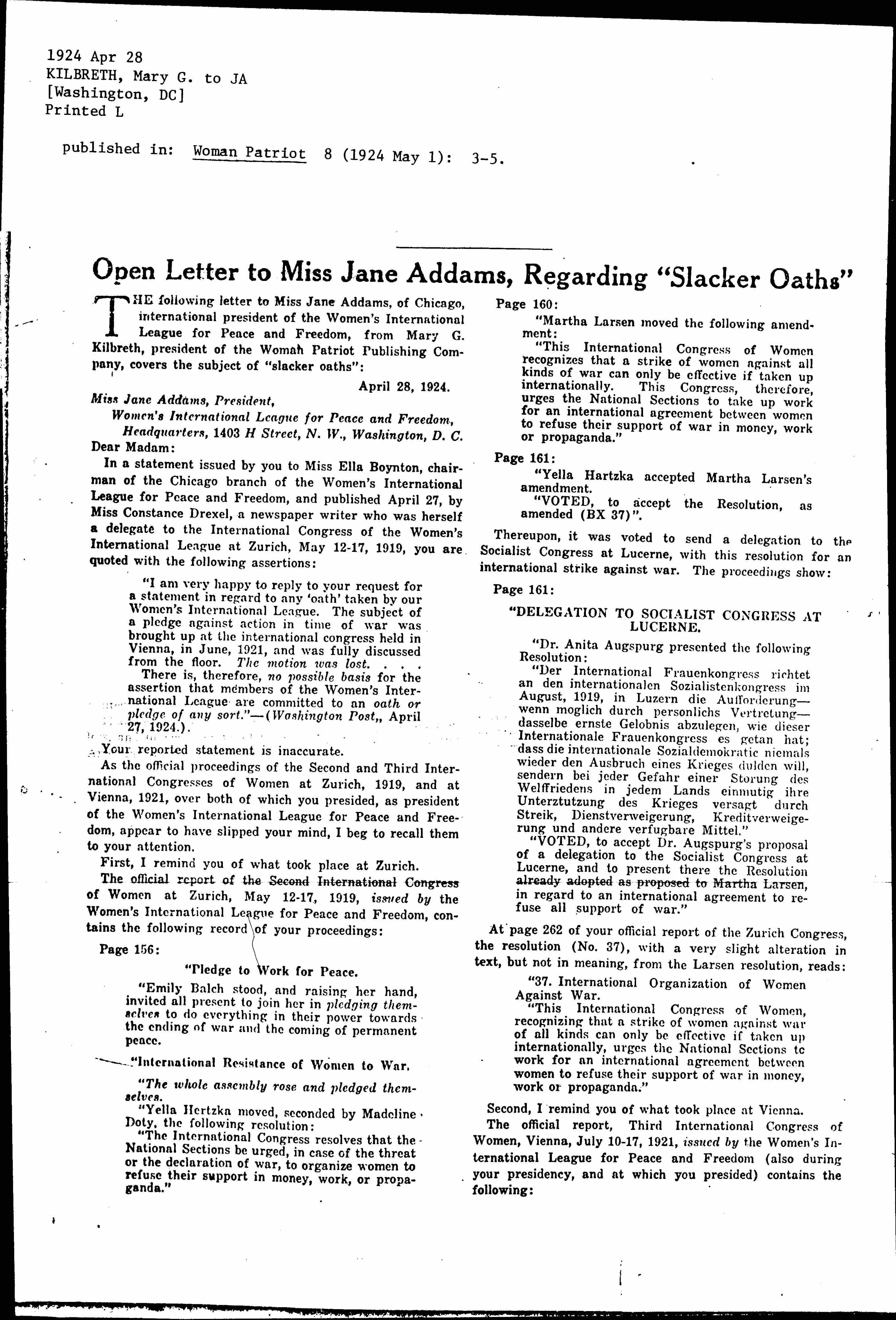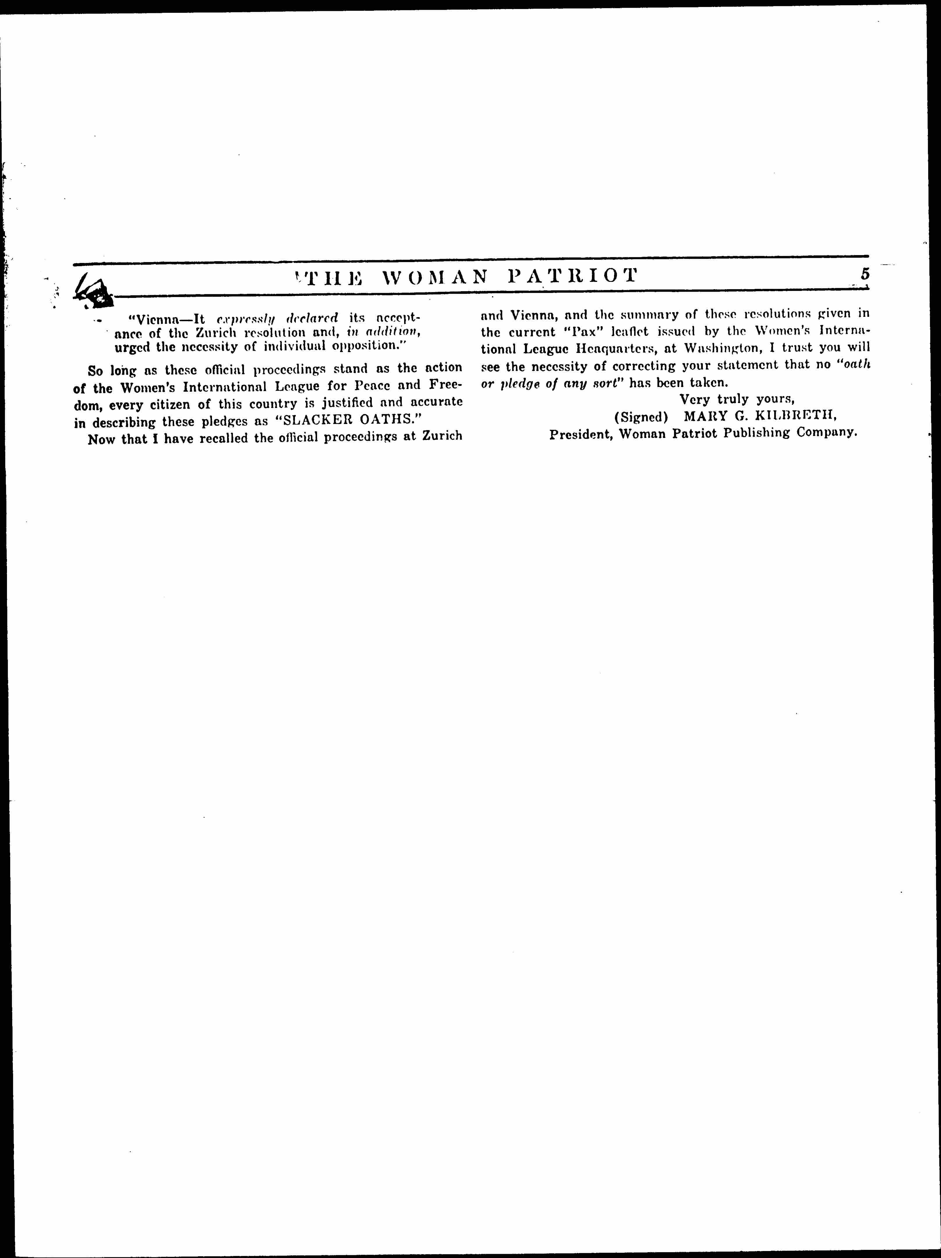 The following letter to Miss Jane Addams, of Chicago, international president of the Women's International League for Peace and Freedom, from Mary G. Kilbreth, president of the Woman Patriot Publishing Company, covers the subject of "slacker oaths":