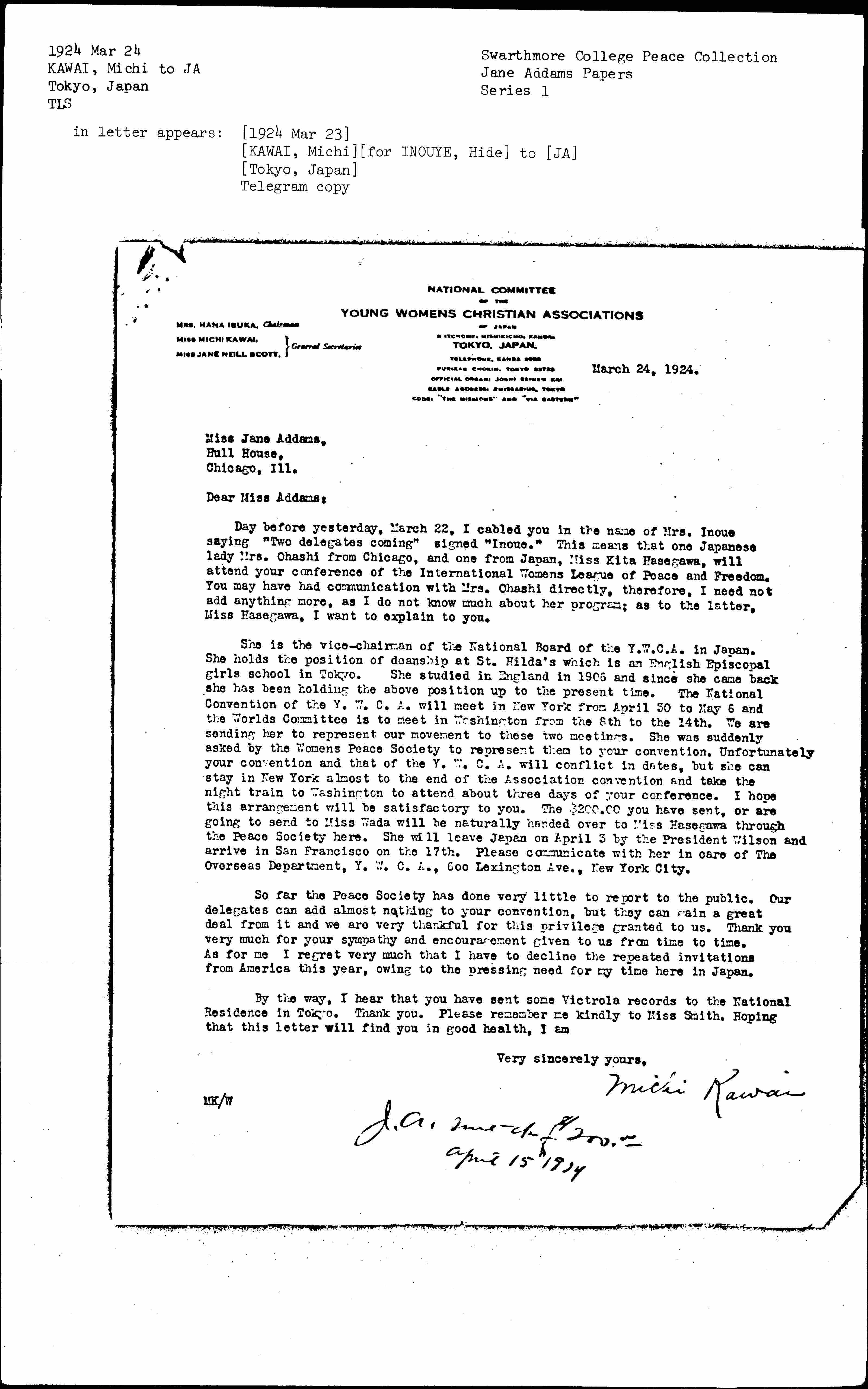 Day before yesterday, March 22, I cabled you in the name of Mrs. Inoue saying "Two delegates coming" signed "Inoue." This means that one Japanese lady Mrs. Ohashi from Chicago, and one from Japan, Miss Kita Hasegawa, will attend your conference of the International Womens League of Peace and Freedom. You may have had communication with Mrs. Ohashi directly, therefore, I need not add anything more, as I do not know much about her program; as to the latter, Miss Hasegawa, I want to explain to you.