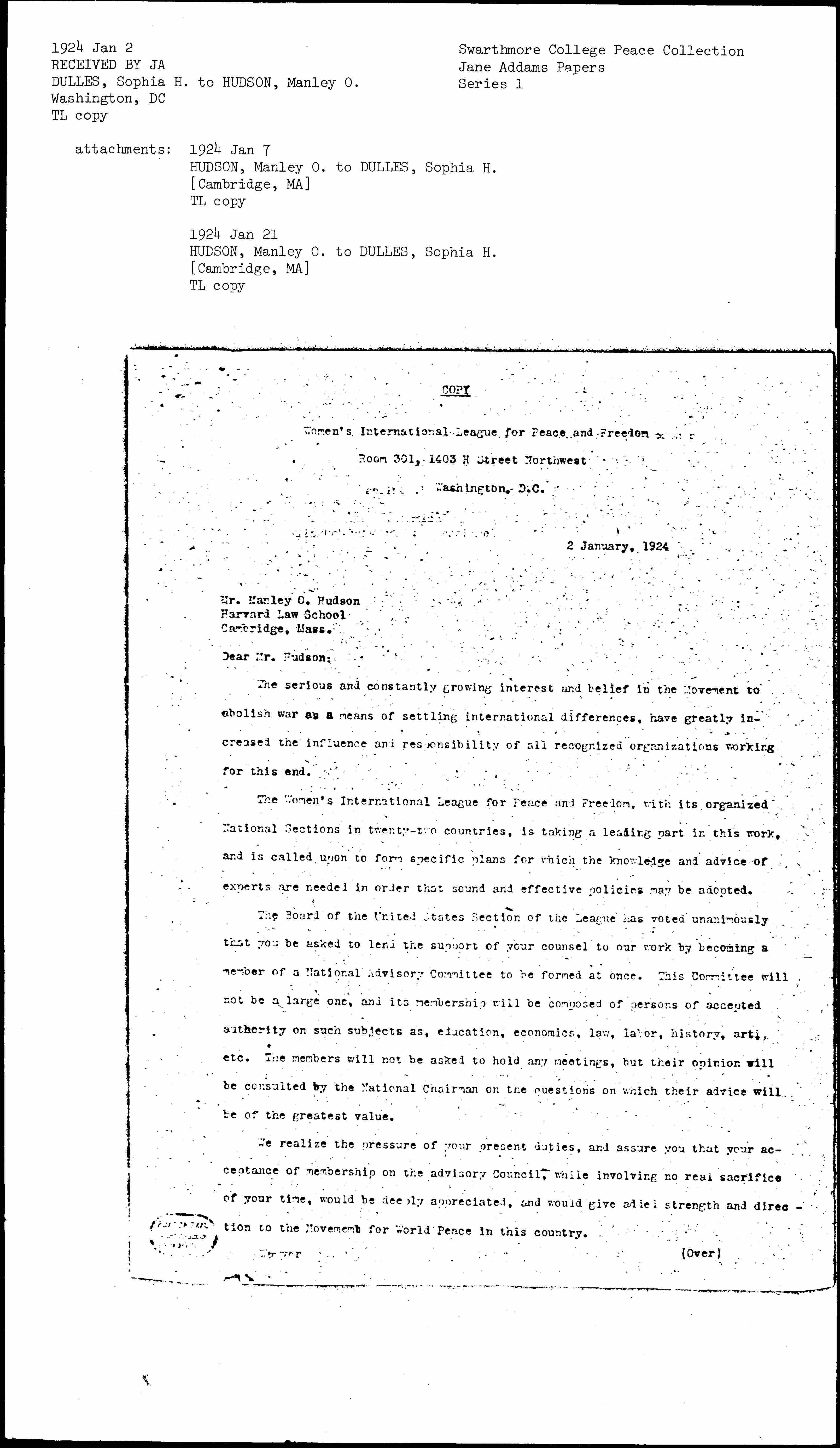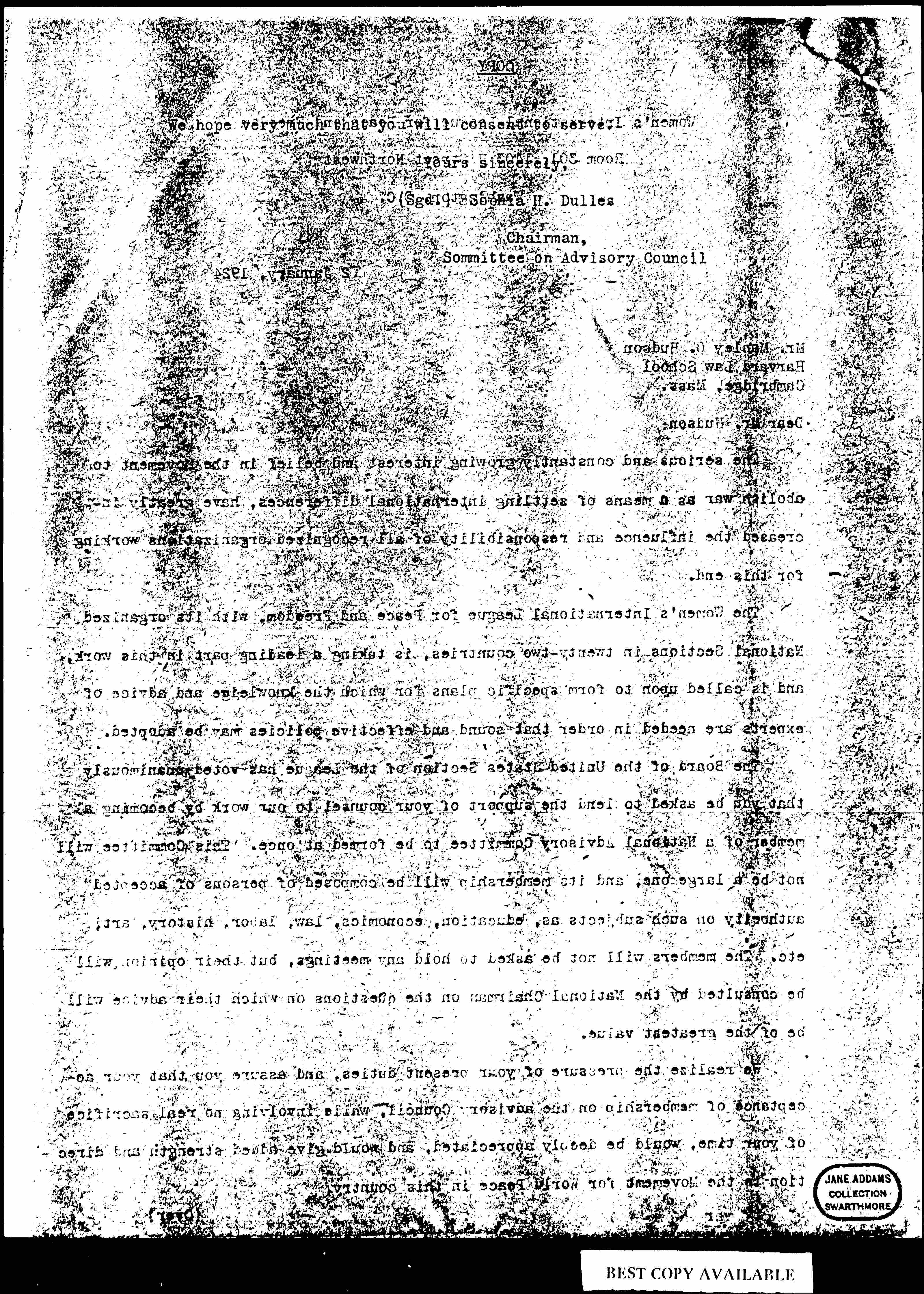 The Board of the United States Section of the League has voted unanimously that you be asked to lend the support of your counsel to our work by becoming a member of a National Advisory Committee to be formed at once. This Committee will not be a large one, and its membership will be composed of persons of accepted authority on such subjects as, education, economics, law, labor, history, art, etc. The members will not be asked to hold any meetings, but their opinions will be consulted by the National Chairman on the questions on which their advice will be of the greatest value.