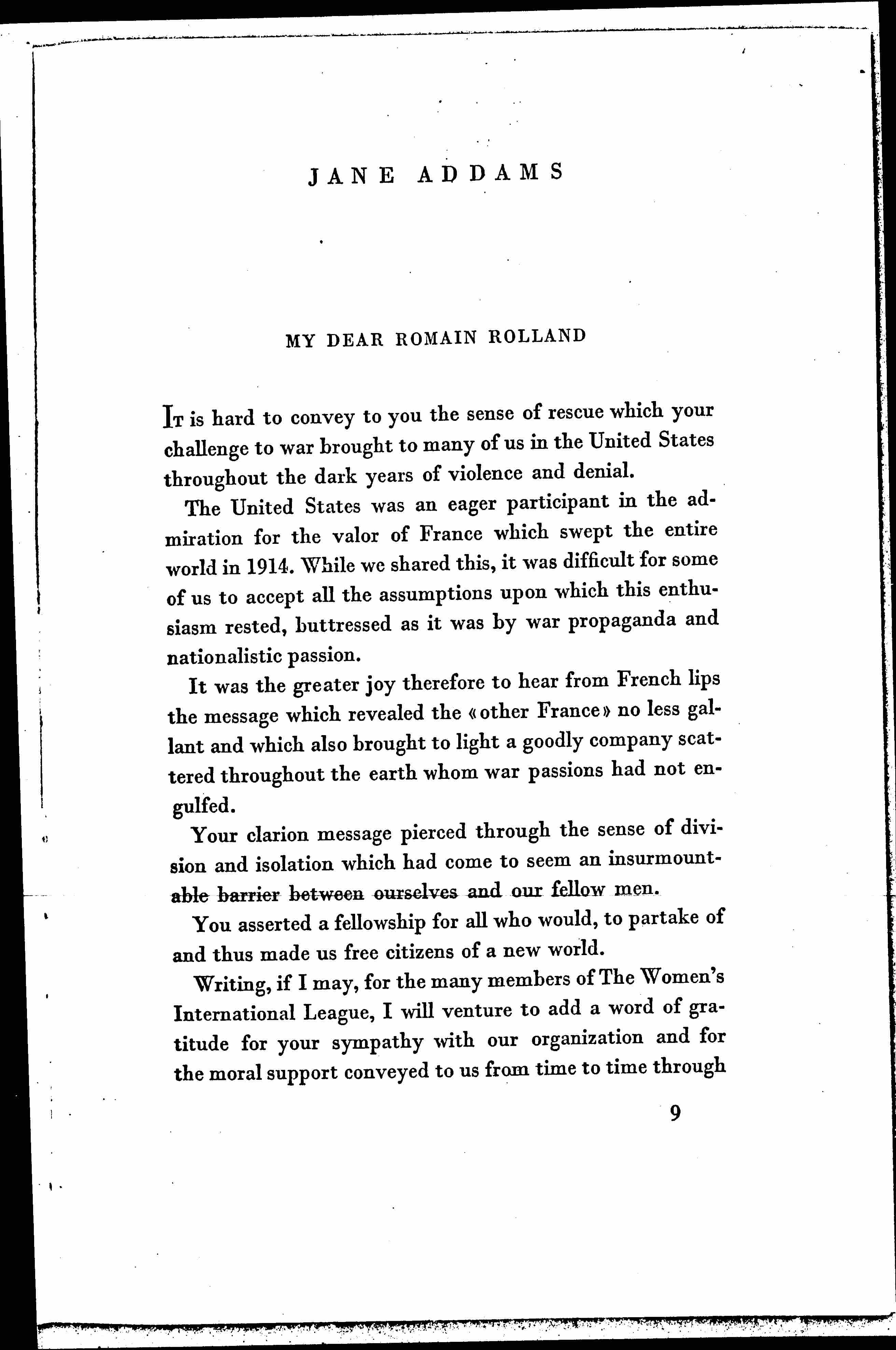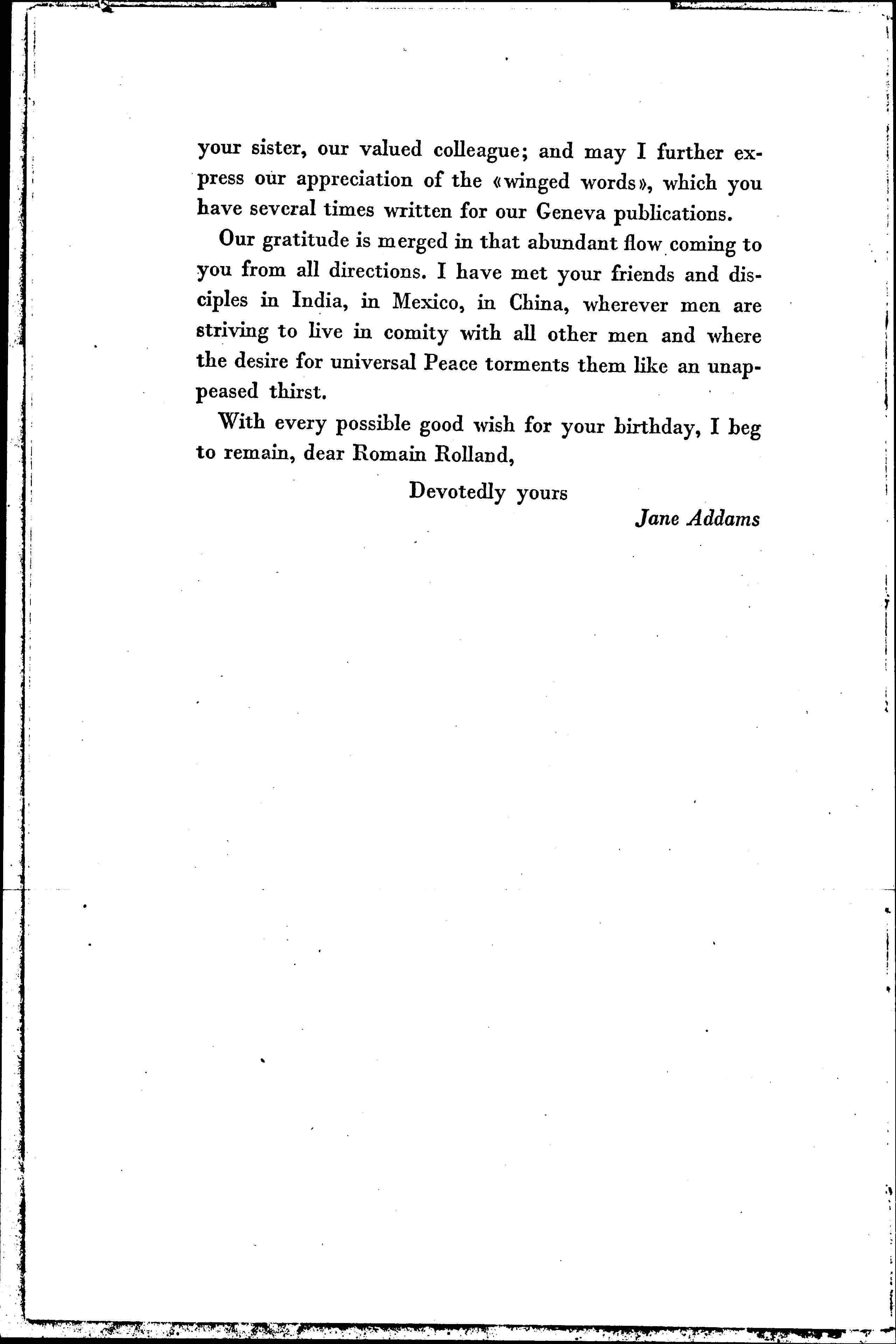 Writing, if I may, for the many members of The Women's International League, I will venture to add a word of gratitude for your sympathy with our organization and for the moral support conveyed to us from time to time through [page 2] your sister, our valued colleague; and may I further express our appreciation of the "winged words," which you have several times written for our Geneva publications.