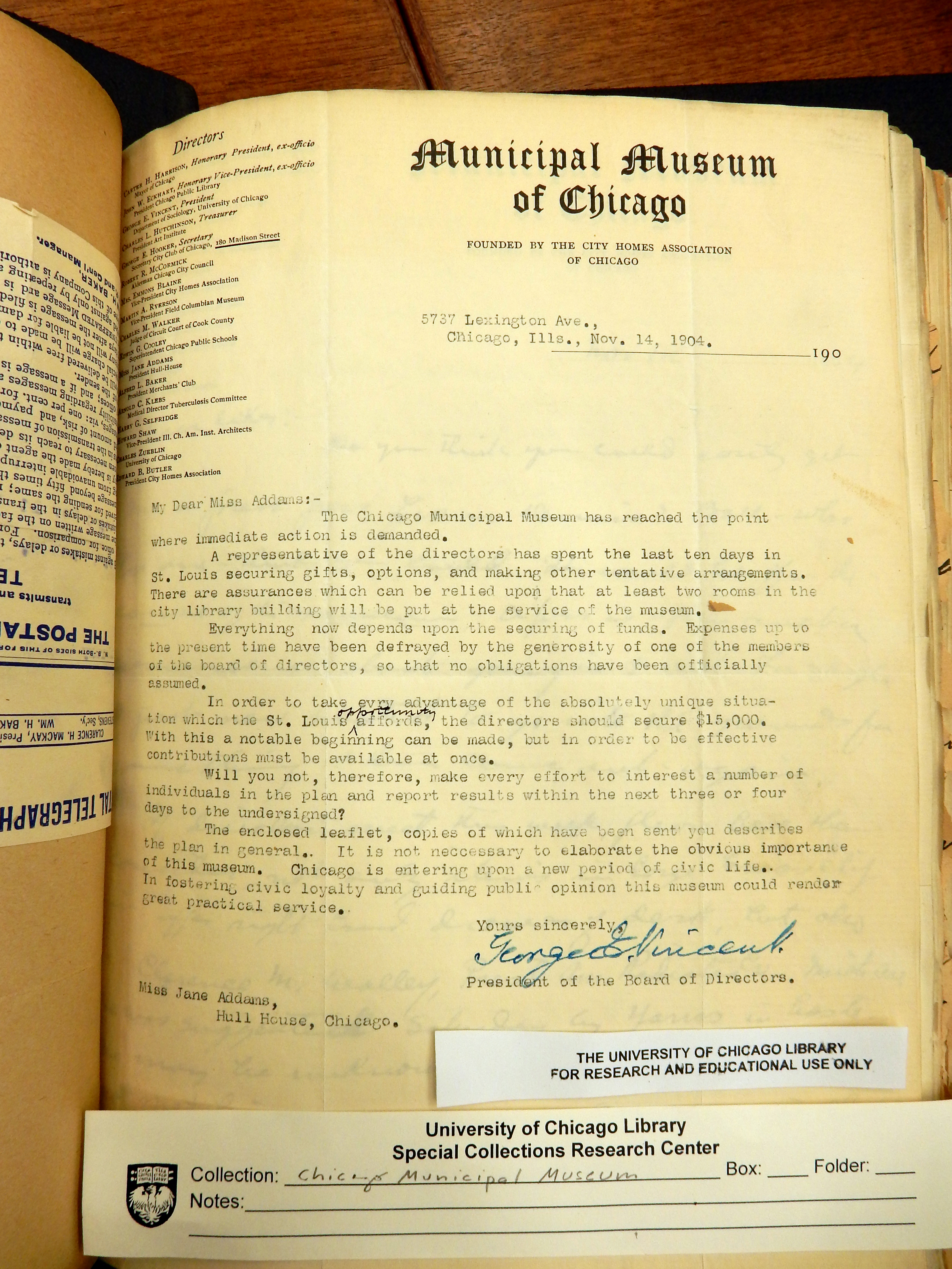 The enclosed leaflet, copies of which have been sent you describes the plan in general. It is not necessary to elaborate the obvious importance of this museum. Chicago is entering upon a new period of civic life. In fostering civic loyalty and guiding public opinion this museum could render great practical service.