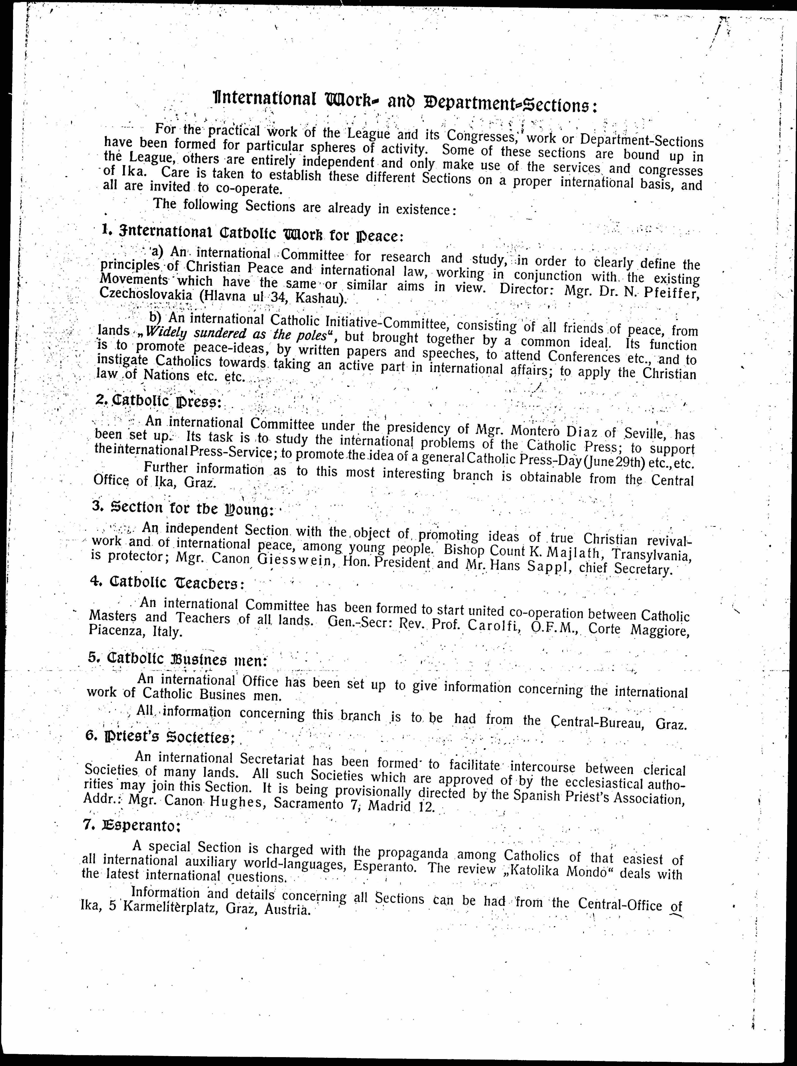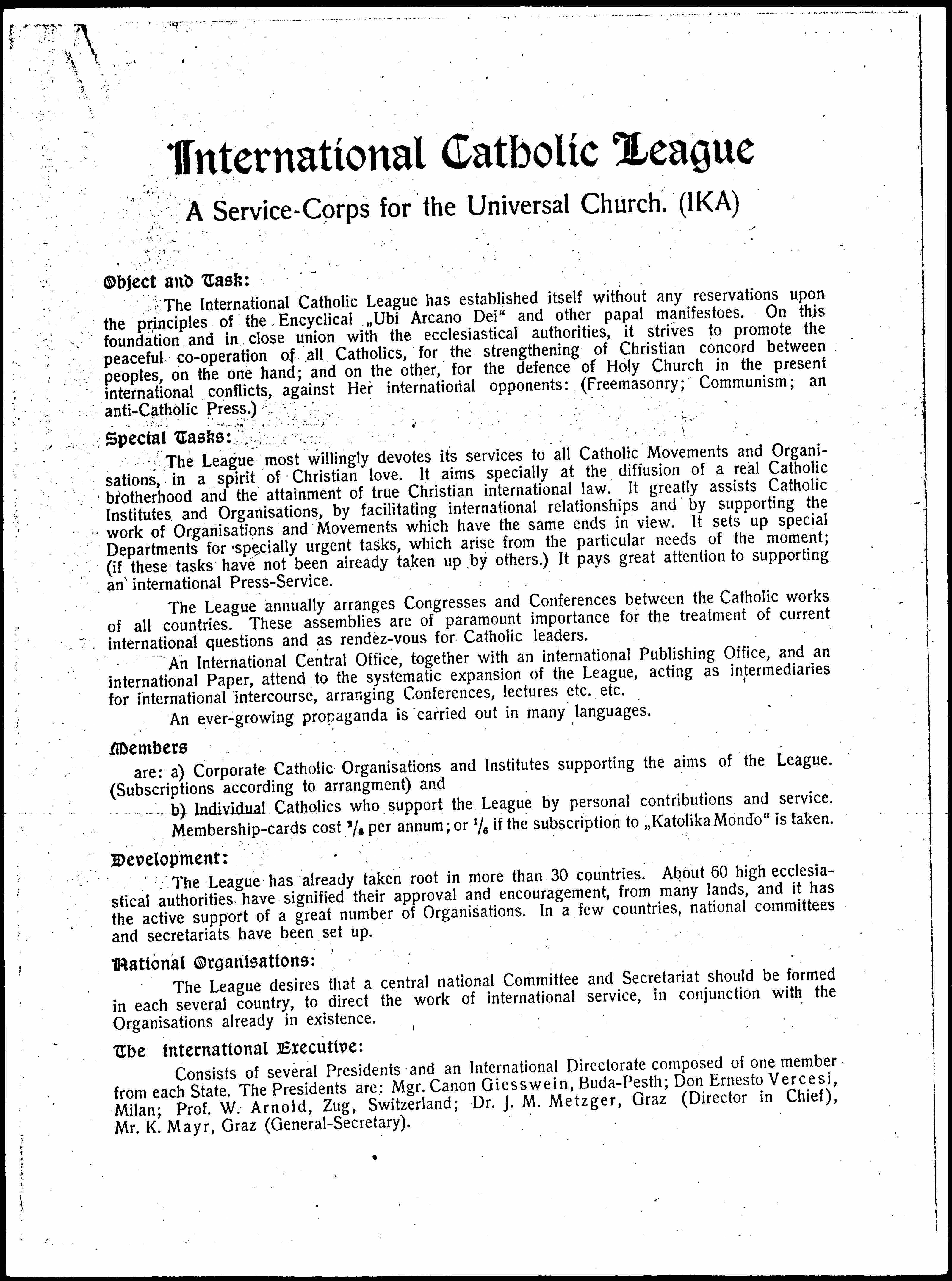 Consists of several Presidents and an International Directorate composed of one member from each State. The Presidents are: Mgr. Canon Giesswein, [Budapest]; Don Ernesto Vercesi, Milan; Prof. W. Arnold, Zug, Switzerland; Dr. J. M. Metzger, Graz (Director in Chief), Mr. K. Mayr, Graz (General-Secretary). [page 2]