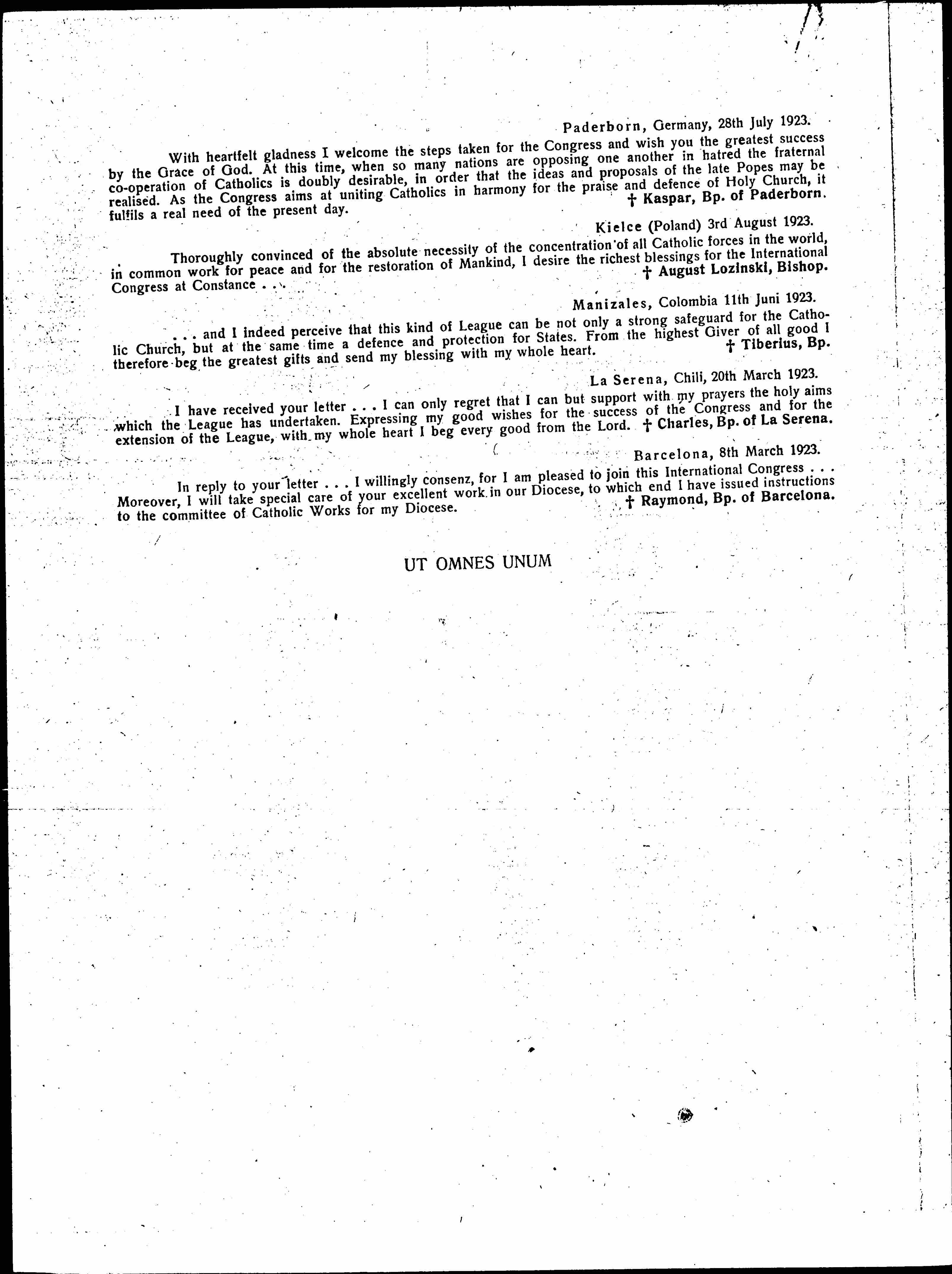 With heartfelt gladness I welcome the steps taken for the Congress and wish you the greatest success by the Grace of God. At this time, when so many nations are opposing one another in hatred the fraternal [cooperation] of Catholics is doubly desirable, in order that the ideas and proposals of the late Pope may be [realized]. As the Congress aims at uniting Catholics in harmony for the praise and defense of Holy Church, it [fulfills] a real need of the present day.
