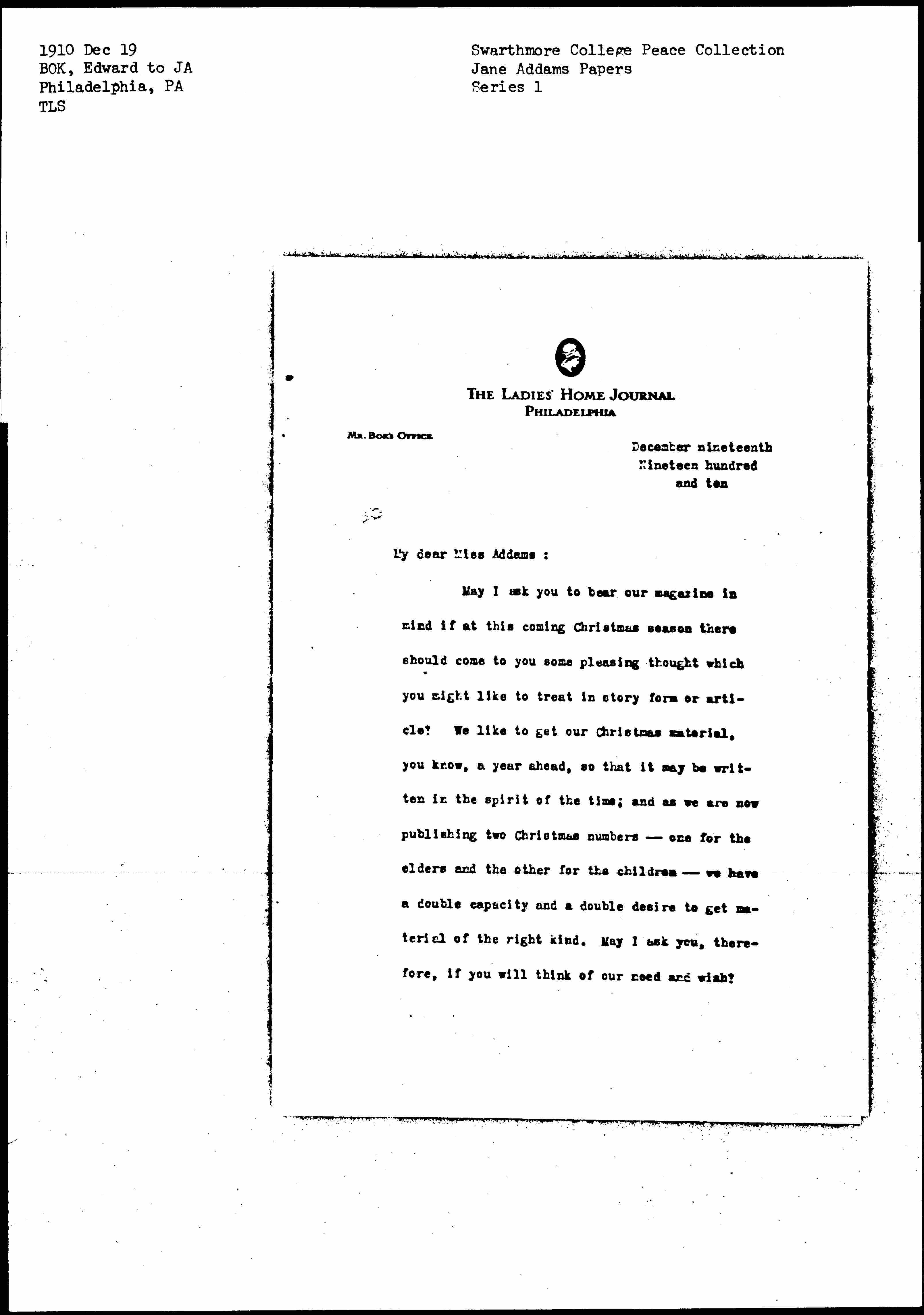 May I ask you to bear our magazine in mind if at this coming Christmas season there should come to you some pleasing thought which you might like to treat in story form or article? We like to get our Christmas material, you know, a year ahead, so that it may be written in the spirit of the time; and as we are now publishing two Christmas numbers -- one for the elders and the other for the children -- we have a double capacity and a double desire to get material of the right kind. May I ask you, therefore, if you will think of our need and wish? [page 2]