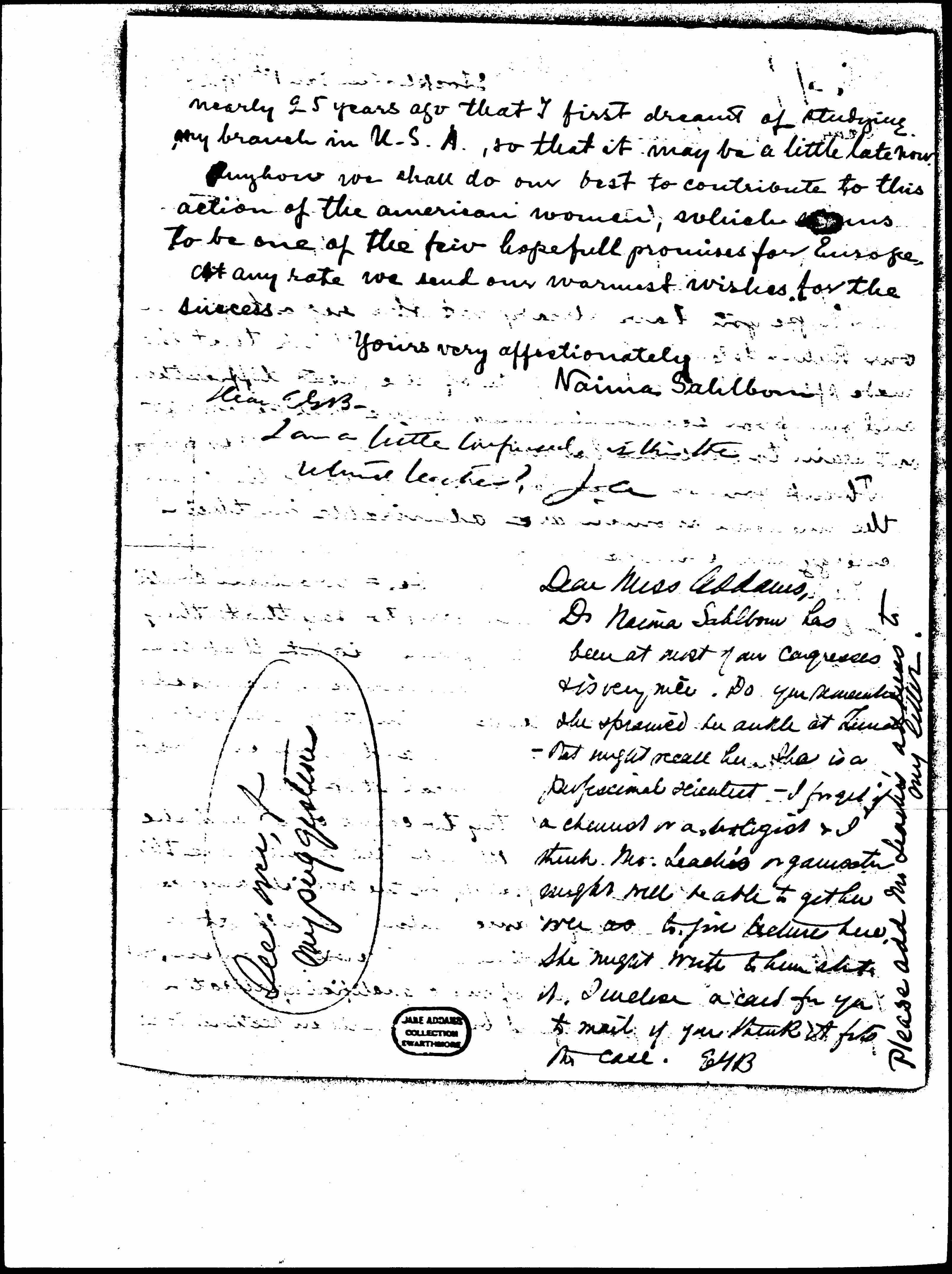 Dr Naima Sahlbom has been at most of our congresses & is very nice. Do you remember she sprained her ankle at Zurich -- that might recall her. She is a professional scientist -- I forget if a chemist or a biologist & I think Mr. Leach's [organization] might well be able to get her over as to give lectures here. She might write to him [about] it. I enclose a card for you to mail if you think it fits the case.