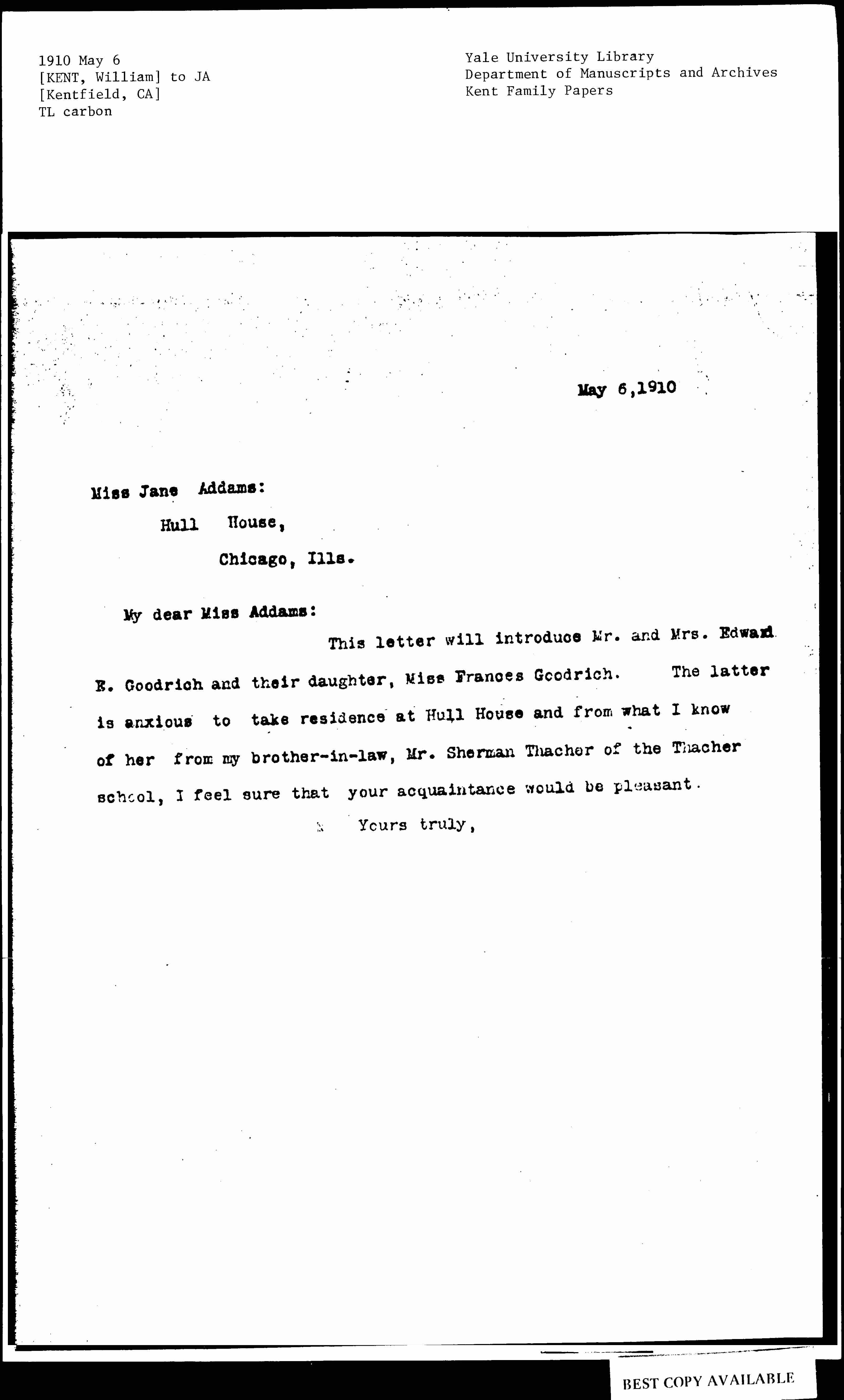 This letter will introduce Mr. and Mrs. Edward R. Goodrich and their daughter, Miss Frances Goodrich. The latter is anxious to take residence at Hull House and from what I know of her from my brother-in-law, Mr. Sherman Thatcher of the Thatcher school, I feel sure that your acquaintance would be pleasant.