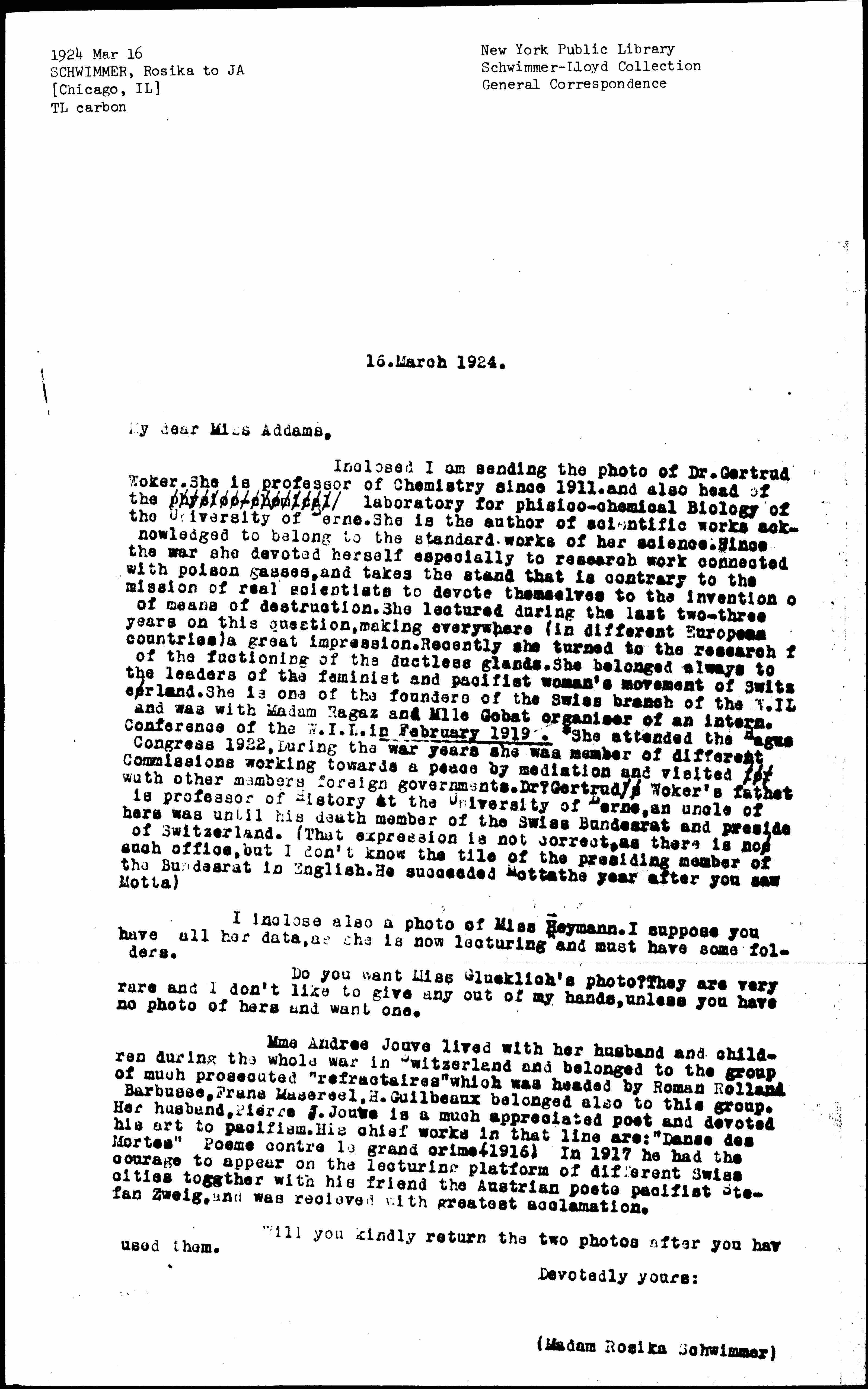 [Enclosed] I am sending the photo of Dr. Gertrud Woker. She is professor of Chemistry since 1911, and also head of the physico-chemical laboratory for [physico]-chemical Biology of the University of Berne. She is the author of scientific works acknowledged to belong to the standard works of her science. Since the war she devoted herself especially to research work connected with poison [gases], and takes the stand that is contrary to the mission of real scientists to devote themselves to the invention of means of destruction. She lectured during the last two-three years on this question, making everywhere (in different European countries) a great impression. Recently she turned to the research of the [functioning] of the ductless glands. She belonged always to the leaders of the feminist and pacifist woman's movement of Switzerland. She is one of the founders of the Swiss branch of the W.I.L. and was with Madam Ragaz and Mlle Gobat [organizer] of an intern. Conference of the W.I.L. in February 1919. She attended The Hague Congress 1922. During the war years she was member of different Commissions working towards a peace by mediation and visited for with other members foreign governments. Dr. Gertrud Woker's father is professor of History at the University of Berne, an uncle of hers was until his death member of the Swiss Bundesrat and [president] of Switzerland. (That expression is not correct, as there is no such office, but I don’t know the [title] of the presiding member of the Bundesrat in English. He succeeded Motta the year after you saw Motta)