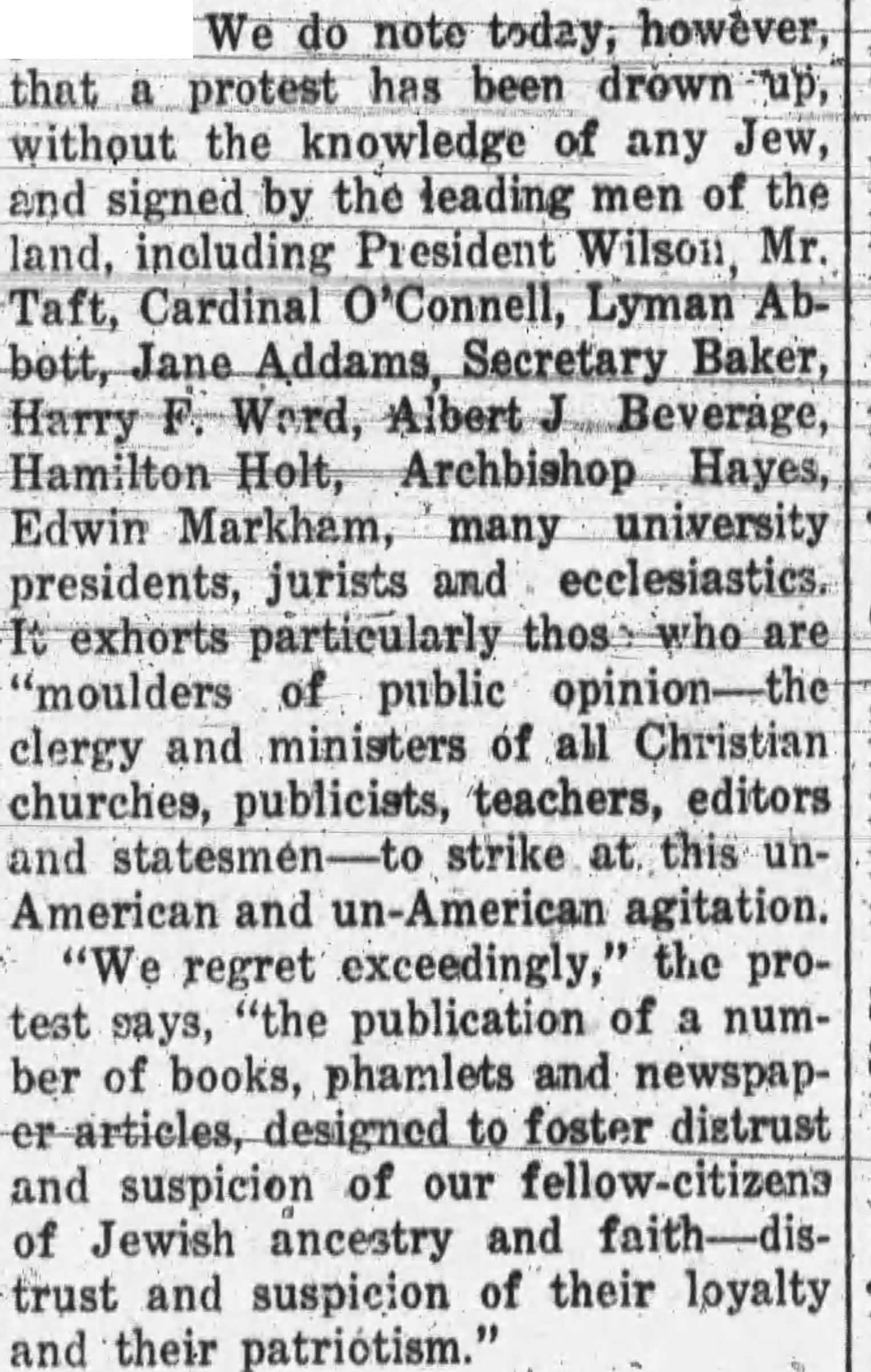 We do note today, however, that a protest has been [drawn] up, without the knowledge of any Jew, and signed by the leading men of the land, including President Wilson, Mr. Taft, Cardinal O'Connell, Lyman Abbott, Jane Addams, Secretary Baker, Harry F. Ward, Albert J. [Beveridge], Hamilton Holt, Archbishop Hayes, Edwin Markham, many university presidents, jurists and ecclesiastics. It exhorts particularly those who are "[molders] of public opinion -- the clergy and ministers of all Christian churches, publicists, teachers, editors and statesmen -- to strike at this un-American and Un-American agitation.