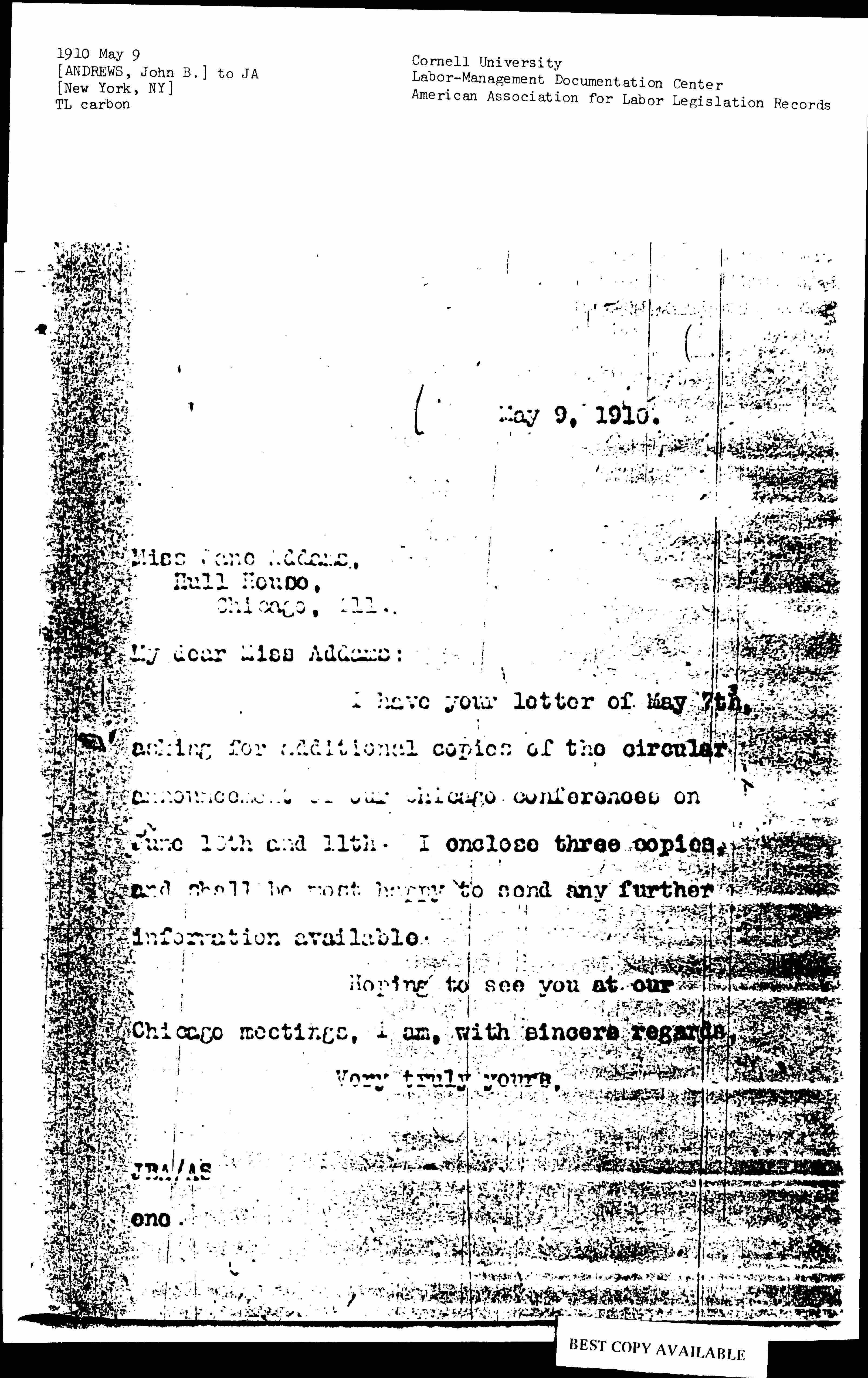 I have your letter of May 7th, asking for additional copies of the circular announcement [of] our Chicago conferences on June 10th and 11th. I enclose three copies, and shall be most happy to send any further information available.