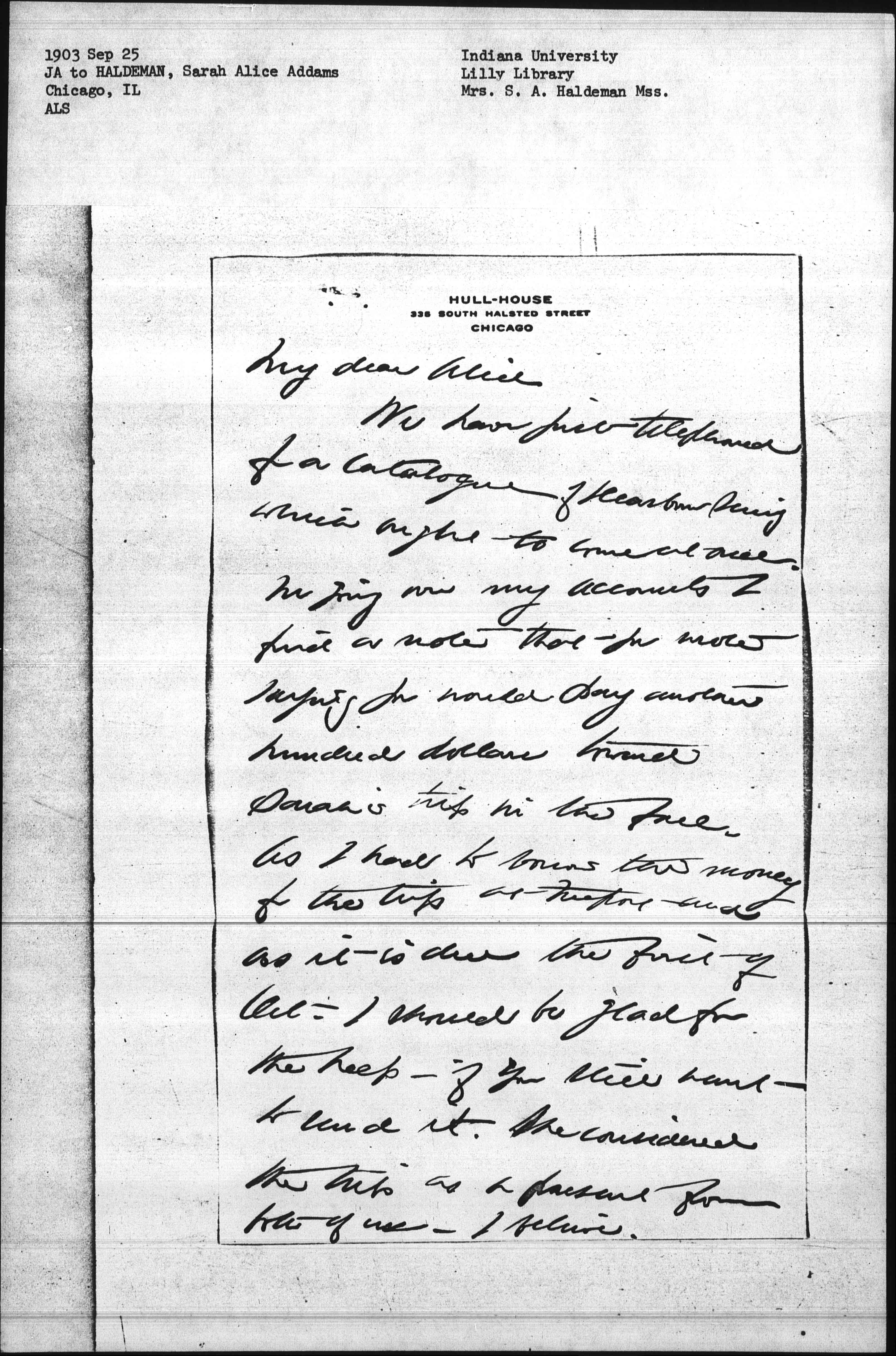In going over my accounts I find a note that you wrote saying you would pay another hundred dollars toward Sarah's trip in the fall. As I had to [borrow] the money for the trip at Freeport and as it is due the first of Oct. I should be glad for the help--if you still want to send it. She considered the trip as a present from both of us--I believe.