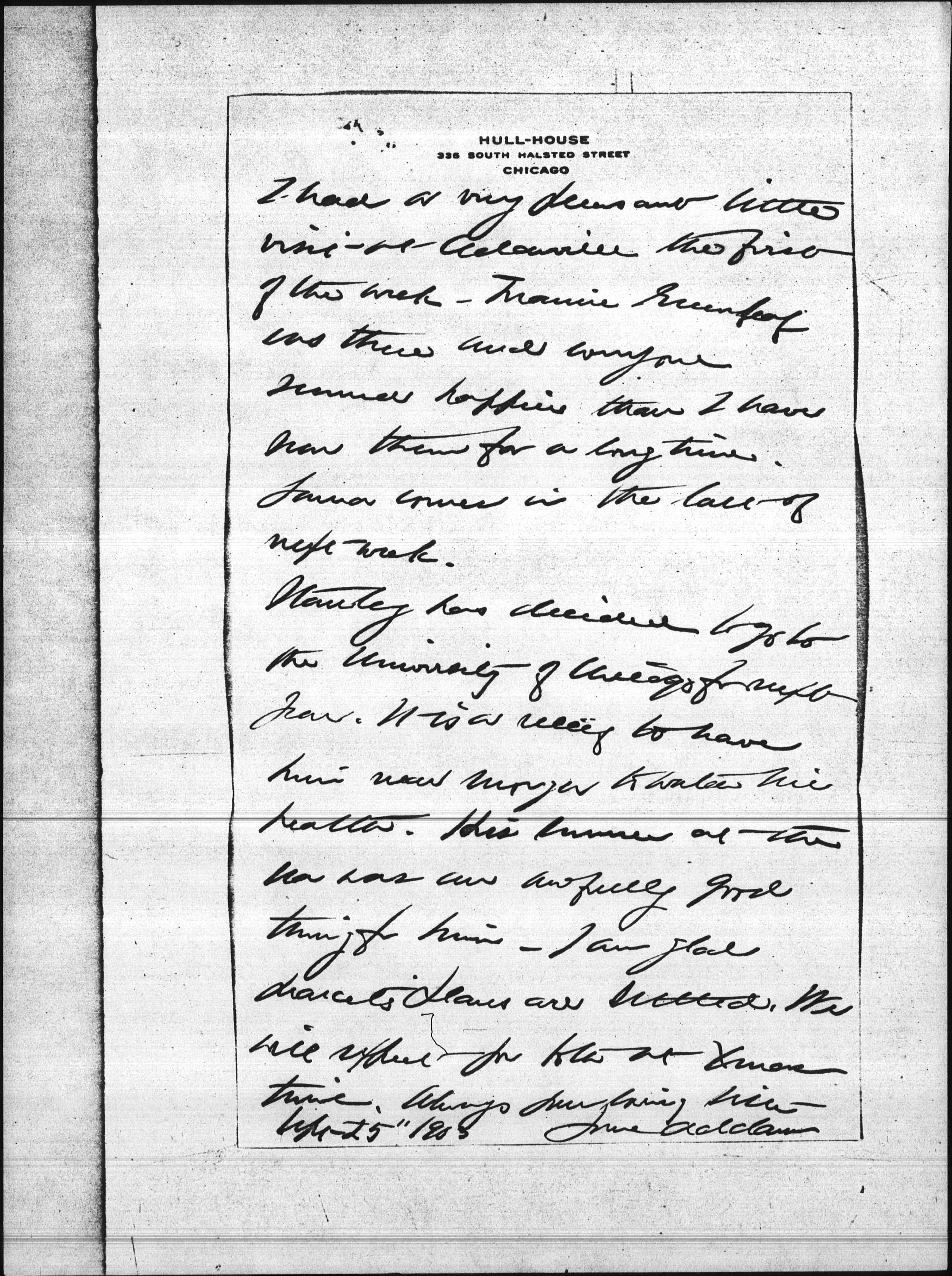 Stanley has decided to go to the University of Chicago for next year. It is a relief to have him near enough to watch his health. His summer at the sea was an awfully good thing for him. I am glad Marcet's plans are settled. We will expect you both at Xmas time. Always your loving sister