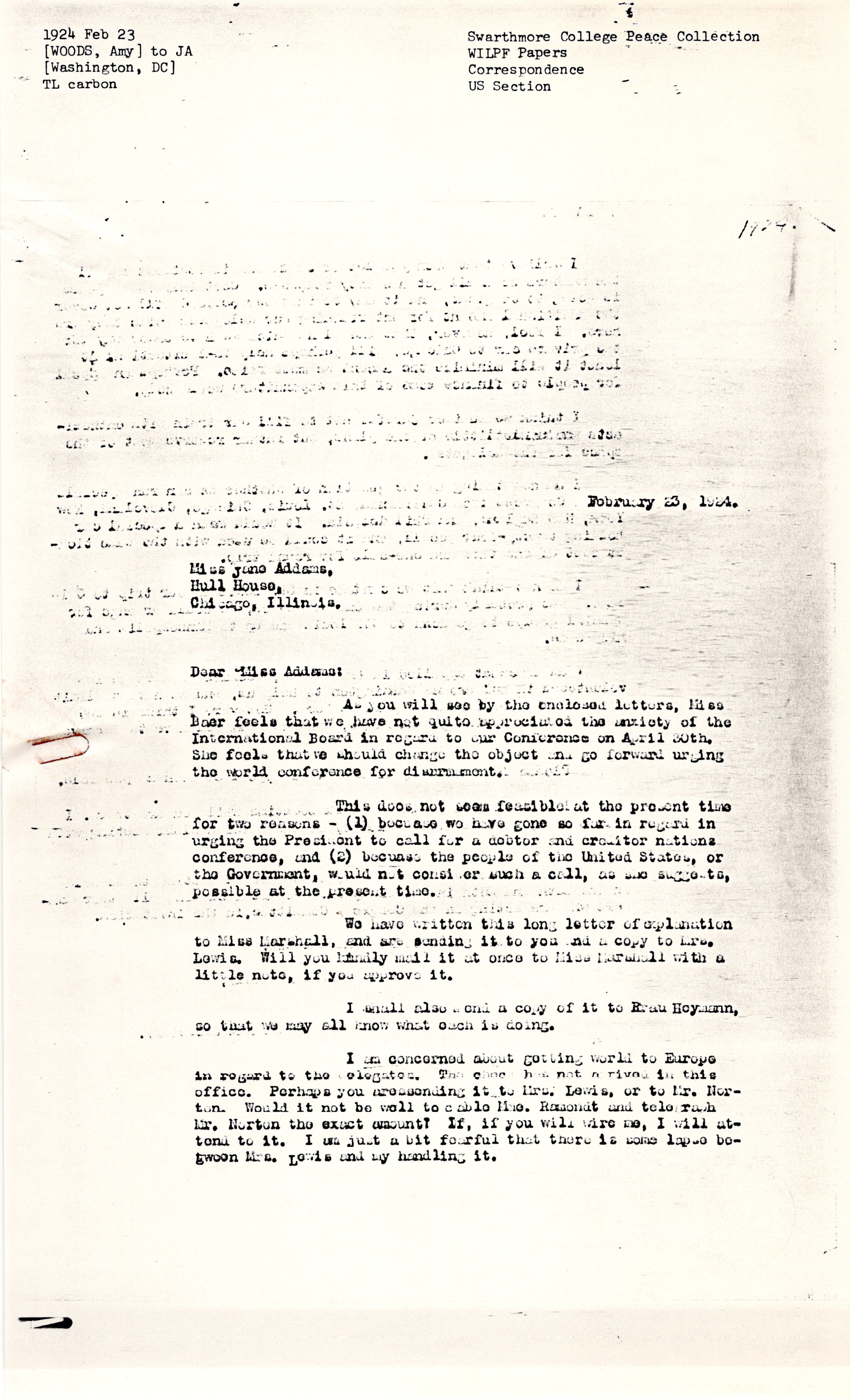 As you will see by the enclosed letters, Miss Baer feels that we have not quite appreciated the anxiety of the International Board in regard to our Conference on April 30th. She feels that we should change the object and go forward urging the world conference for disarmament.