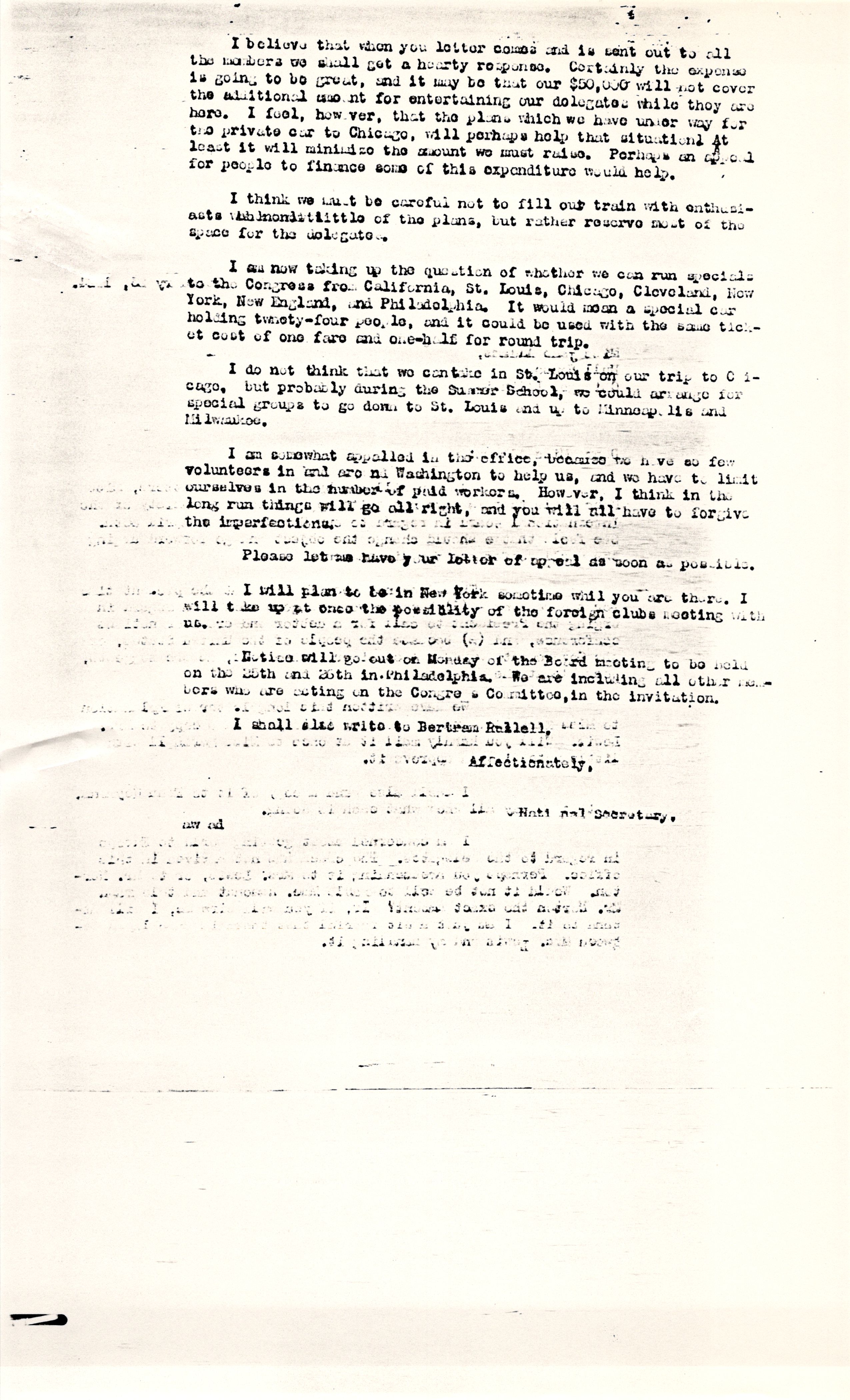 I am concerned about getting [word] to Europe in regard to the delegates. The [check] has not arrived in this office. Perhaps you are sending it to Mrs. Lewis, or to Mr. Norton. Would it not be well to cable Mme. Ramondt and telegraph Mr. Norton the exact amount? If you will wire me, I will attend to it. I am just a bit fearful that there is some lapse between Mrs. Lewis and my handling it. [page 2]