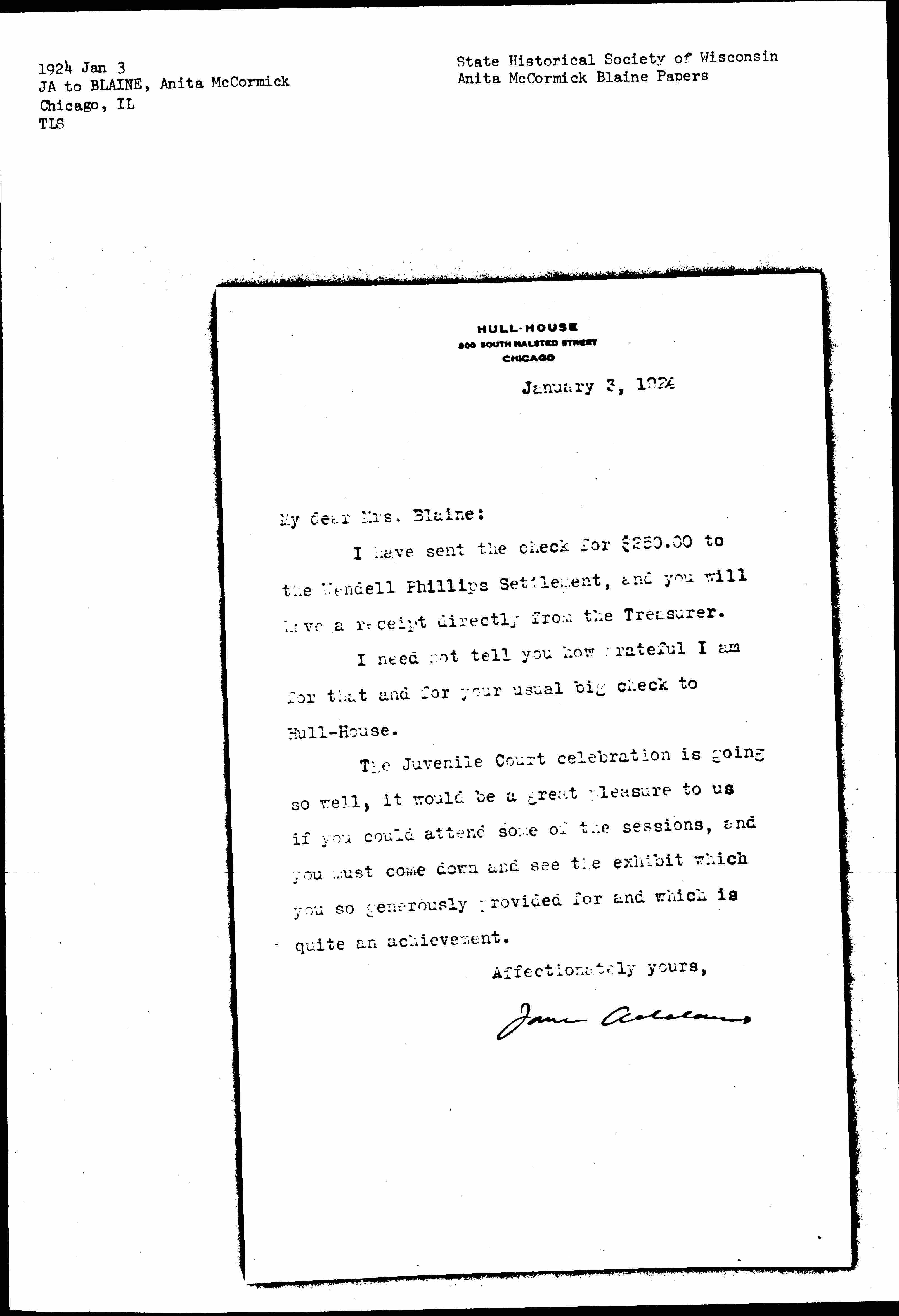 My dear Mrs. Blaine:I have sent the check for $250.00 to the Wendell Phillips Settlement, and you will have a receipt directly from the Treasurer.