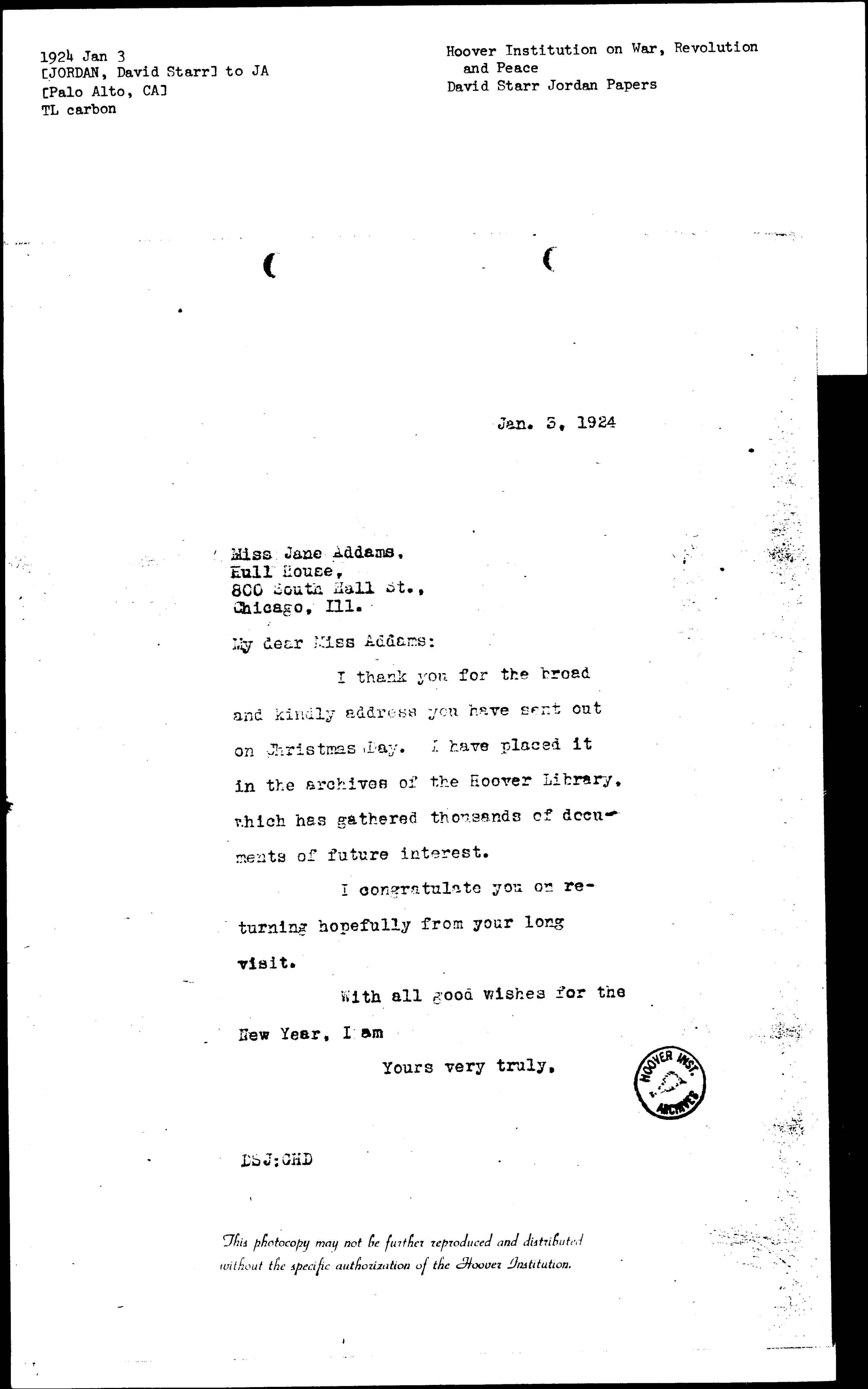 I thank you for the broad and kindly address you have sent out on Christmas Day. I have placed it in the archives of the Hoover Library, which has gathered thousands of documents of future interest.