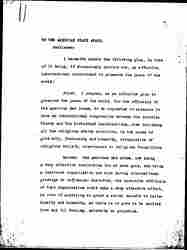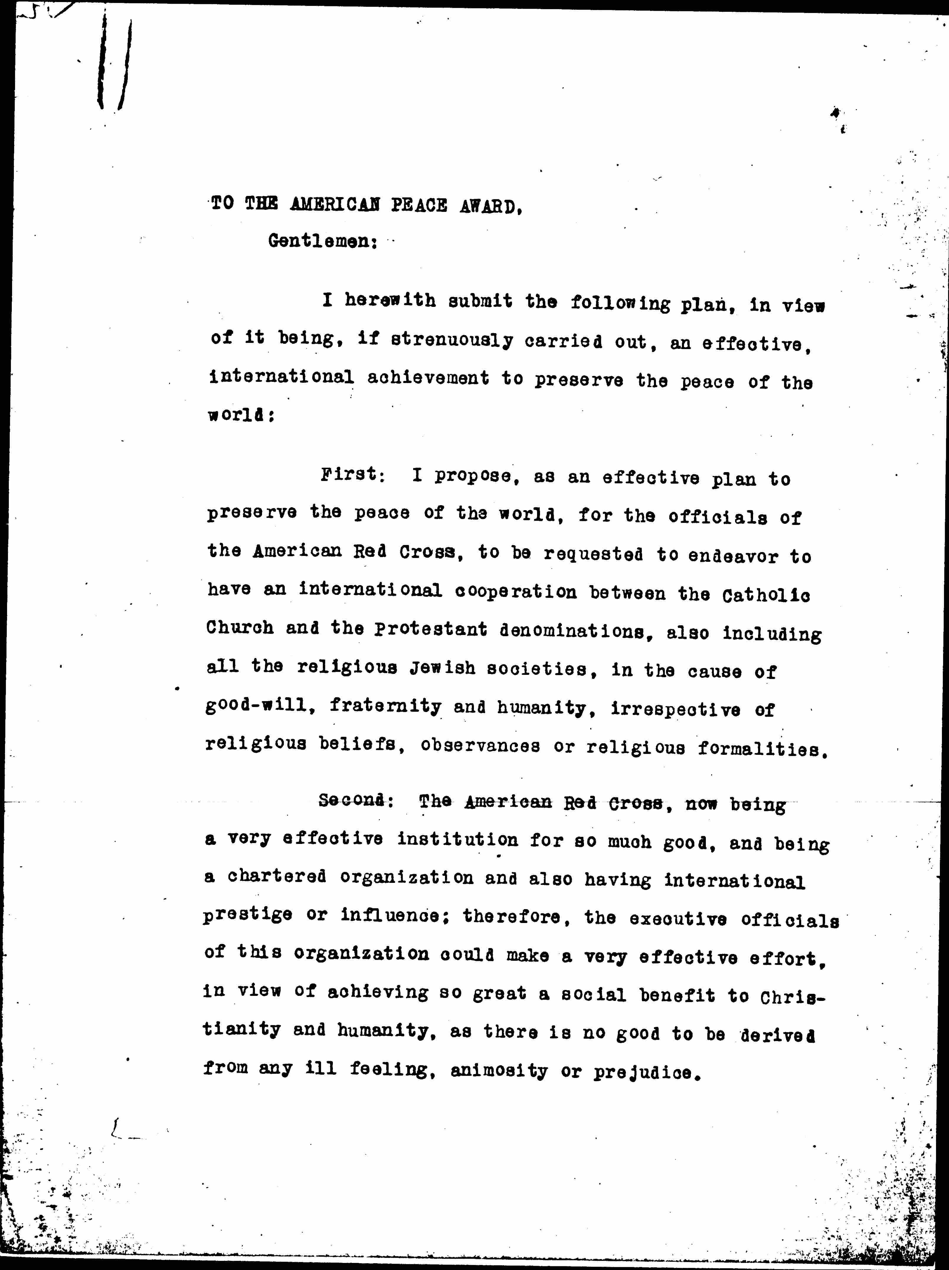 First: I propose, as an effective plan to preserve the peace of the world, for the officials of the American Red Cross, to be requested to endeavor to have an international cooperation between the Catholic Church and the Protestant denominations, also including all the religious Jewish societies, in the cause of good-will, fraternity and humanity, irrespective of religious beliefs, observances or religious formalities.