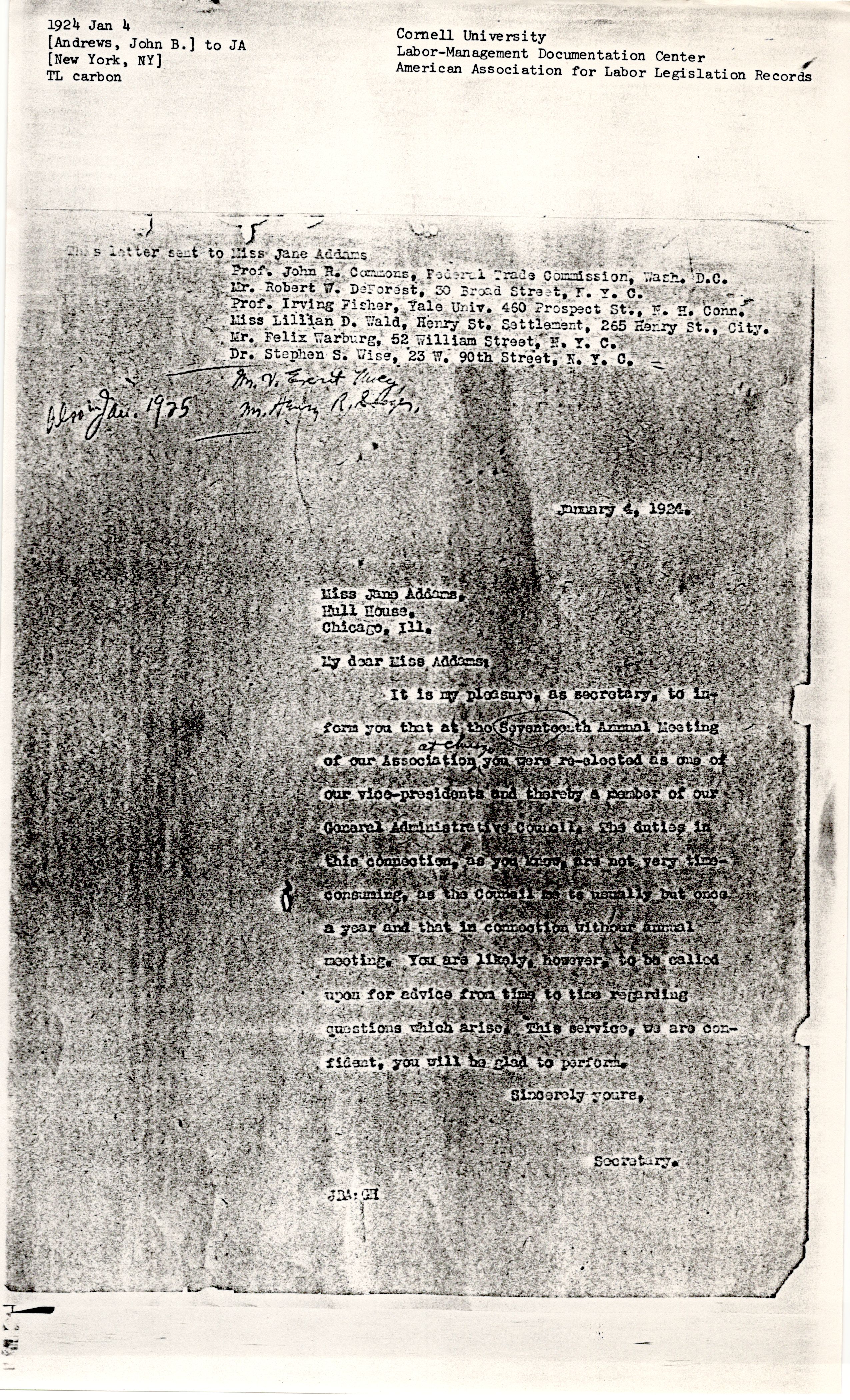 This letter sent to Miss Jane Addams,
