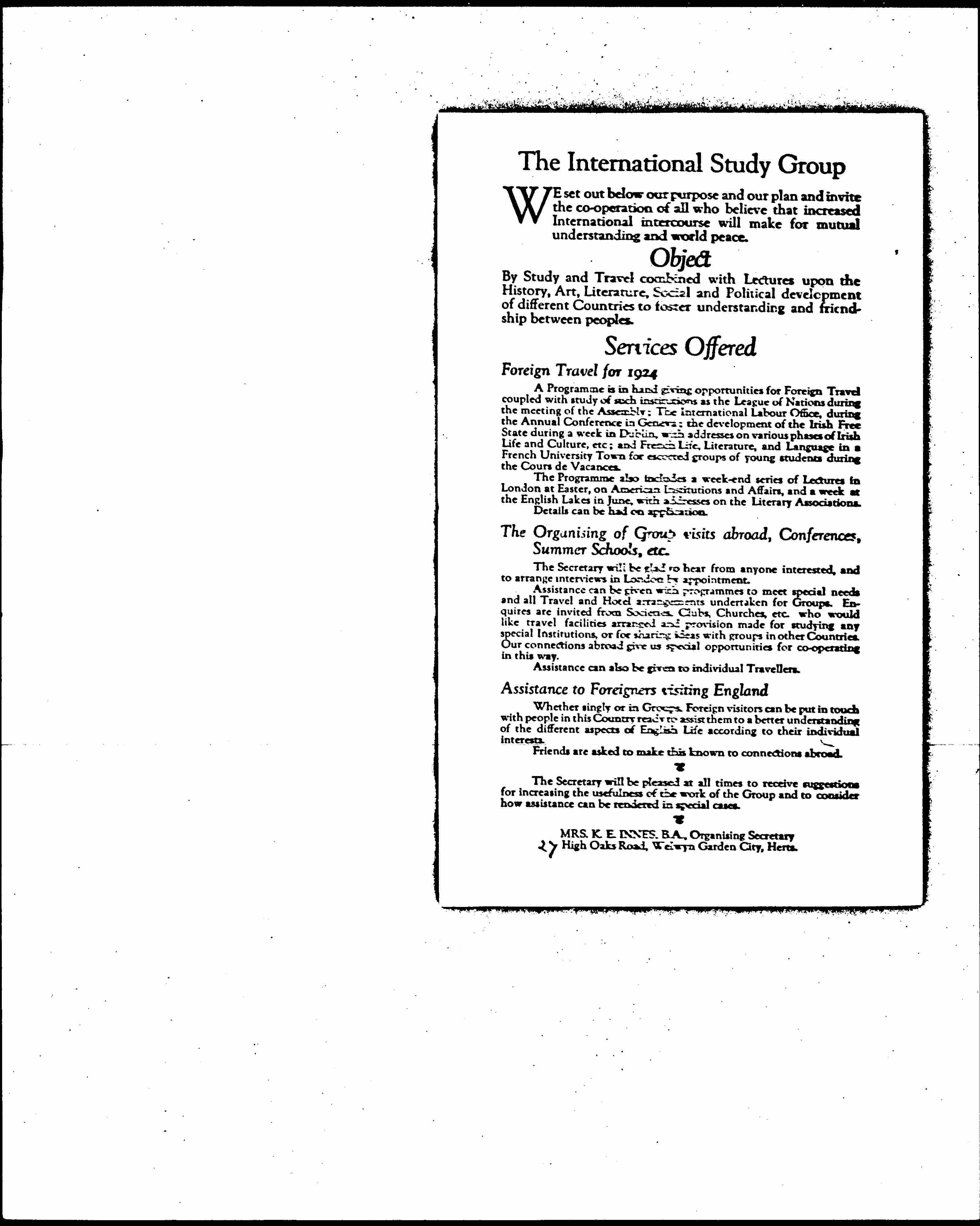 A [Program] is in the hand giving opportunities for Foreign Travel coupled with study of such institutions as the League of Nations during the meeting of the Assembly: The International Labour Office, during the Annual Conference in Geneva; the development of the Irish Free State during a week in Dublin, with addresses on various phases of Irish Life and Culture, etc; and French Life, Literature, and Language in a French University Town for escorted groups of young students during the Cours de Vacances.