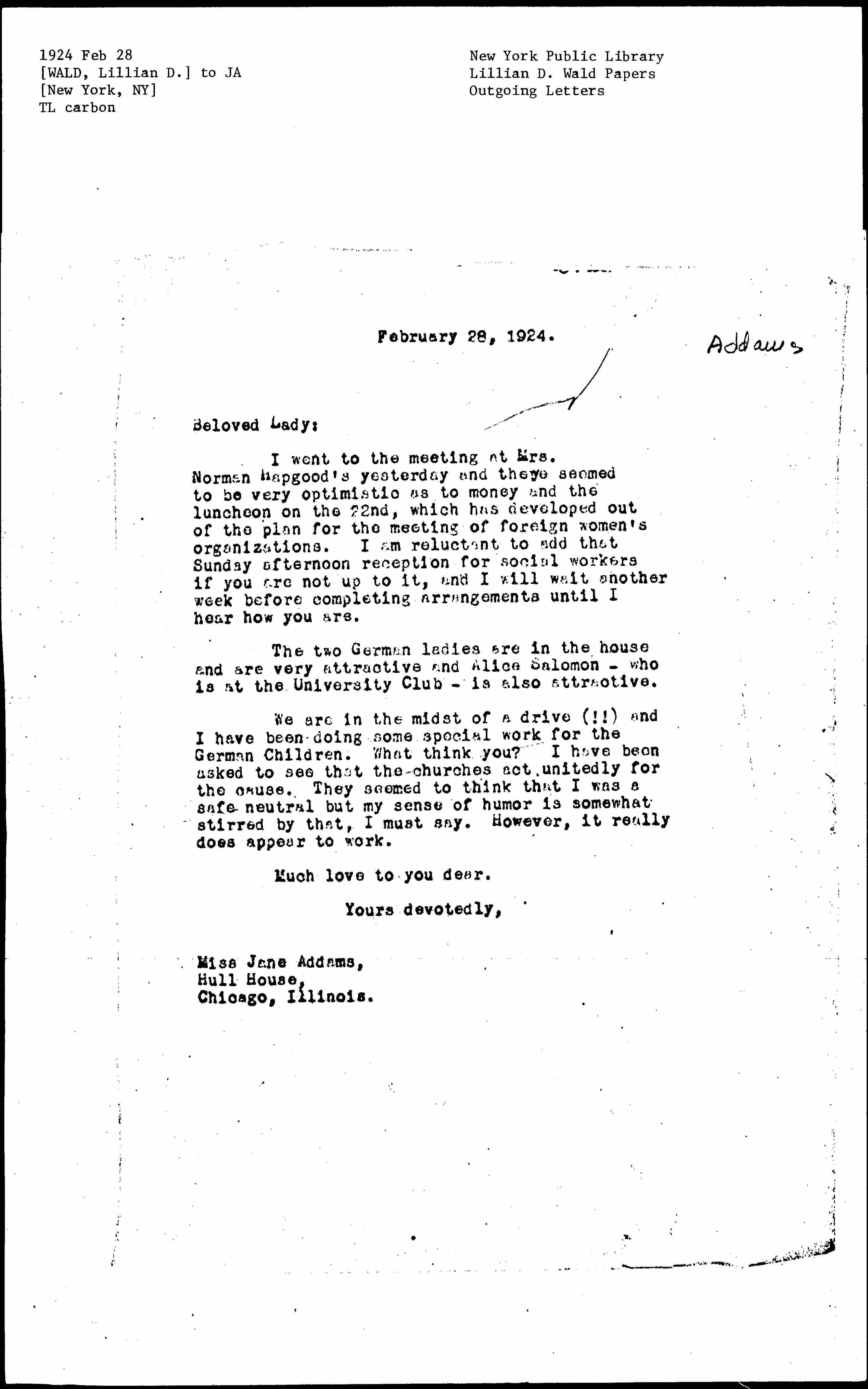 I went to the meeting at Mrs. Norman Hapgood's yesterday and they seemed to be very optimistic as to money and the luncheon on the 22nd, which has developed out of the plan for the meeting of foreign women's organizations. I am reluctant to add that Sunday afternoon reception for social workers if you are not up to it, and I will wait another week before completing arrangements until I hear how you are.